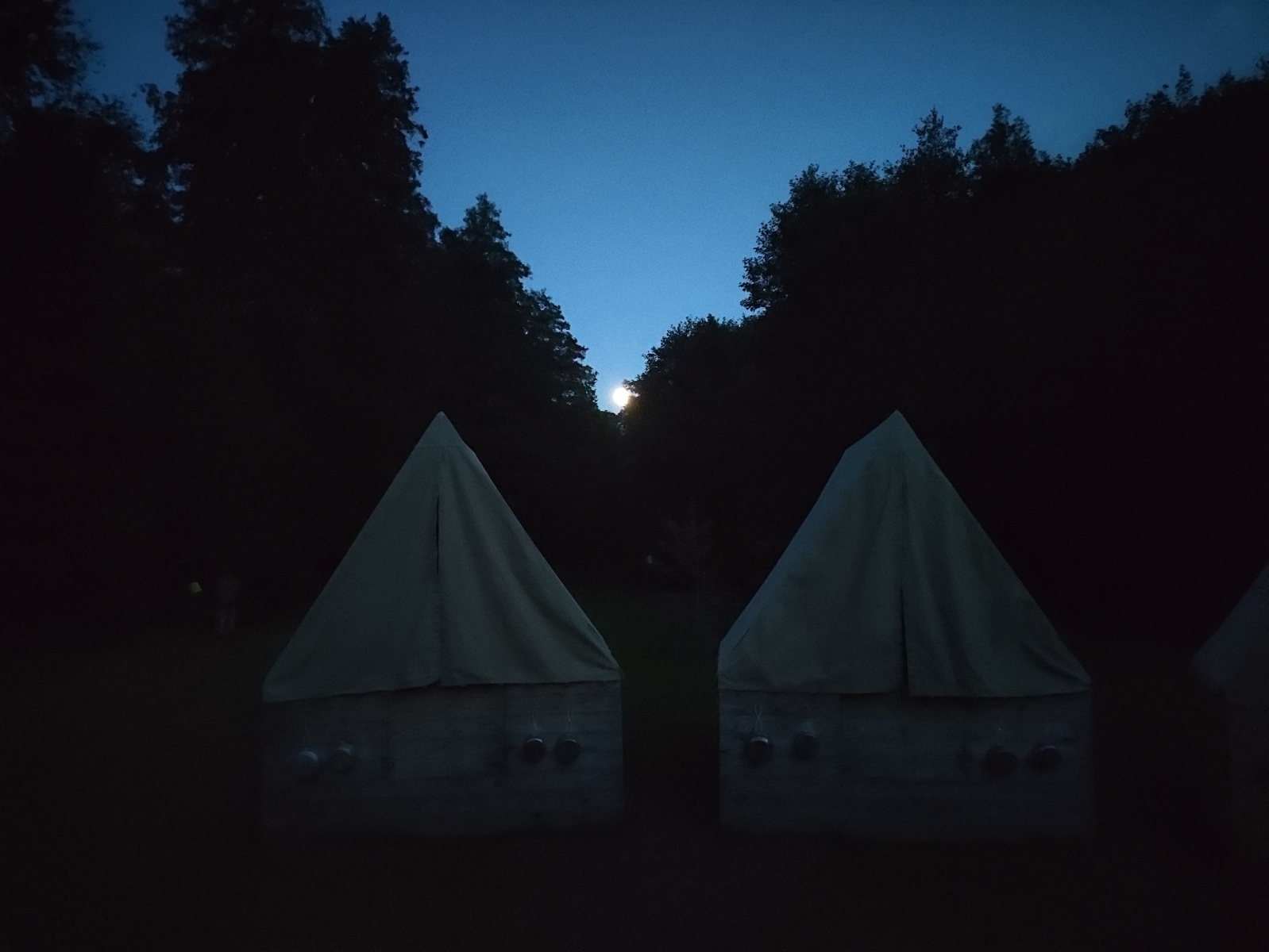 - V klínu stromů za táborovým náměstíčkem jasně svítí měsíc a na tábořiště se vkrádá už docela solidní kosa! Schválně, všimne si někdo, že jsem fotku měsíce již použil??
