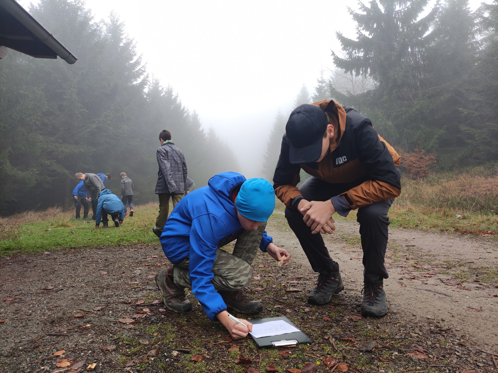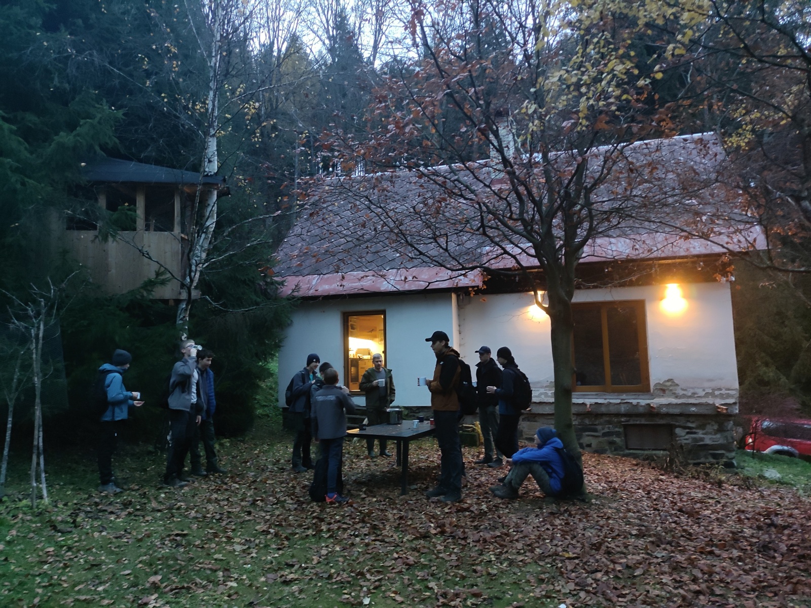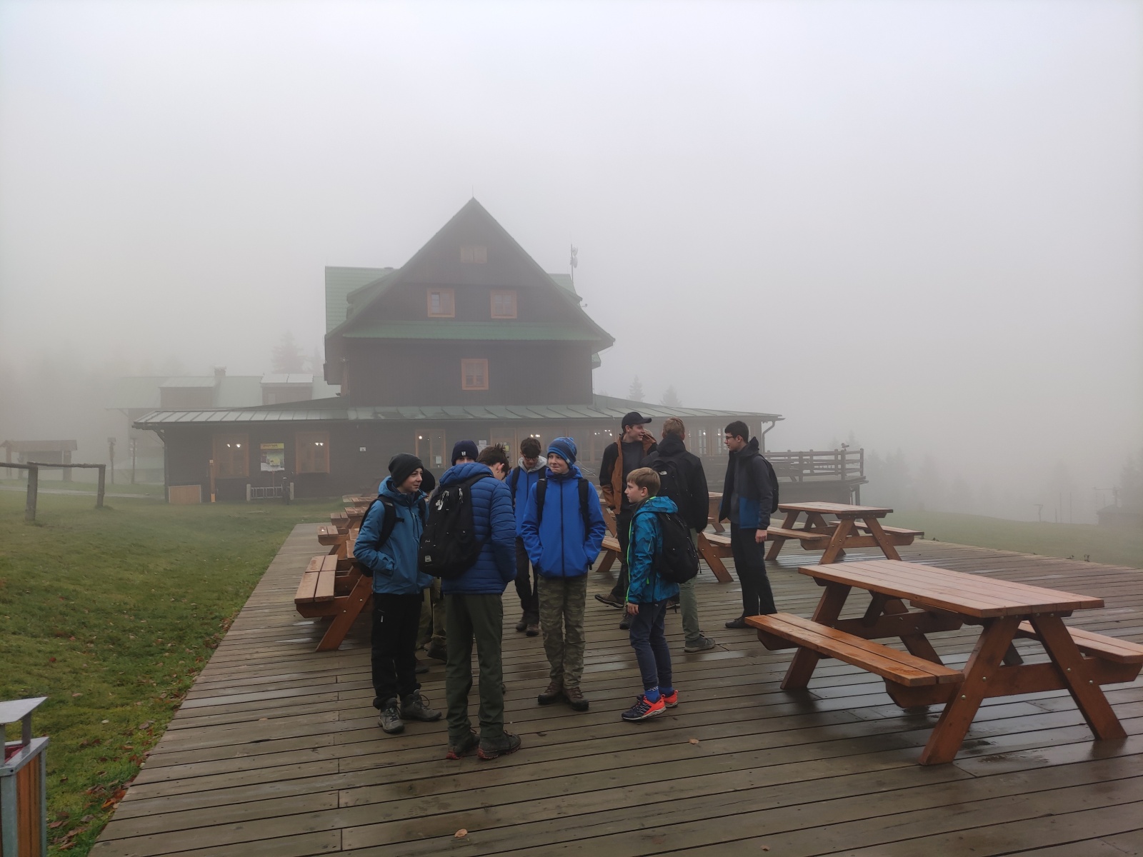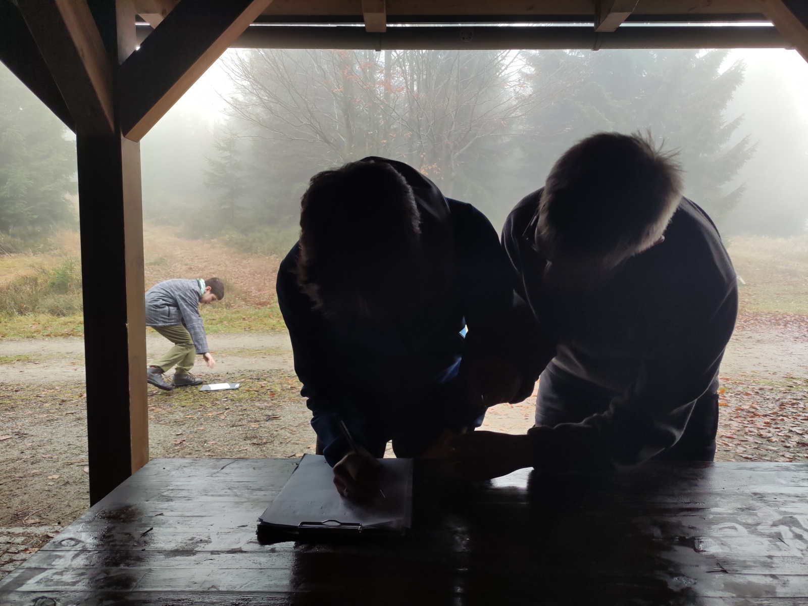 Cestou míjíme tlupu, která musela „urobit prezenčku“. „Pane učiteli, dejte si s námi!“ volali na mě… První zastávku mám v plánu na rozcestí nedaleko Císařské lovecké boudy, kde je velký přístřešek, sloužící jistě i jako útulna. Moc útulno tu ovšem není. Lidi jsou zkrátka prasata. Ale kteří?? První soutěží je sestavení jednoduché zprávy z lístků ve znění „Existují dva druhy náplastí. Ta, která nejde přilepit, a ta, která nejde odlepit.“ Klasický Murphyho zákon! Pořadí R, V, L. Začínám sbírat lístečky. Bez vyzvání mi pomáhají Dan, Pedro a Simon – jsou odměněni známkou! Pokračujeme k cíli nějakých dva a půl kiláčku. Kurnik šopa, tady je lidu! Fronta na jídlo až ven, stoly obsazené. Nejprve čekáme venku a po zhruba půlhodince se situace zlepšila. Dokonce si sedáme k jednomu většímu stolu. Jen Pedro čeká u výdeje jídla. Objednal si Bláznivé mumie z Halloweenského menu. Nakonec na ně čekal čtyřicet minut!