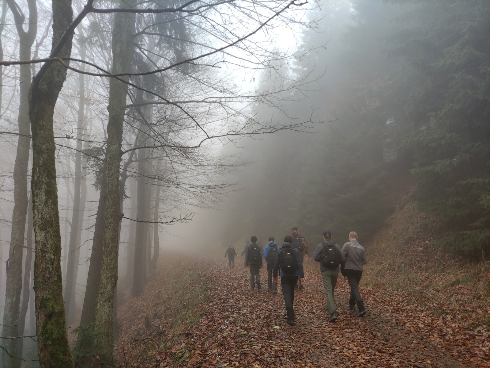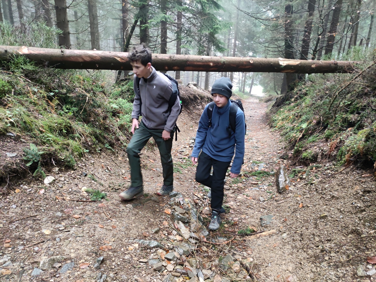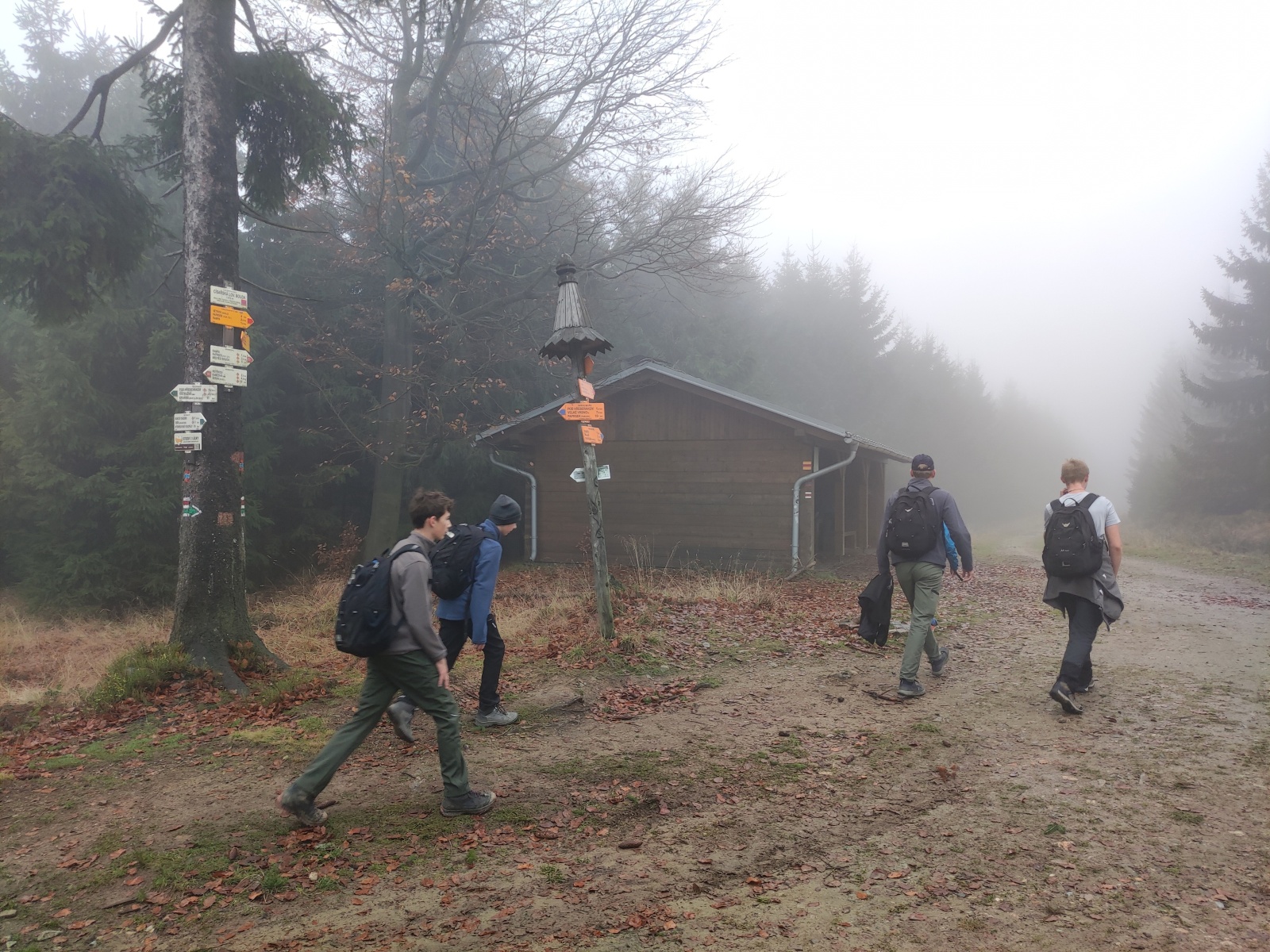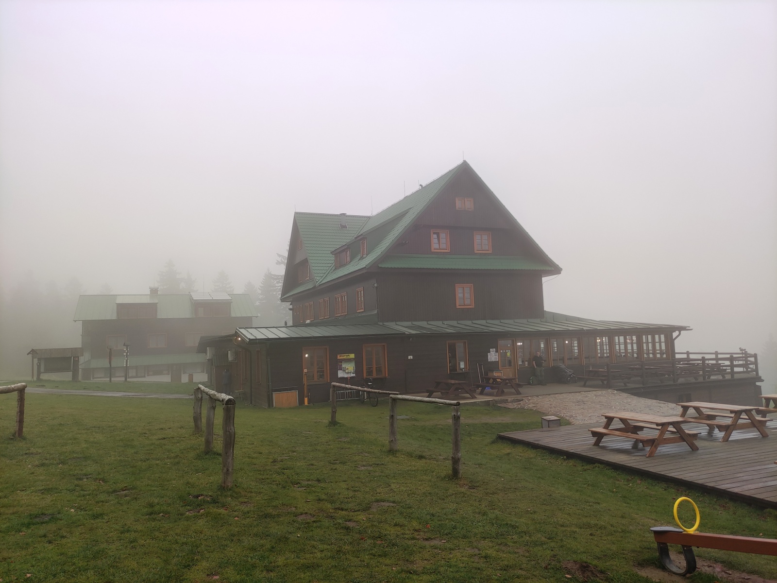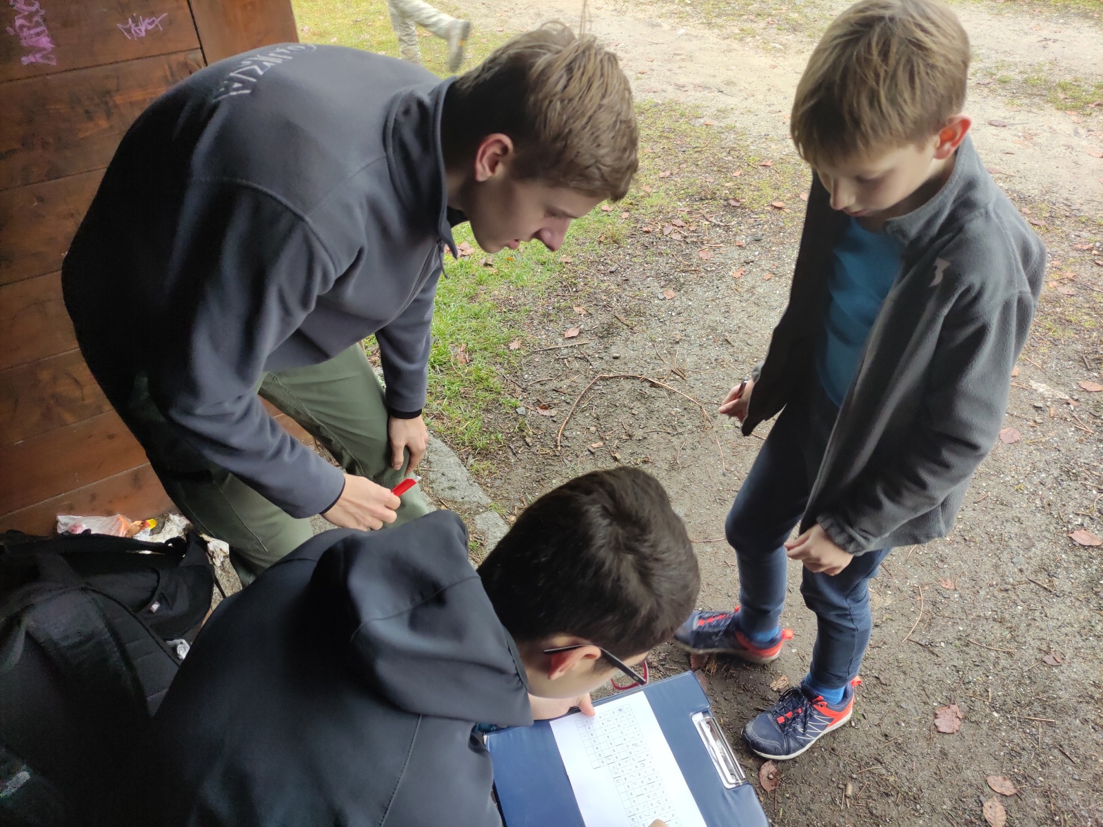 Cestou míjíme tlupu, která musela „urobit prezenčku“. „Pane učiteli, dejte si s námi!“ volali na mě… První zastávku mám v plánu na rozcestí nedaleko Císařské lovecké boudy, kde je velký přístřešek, sloužící jistě i jako útulna. Moc útulno tu ovšem není. Lidi jsou zkrátka prasata. Ale kteří?? První soutěží je sestavení jednoduché zprávy z lístků ve znění „Existují dva druhy náplastí. Ta, která nejde přilepit, a ta, která nejde odlepit.“ Klasický Murphyho zákon! Pořadí R, V, L. Začínám sbírat lístečky. Bez vyzvání mi pomáhají Dan, Pedro a Simon – jsou odměněni známkou! Pokračujeme k cíli nějakých dva a půl kiláčku. Kurnik šopa, tady je lidu! Fronta na jídlo až ven, stoly obsazené. Nejprve čekáme venku a po zhruba půlhodince se situace zlepšila. Dokonce si sedáme k jednomu většímu stolu. Jen Pedro čeká u výdeje jídla. Objednal si Bláznivé mumie z Halloweenského menu. Nakonec na ně čekal čtyřicet minut!