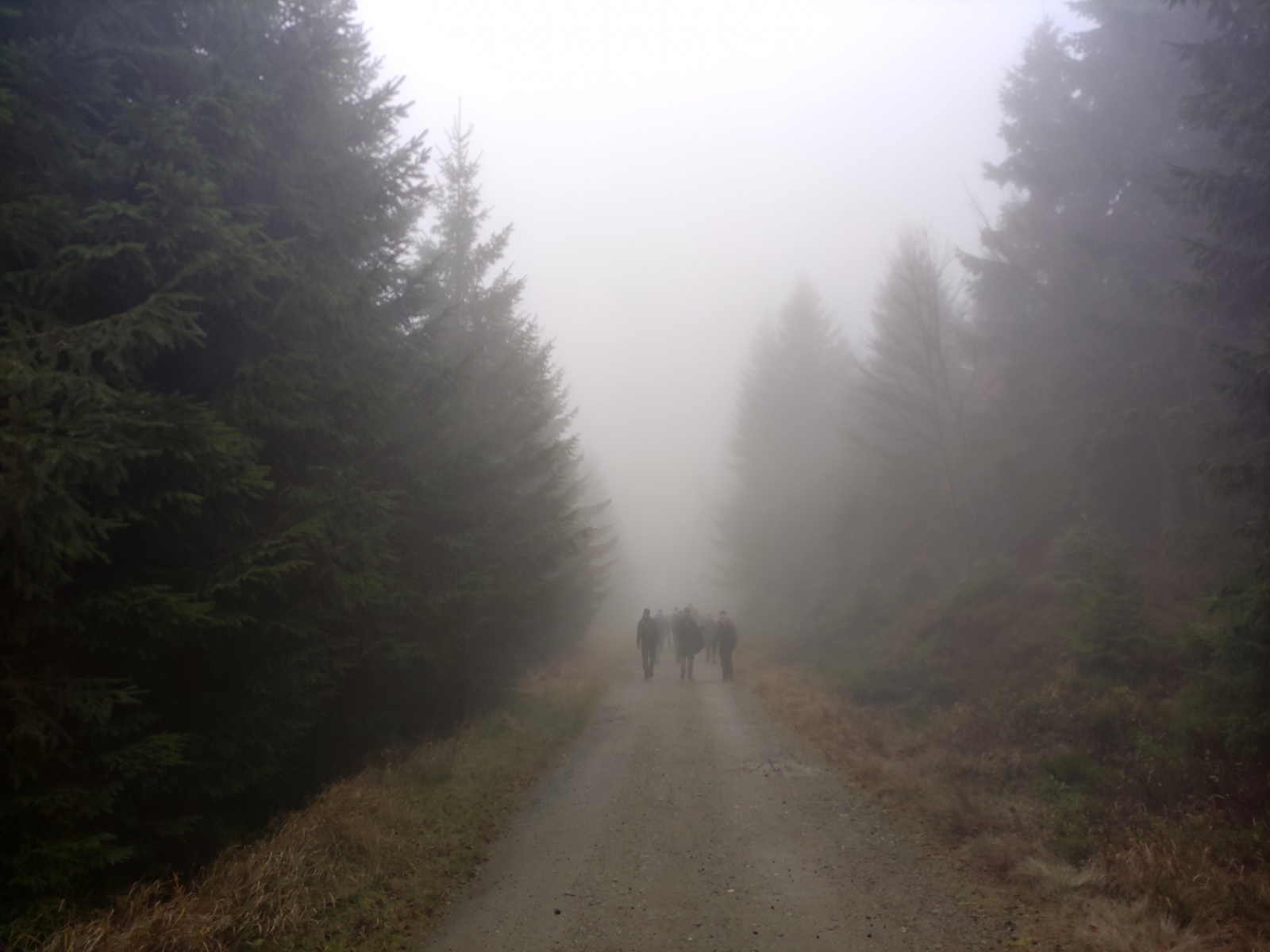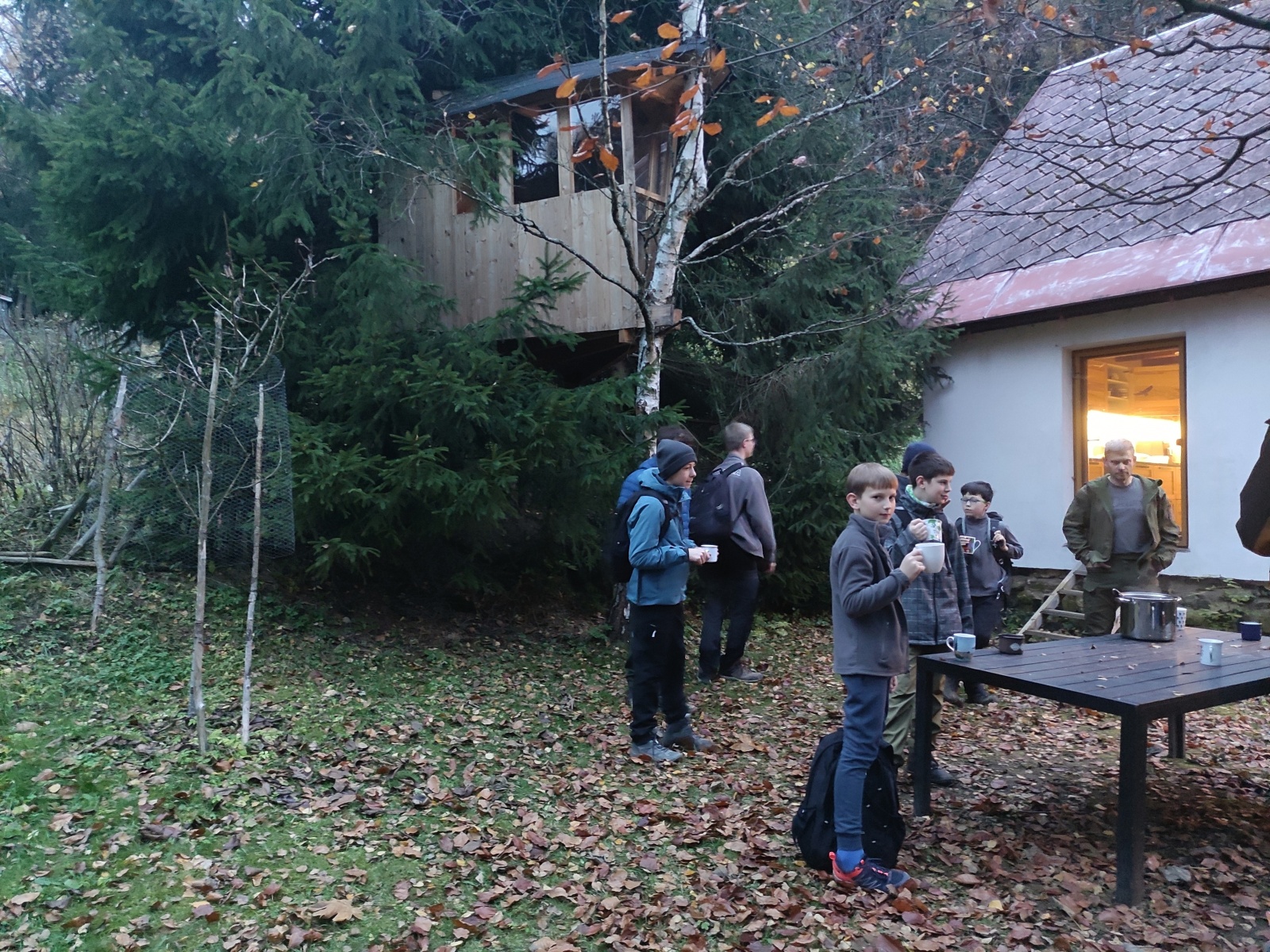 Část cesty zpět je shodná až k útulně. Mlha se lehce zvedla a spatřujeme Dalimilovu rozhlednu na kopci Větrov. U útulny chvíli setrváme. Nejprve družiny hledají dominovou zprávu: „Na svatého Izáka první vrána zakráká“. Chtěl bych vidět můj výraz, když sem zjistil, že Vydry a Rysi dosáhli stejného času 8:42. Lišákům luštění trvalo o něco déle. Stolečků v útulně využíváme a rozdávám lístečky se čtvrtým kolem Radistické olympiády. Letos dokončíme loni započatý příběh Dobrodružství v Zemi nikoho. Se zprávou „Odpoledne byli pak všichni u Pepína.“ Si borci poradili v tomto pořadí: 1. Pedro, 2. Kroky, 3. Simon, 4. Sevak, 5. Theo, 6. Paolo, 7. Maty, 8. Scott, 9. E.T., 10. Dan, 11. Nerez a 12. Kryštof. Balíme a vyrážíme dál, dolů po zelené. Míjíme Císařskou boudu a za necelou půlhodinku jsme na chatě u Lebedů. Hrnec s čajem je již sundán z plotny, jen se doslazuje a už se ne nese k venkovnímu stolu spolu s mnoha hrníčky. Kromě chaty a jejího umístění nás zaujal luxusní domeček na stromě. Prý by tam nouzově přenocovaly tři osoby! To už je solidní šero. Do Ostružné dorážíme už za úplné tmy! Jízda vlakem pak utekla v dobré náladě jako nic, včetně přepřažení lokomotivy na elektriku v Zábřehu…