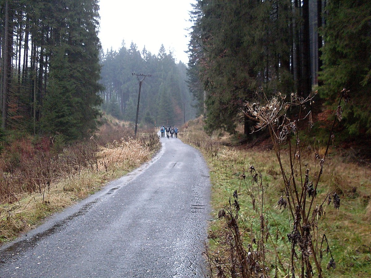 Z mlhy se vynořují dvě postavy s velikým černým psem. Nechci se ptát, zda nepotkali tlupu usmrkanců. Docházím k rozcestníku pod hotel Bílý Kříž. Stojím pod stromem s rozhodnutím, ještě chvíli počkat. A vyplatilo se. Z mlhy proti mně běží jiný pes, packy mu ťapkají na mokrém asfaltu a on… je to Sir. Po chvíli si vyzvedávám oddíl před Sulovem. Sir si zde ještě něco vyřizuje s domorodým psem a hoši jsou překvapeni, že nepůjdeme dovnitř. Máme fůru času, podnikneme vlastivědnou vycházku. A snad i něco pojíme.