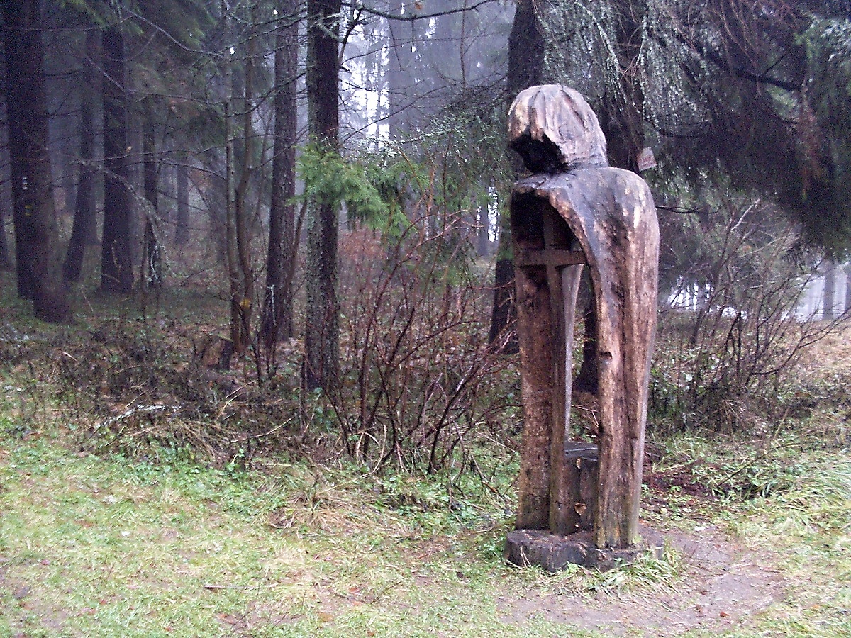 Uff! Jako duch se z mlhy vynořuje vysoká, zakuklená postava dřevěného rytíře. Nikdo tu není. Jsem zde sami. Na druhé straně cesty je rozcestník. Hvízdám na píšťalu, nikdo se mi neozývá. Což jestli se oddíl vydal kolem dřevěného kříže dál po žluté značce na Visalaje? Rozumu na to mají hoši dost! Děj se vůle páně. Pokračuji po zelené k hotelu Sulov. A přemítám!