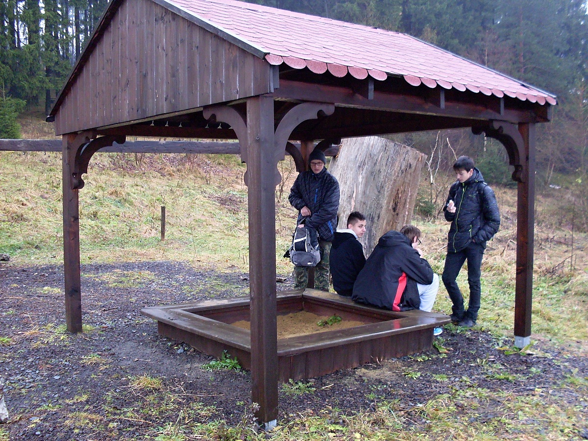 Přecházíme louku, kudy se před II. světovou válkou prchalo z „Protektorátu“ a míříme si to k hotelu Bílý Kříž. „Jé, dětské hřiště. A hompačky!“ Odkládáme loapy na lavičky, starší obsazují kryté pískoviště. Nač? Už neprší a lavičky jsou stejné mokré, jako ty venku vedle dračí hlavy. Přemýšlím, co bychom si zde zahráli. Nějakou úpolovou hru, spojenou s během, plížením a taktizováním. Světe div se. Volíme úplně tu nejobyčejnější – „na schovku“. Starší jsou zaraženi. Domnívají se, že si z nich dělám legraci. Ale když jdu jako první na „pikolu“, ráznými kroky se odebírají do úkrytů. Po první hře musím ozřejmit pravidla. Není žádoucí, aby se Švejk, Páťa, či Júňo, pohybovali v půlkilometrové vzdálenosti v lese. Hrajeme asi šest her. Škoda jen, že je mokro. A tak se nedá schovat do trávy, či vyšplhat na kusy kmenů zasazených do země. Dalmi si namočil tepláčky, když si lehl na střechu altánku. Jiní borci byli odhaleni v okamžiku, kdy se nad atikou garáží hotelu objevila černá psí hlava. Bylo zřejmě, že na střeše není Sir sám. Nechycení získávají známku. (Zasloužil bych si dvě!) Ještě nějaké „fotéšky“ do památníčku a zvolna se přesouváme k Sulovu.