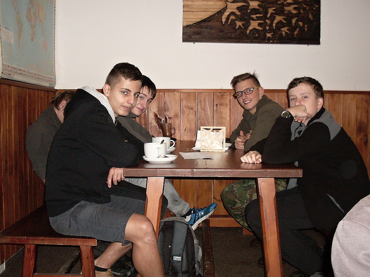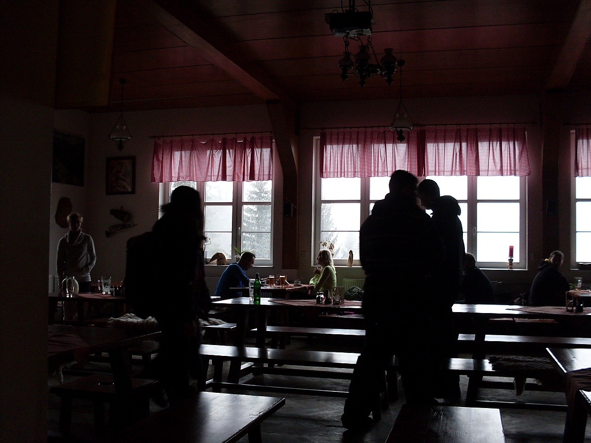 Hoši si dávají čaj, ne všichni, škudlí (připomenu později). Polévku si přináší pouze Sysel – čirou kulajdu. Chata se postupně začíná zaplňovat. Jsou zde rodinky s dětičkami – k dispozici je dětský koutek, staří horalé sedící před krbem přikládají několik špalků a zvedají se k odchodu. Jejich místa obsazuje jiná velká skupina mladých lidí. Doráží i parta mládenců ověšena kletry. Ukládají je ke sloupům a věší si nad ně své bundy. Jé, věšáky! „Dalmi, ukaž mi jednoho jediného člověka, který má na sobě tepláčky!“ A Dalmi mi ukázal. Toho dědu, co přišel z kuchyně, kde vaří a sedá si k rodince známých. Odehráváme třetí úsek radistické olympiády a pár hříček na známky. Máme ještě fůru času, ale chlapce to táhne ven.
