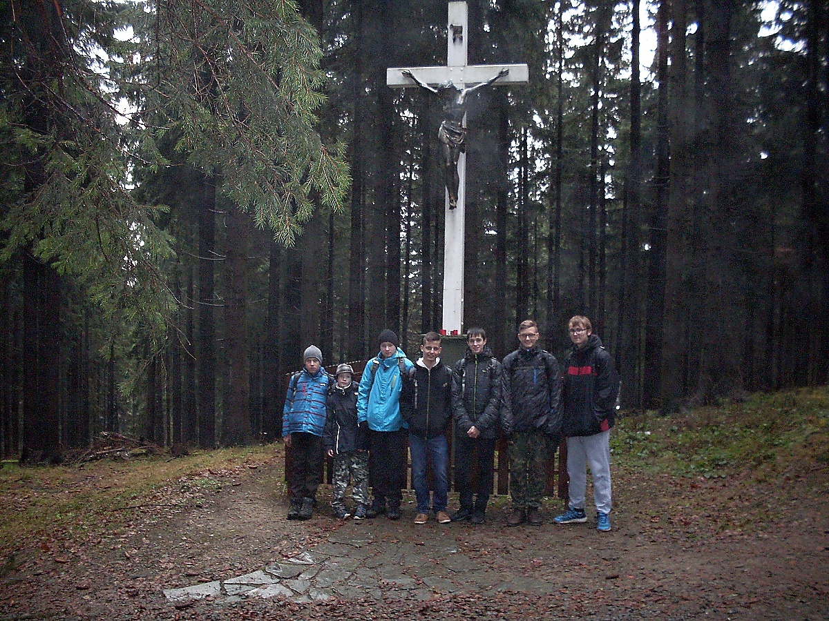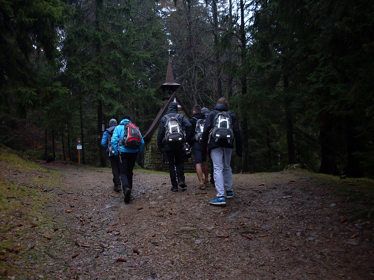 Stoupáme po louce k hotelu Kysuca (Baron*), stojí už na slovenské straně hranice, do lesa ke kapličce. Vítr lehce pofukuje, tak mi to připadalo, když jsme kráčeli po louce. Ale zde v lese už duje. Kaplička se zjevuje z příšeří černého lesa, ne nepodobna stavení z nějaké pohádky. Páťa Cedric usuzuje, že by bylo vhodné si obléci už dlouhé kalhoty a tajně prchá za kapličku, aby se převlékl. Tak jsme ho v jeho snažení vyfotili. (Páťa bude churavý!)