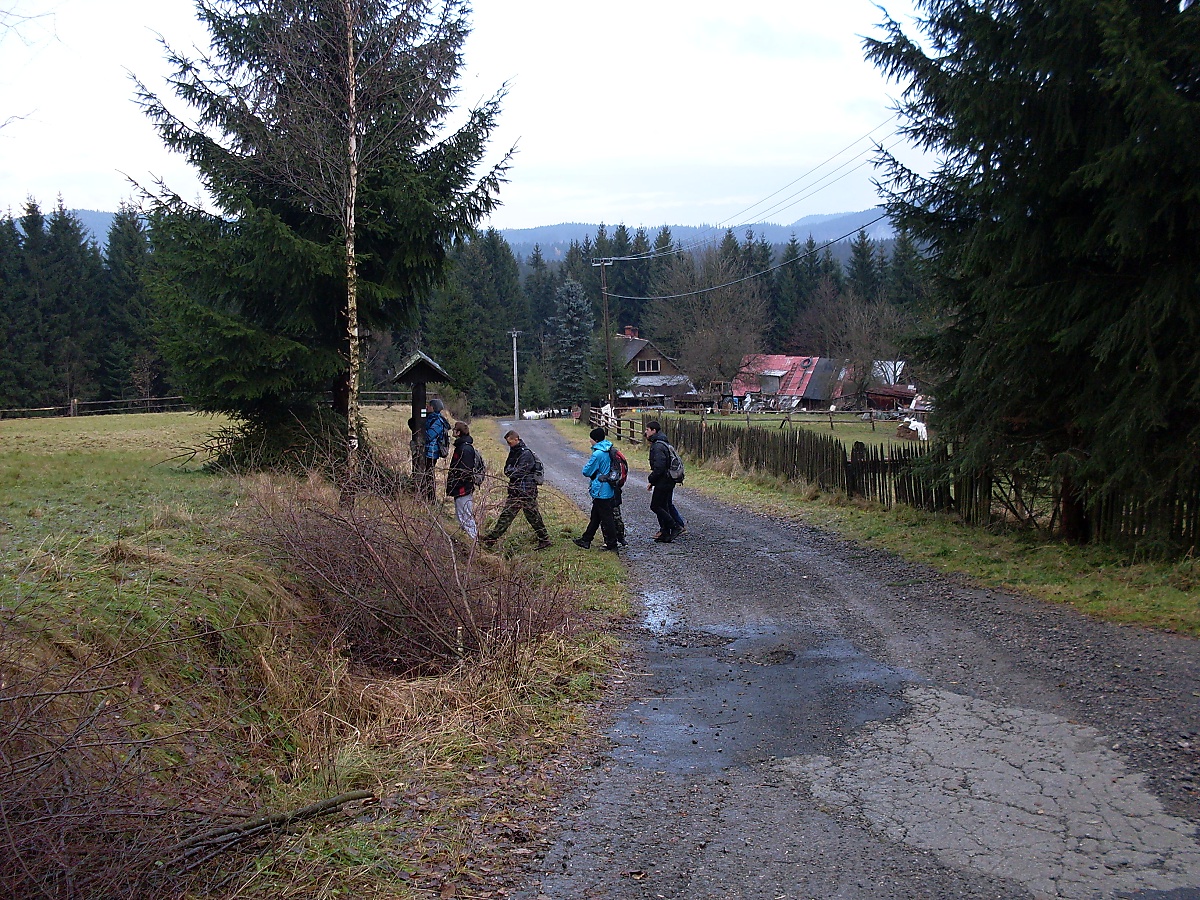 Scházíme kouzelným lesem, kde kdysi byly rozházeny zaváté stopy ve sněhových závějích, k „novému“ hotelu. Ale ještě synky stahuji k pomníčku Josefa Adama. Padl zde ve čtyřicátém sedmém v boji s Banderovci**. Ještě není půldruhé hodina po poledni, když se zvolna vydáváme dolů do údolí, k Bebkům. Ale na rozcestí, kde stále stojí mlčenlivý „nazgûl“, ještě kousek pokračujeme k cíli dnešního putování – k legendárnímu „bílému kříži“.