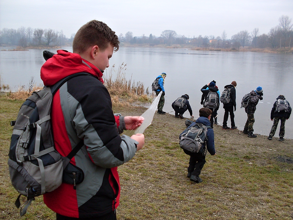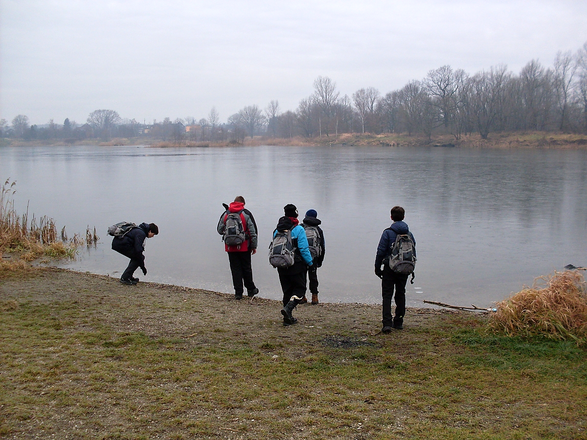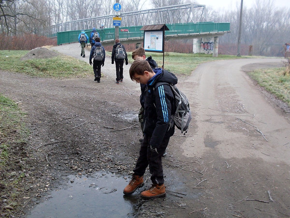 Sestupujeme k vodní hladině rybníka Mžikovec. Dětičky jsou fascinovány zamrzlou plochou. Rozbíjejí led a vytahují jeho kusy, ty praskají jako tabule skla, jako v „maincraftu“. Shrek si chce vzít střep domů. Následně se vystřelují kamínky po ledě, soutěží se komu pojede dál. „Neházejte tam dřevo!“, upozorňuji, a už vidím, kterak Mates zápasí s větví silnou jako moje noha. Tak to ne! Konec radovánek. A valíme si to dál.