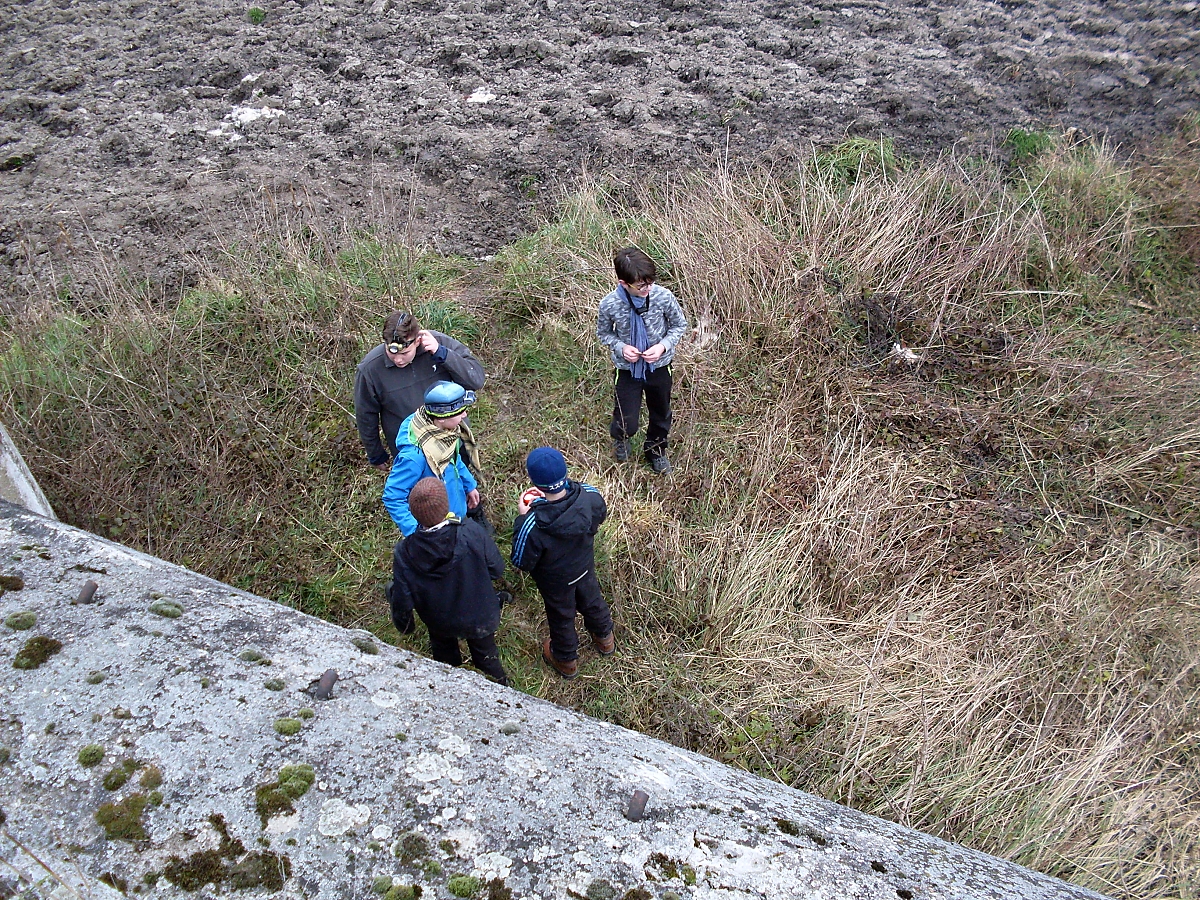 Napravo od náspu dálničního mostu je mezi stromy ukryt další objekt. Průzkumníky to okamžitě táhne k diamantovým příkopům. Ten nalevo je zatopen, příkop napravo proložen padlými větvemi. Už po třetí se odstrojujeme a zpola zazděným vchodem se soukáme dovnitř. Mates má celou dlaň pokapanou voskem. A další výtečníci se po něm samozřejmě opičí.