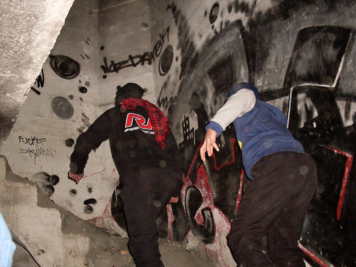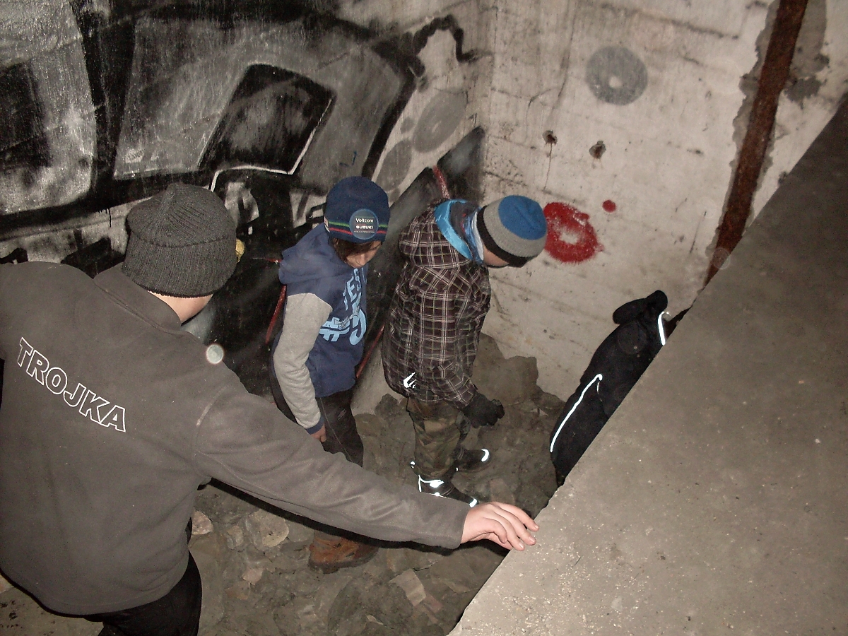 Směrujeme do remízku, co ukrývá nezahrnutý protitankový příkop a dál až přímo ke srubu, co stojí těsně vedle svodidel dálnice D1. Sobík mi přibíhá oznámit, že vchod je úplně zazděný. Obcházíme bunkr a na stromy rozvěšujeme loapy a svršky. Vnikáme dovnitř odstřelenou zvonovou věží. Mnohým se rozsvítilo. varuji je, ať nechodí dál, protože v další místnosti je nezadeklovaná studna, kam nám spadli Evans a za další dva roky Vendy. Naštěstí ve studni přibyly další vrstvy úlomků betonu a cihel.
