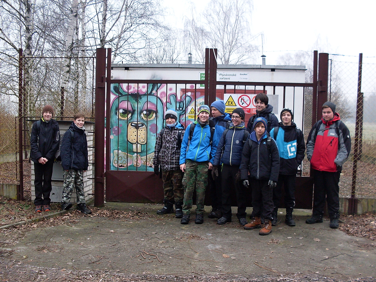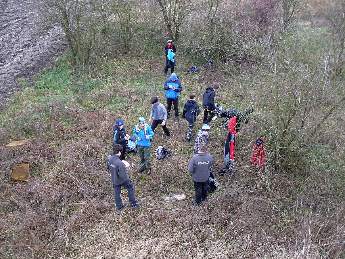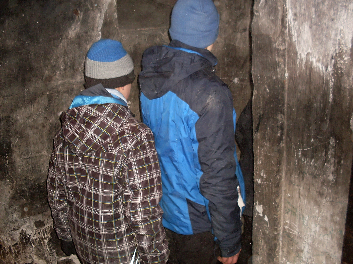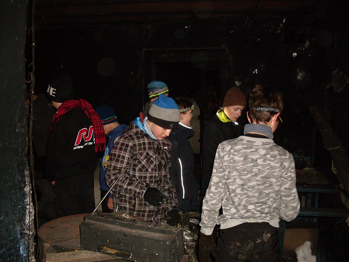 Ploužíme se po oranici zmrzlého pole, ještě že tak. Ale přesto se několik výtečníku dokázalo dokonale „zaprasit“. A jsme v cíli naší cesty. Celé okolí srubu je zarostlé suchými stonky kopřiv. Odkládáme loapy, bundy. Z batohů se dolují čelovky a hurá na průzkum.