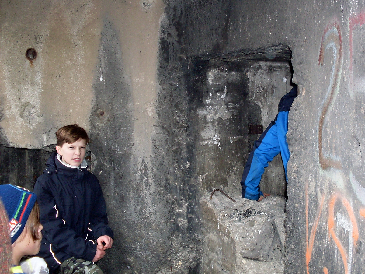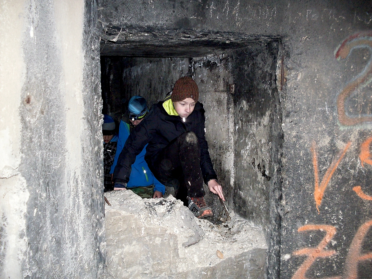 Ale ouha. Séba a Startér čelovky nemají, Vítkovi se „vysvítila v batohu“ a Matesovi také nefunguje. Nu, což? Procházíme všechny místnosti jednopodlažního objektu. Od naší poslední návštěvy před dvěma roky, kdy se zde konala vzpomínková akce v režii „bunkráků“, zůstaly tady na stěnách místností nalepeny cedulky s označením k čemu ta, či ona místnost sloužila. Tak si to všechno pěkně procházíme, prohlížíme a míříme ven. Několik slov o betonáži objektu (včera to bylo přesně 82 let), a je vyhlášen oběd.
