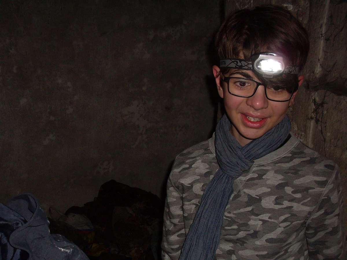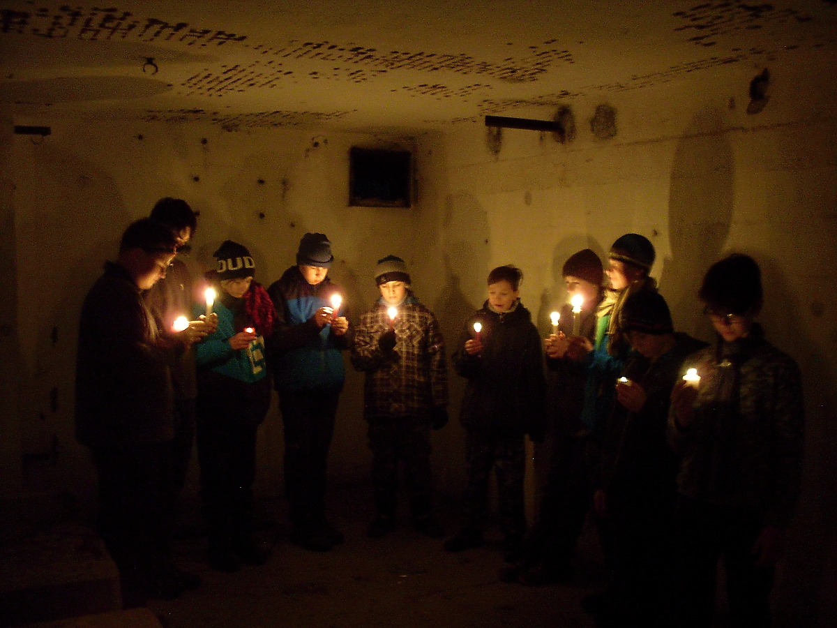 Ještě jednou se vracíme do objektu. Čelovky nebudeme potřebovat. Každý si nese svíčku. U vchodu snaživí Sobík všem zapaluje knoty, protože má na to speciální zapalovač, co mu mnozí závidí. Snažíme se v první místnosti pořídit „adventní fotografii“, což s mým přístrojem bude po čertech těžké. Také to tak dopadlo. Hoši nejsou schopni nevrtět se a dívat se pouze do světla svíčky. Mates všem ukazuje, jak si kape žhavý vosk na druhou ruku. Je to paráda. Za chvíli budeme všichni od vosku a stopy svíček ponese i náš oděv. Balíme batohy, oblékáme bundy. Kontrola tábořiště. A přes oranici míříme na starou pevnostní cestu. Kousek se vracíme a přes pole míříme přímo k „sedmičce“ objektu MO-S 7 – Antošovice.