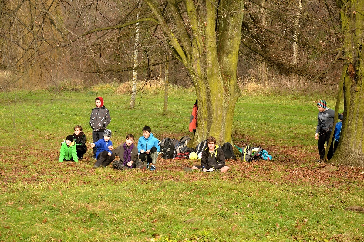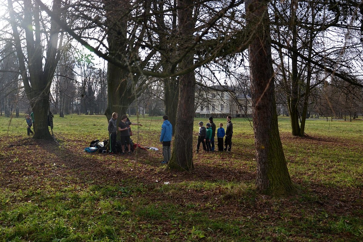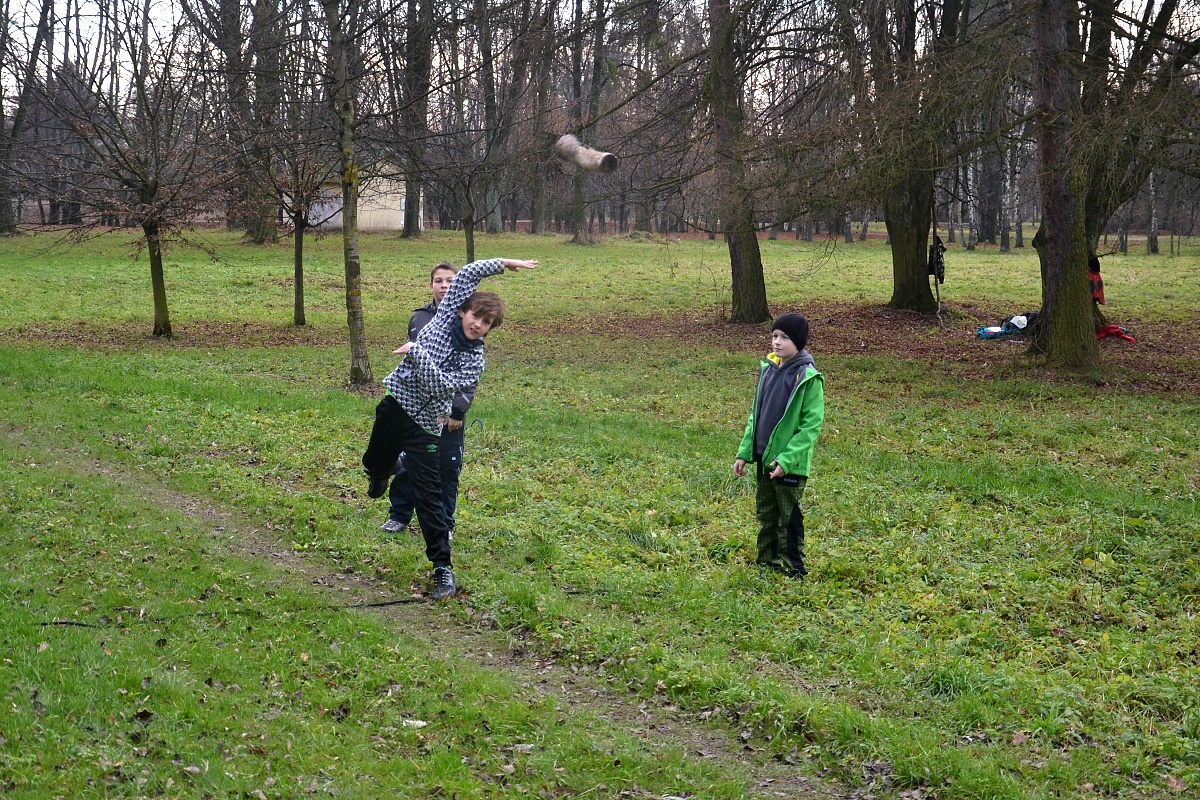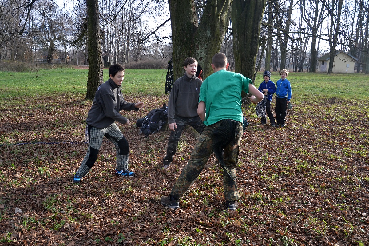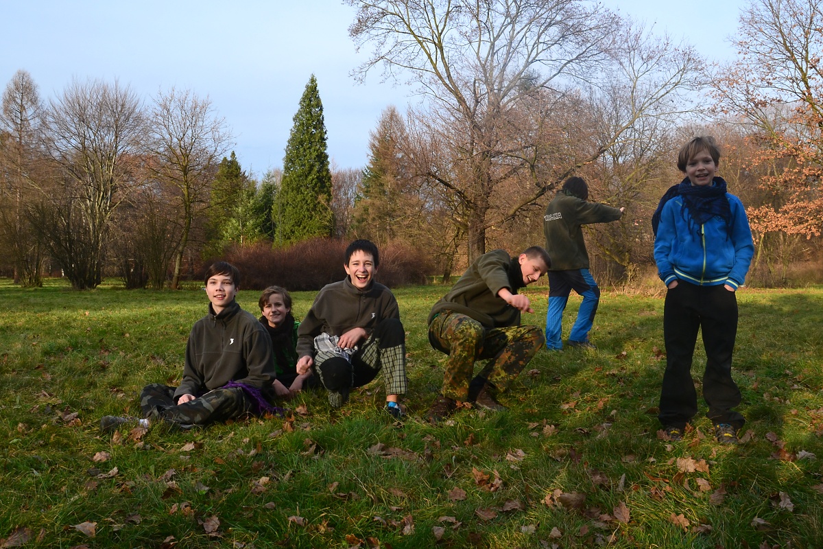 Tak tak jsme to podzimní rodeo stihli, a když se podíváte na přiložené snímky, kde místo sněhu je svěže zelený travník s koberci zlatého listí a slabé zimní slunce kreslí na kůře kmenů staletých stromů pitoreskní stíny, ani vám na mysl nepřijde, že se odehrávalo v polovině prosince. Snad byla na vině lapálie kolem klubovny, o kterou jsme přišli posledního října, snad byla na vině má vytíženost v práci. Každopádně jsme se na RODEO nijak nepřipravovali a první (nebo poslední?) volný termín jsme naplnili soutěžemi mezi družinami.
