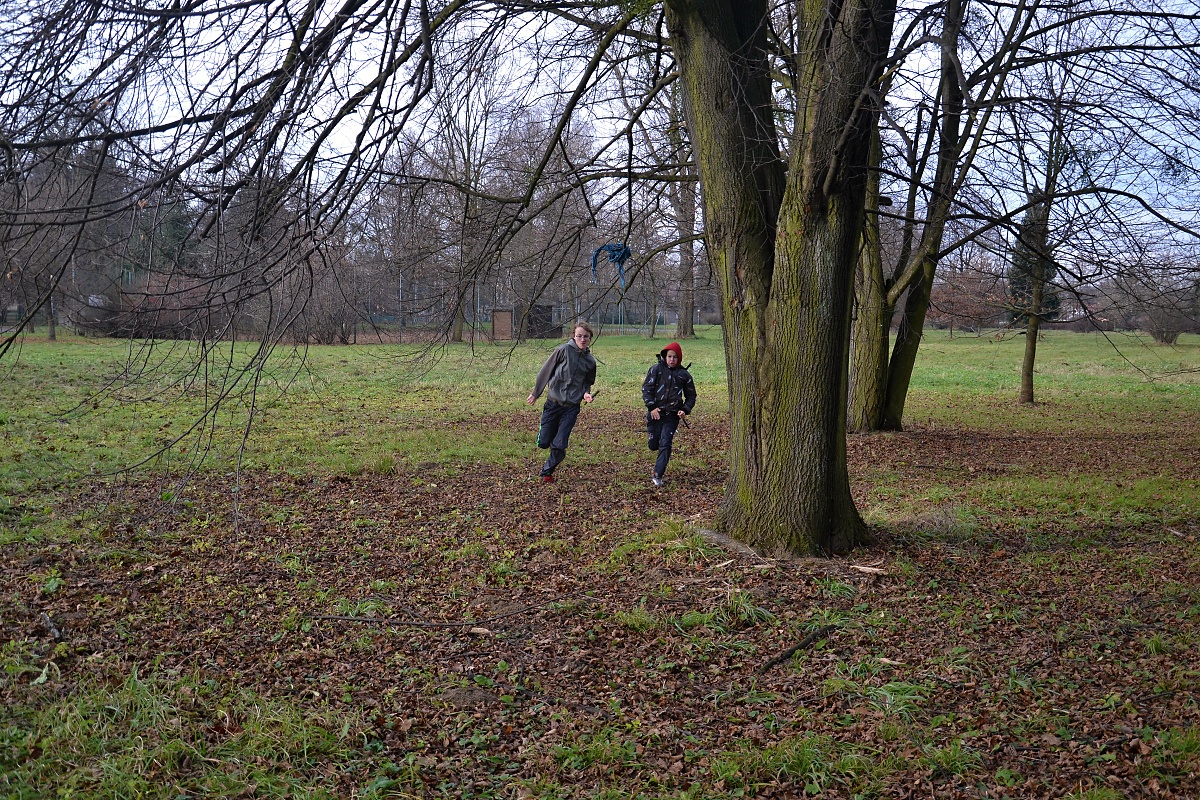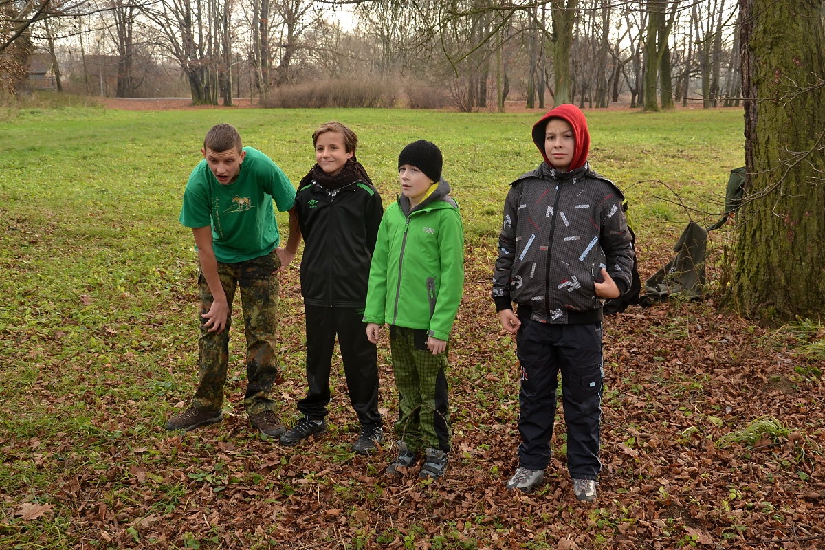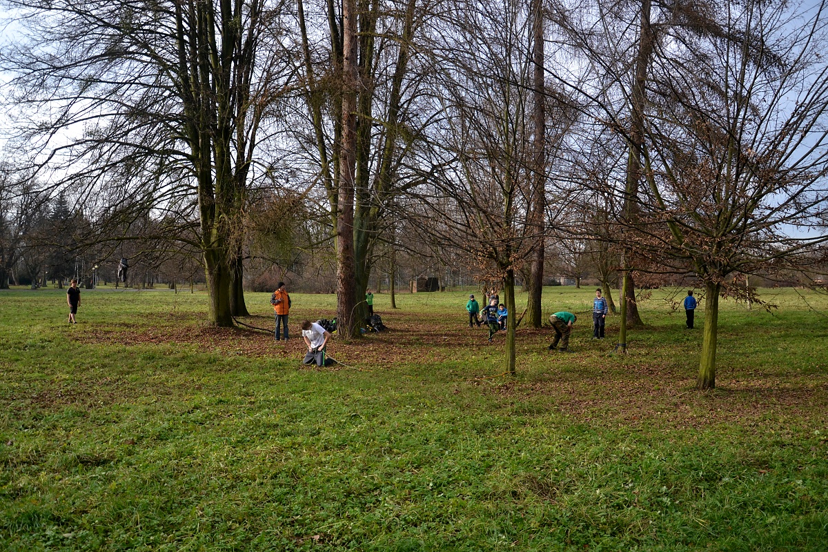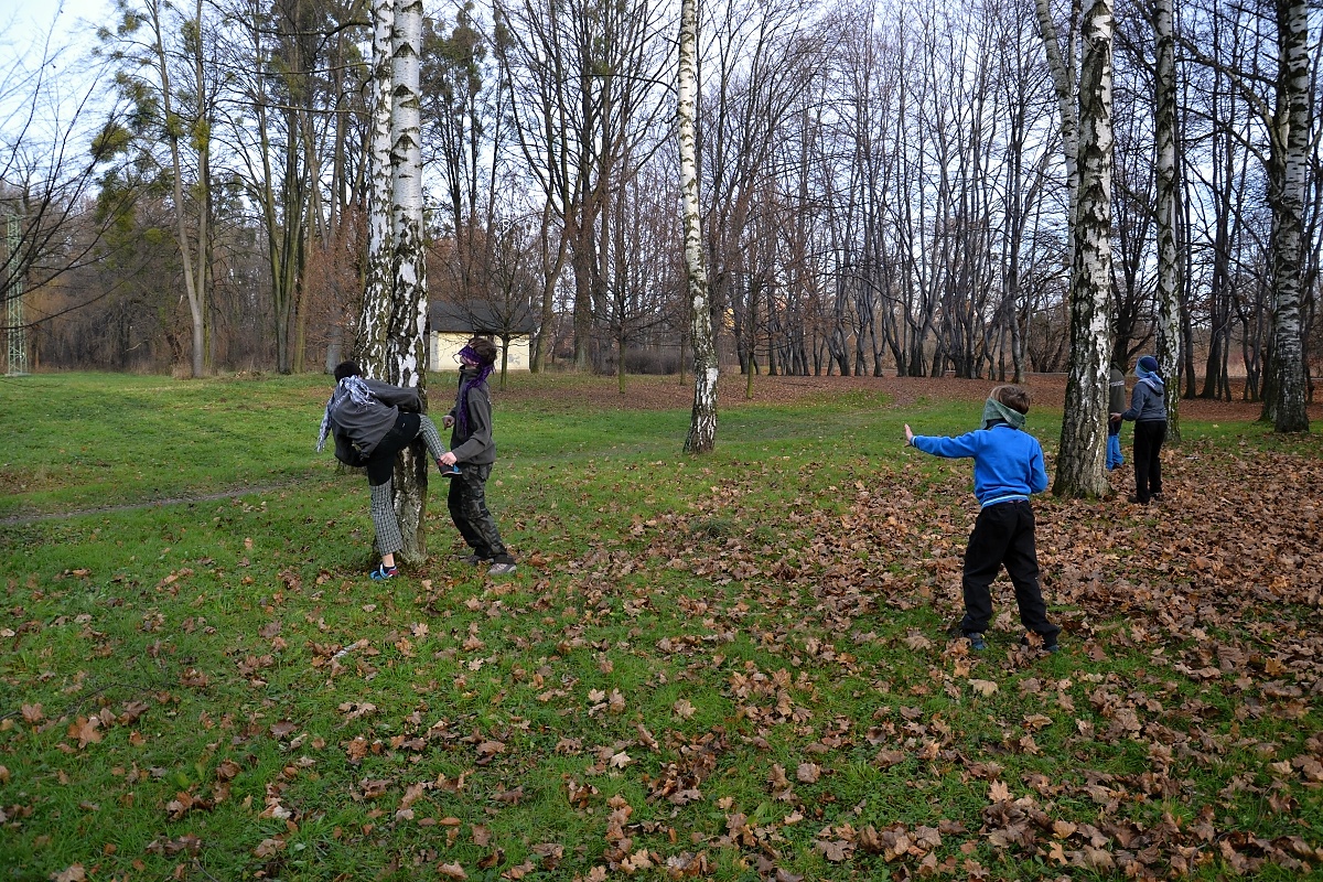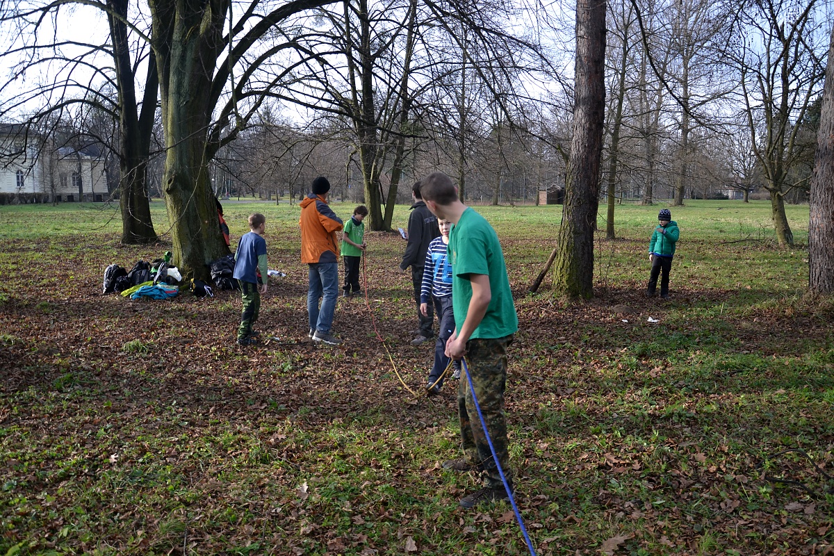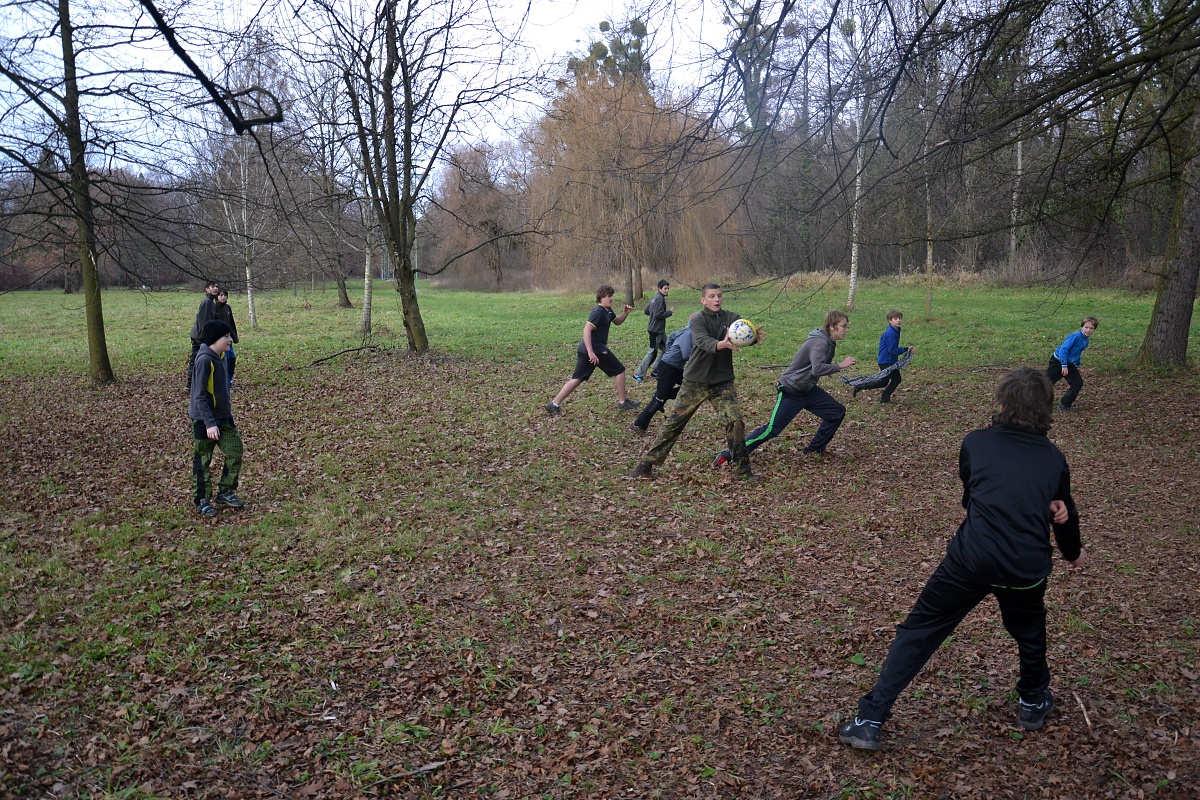 Tak tak jsme to podzimní rodeo stihli, a když se podíváte na přiložené snímky, kde místo sněhu je svěže zelený travník s koberci zlatého listí a slabé zimní slunce kreslí na kůře kmenů staletých stromů pitoreskní stíny, ani vám na mysl nepřijde, že se odehrávalo v polovině prosince. Snad byla na vině lapálie kolem klubovny, o kterou jsme přišli posledního října, snad byla na vině má vytíženost v práci. Každopádně jsme se na RODEO nijak nepřipravovali a první (nebo poslední?) volný termín jsme naplnili soutěžemi mezi družinami.
