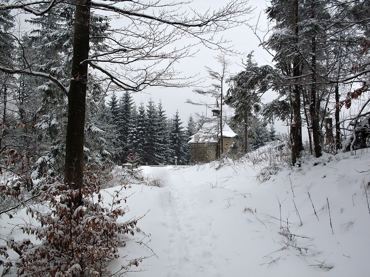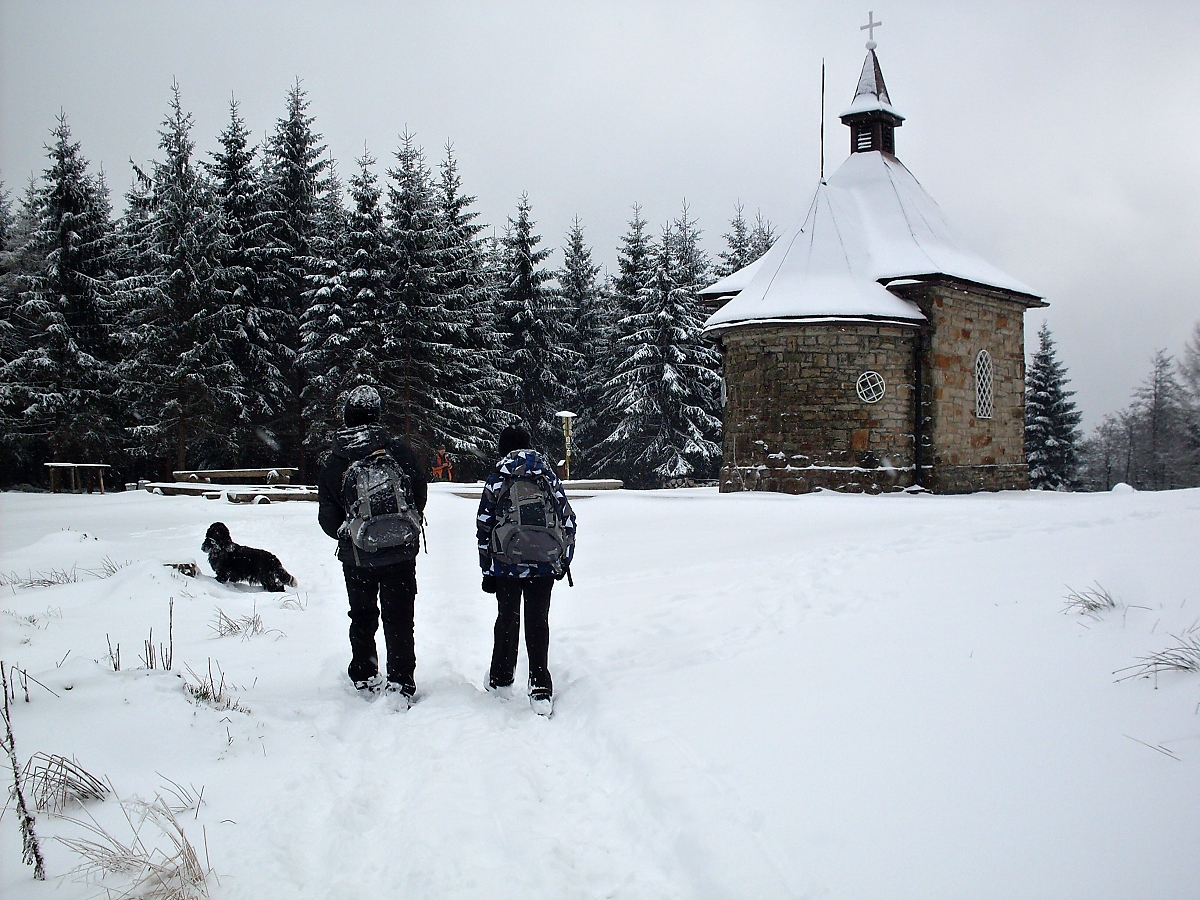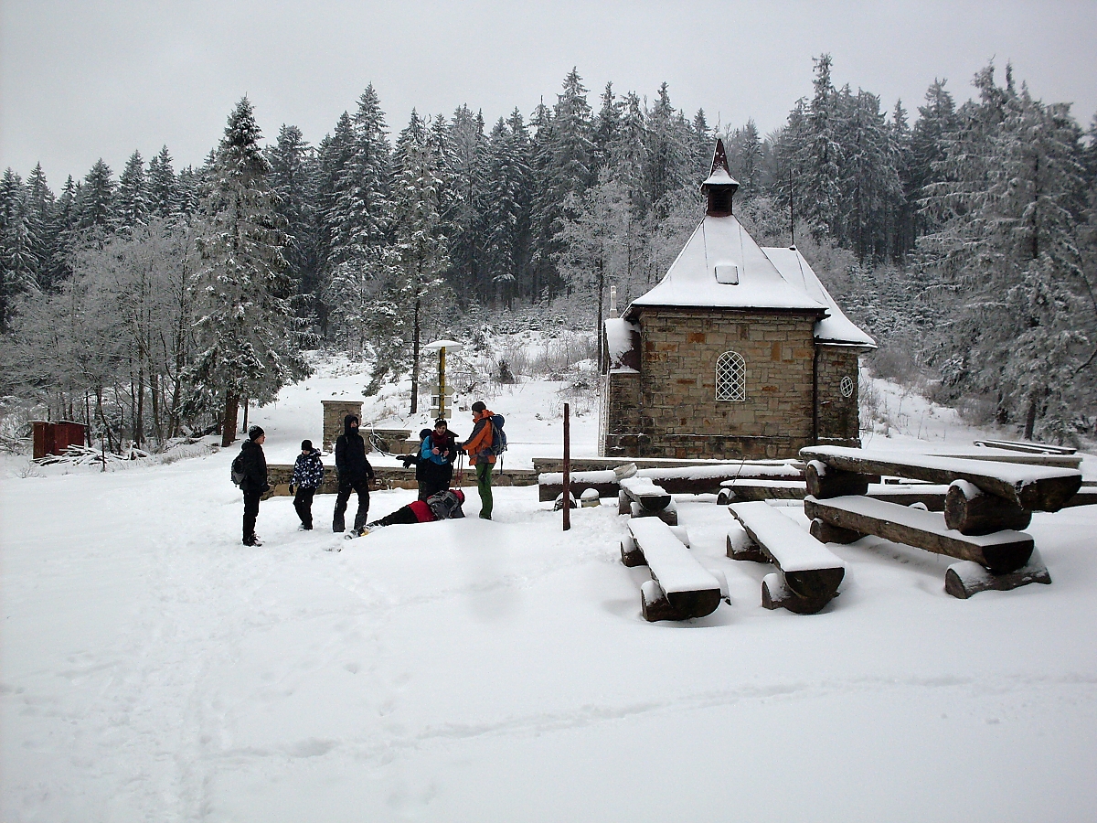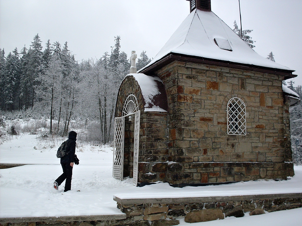 Proti nám se vynořují dva mládenci, zafújaní od sněhu. Jeden je v maskáčích, oba však mají trekové hole. Litují Sira, že dostává pořádně do těla. (A mě nepolitují). Naštěstí se už nedrápeme do toho neschůdného svahu. Překračujeme zpevněnou cestu. Návrh na uspořádání svačiny je zamítnut. Čekáme na „posledy“. Z jejich vlivu se už vymanil Startér a šlape jako hodinky. Blíží se dvanáctá hodina a les se začíná, ve směru, kterým pochodujeme, projasňovat. A poslední stromy a nic – holá horská louka pokrytá čerstvým sněhem. A uprostřed bílé pláně, už na slovenské straně, stojí kaple Panny Marie. Čtyřboká kaple na Muřinkovém vrchu, postavena v roce 1910 v pseudorománském stylu. Zírám.