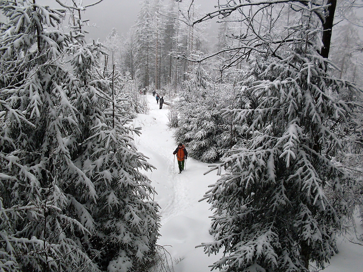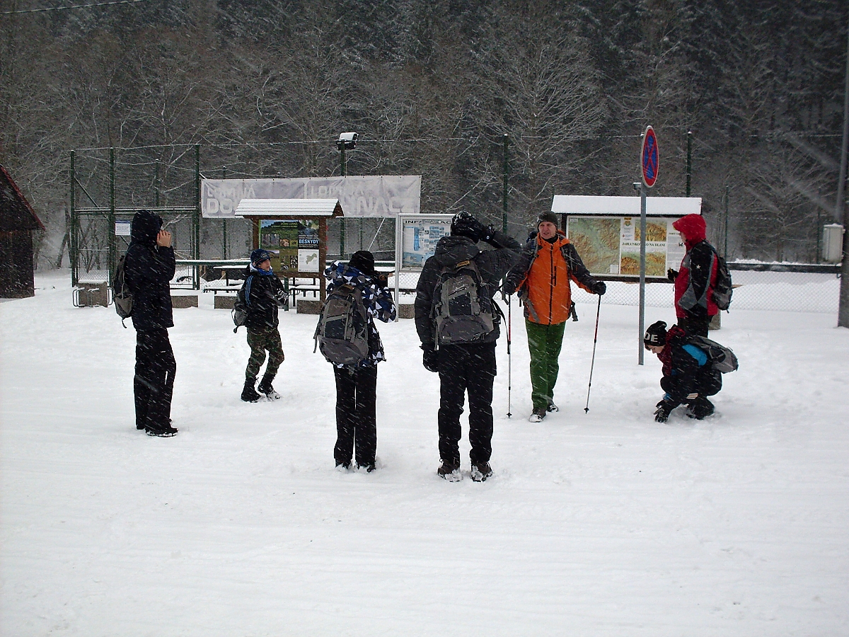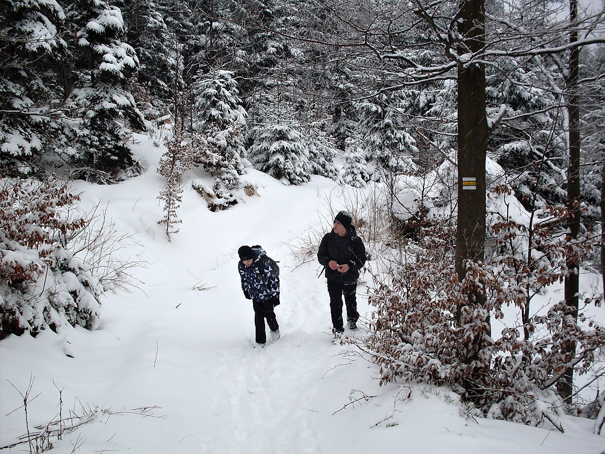 Zvolna kráčíme podél potůčku Přelač – kamenité vysoké břehy, splávky a splavy, zasněžené můstky. Bílá se snoubí s černou. Nádherná dokonalost. Hoši si stále nedokáží zapamatovat kam jdeme. No, na Přelač jdeme. Hodně dávno jsem zde, tou malebnou krajinou, s oddílem několikrát kráčel. Ale nikdy ne v zimě. Po cestě nějaké hry u metrů dřeva, ale nevím co to bylo, protože se snažím trhat se dopředu, aby na mne oddíl nemusel čekat. A sem tam i nějakou „fotéšku“ zrobím. Netvrdím, že dokonalou, ale někdy se podaří. A dokonce lze poznat, co jsem zvěčnil..