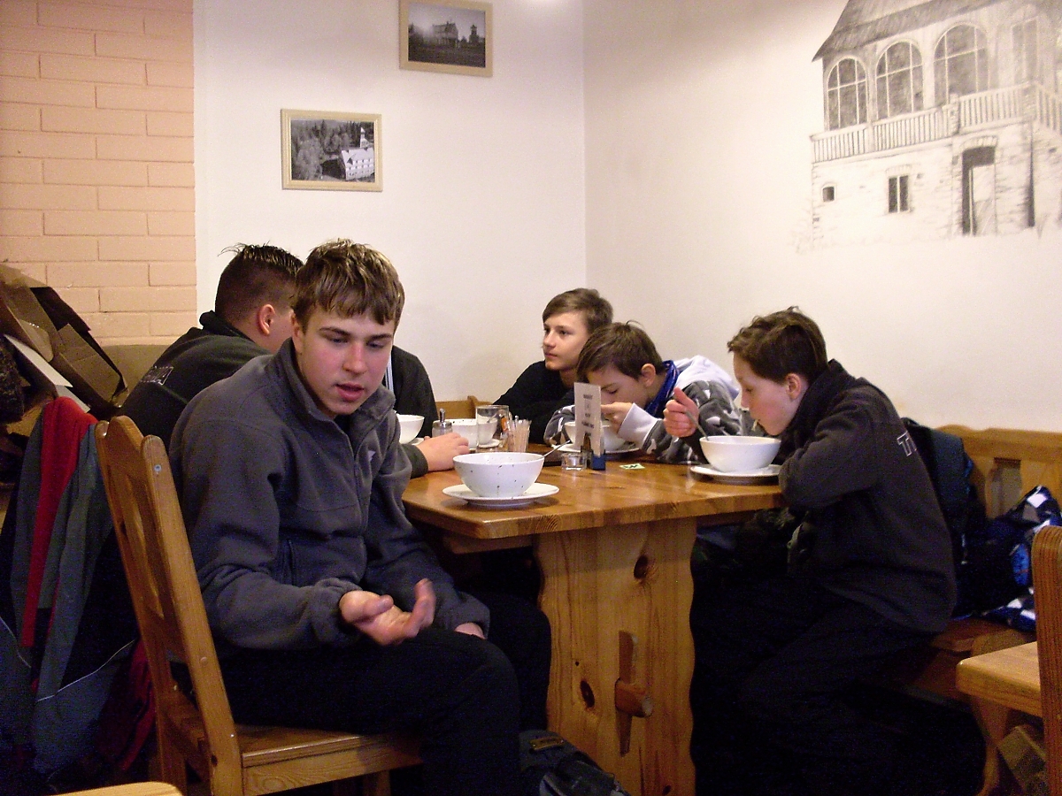 Když nás autobus vysypal na konečné Lomné doliny (karamba - zde musím napsat, že v autobuse se během naší cesty na monitoru promítal nějaký animovaný film o robotovi, co všechno žral a vypadávaly z něj kostky. A všichni věděli kdo to je. Jen já jsem byl z obliga! doufám, že to na zimním táboře napravíte, rosomáci!), ocitli jsme se sami. Akorát jakási podroušená figura na nás cosi povzbuzujícího pořvává. Sir létá jako raketa. Antek stahuje účastníky k tenisovému dvorci, co kdysi býval koupalištěm. Je nás pět a půl. A to téměř doslova – žalostný pohled. Sněží. Všude je bílo, až oči bolí. Antek vyměňuje žetony, za dva zelené obdržíš jeden červený. „Hej, vymysli též nějakou hru!“ přikazuje my. Tak nechávám oddíl nastoupit, zavřít oči a šup cosi do pusy. Kdo pozná co to je, získá zelený žeton. Tříska, Shrek a Júňo nepoznali sušenou švestku.