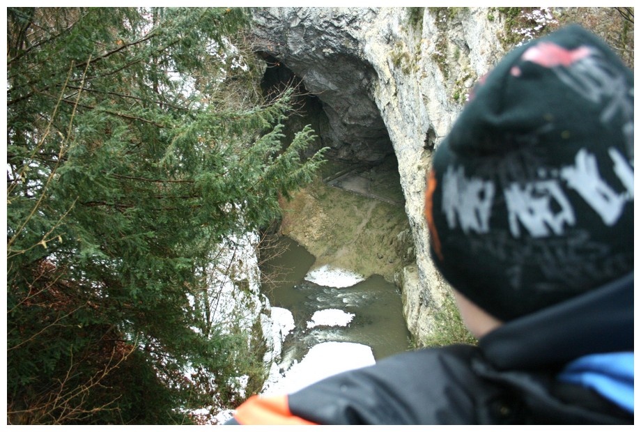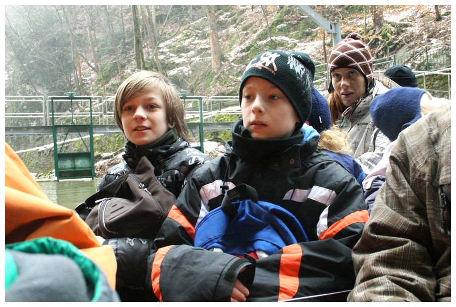 Hlavním „tahem“ sestupujeme do údolí. Schody jsou pokryty vrstvou zledovatělého sněhu – poměrně nebezpečná sranda! Návštěvu Punkevních jeskyní jsme nemohli trefit lépe. Do začátku prohlídky zbývá pouhých deset minut, které trávíme v prodejně suvenýrů. Sdílná paní prodávající nás obchodně masíruje a ve vidině tučného zisku vytahuje na pult i kousky rozřezaných krápníků! Ovšem tyto byly údajně zcela legálně vyzvednuty z propadlé nepřístupné jeskyně. Nezbývá nám, než jí věřit. Pár korunek nakonec získává za turistické známky a hned se ochotně věnuje dalším příchozím zákazníkům.