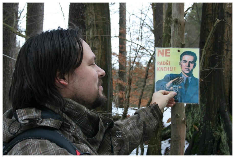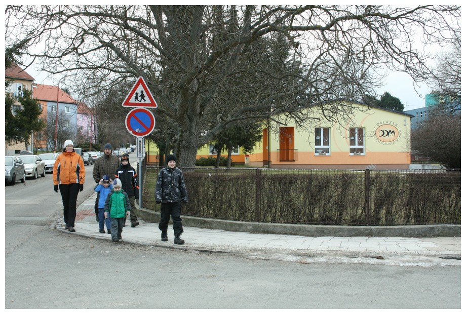 Dvě hodiny před odjezdem jsem dostal zprávu od Joriho babičky, že je nemocný a na výpravu nepojede. Jelikož jsme zůstali jen čtyři, narychlo jsem se spojil s Bubákem a domluvili jsme se, že přesun uskutečníme „žabkou“. Sraz na nádraží zůstal nezměněn, pouze jsme se podchodem přesunuli do Hodolan na parkoviště v Táborské ulici, kde je vozidlo připravené. Tímto způsobem dopravy získáme přes dvě hodiny času, a tak se cestou domlouváme, kde uděláme přestávku a co podnikneme. Rozhodujeme se pro Jedovnici, kde se podíváme k rybníku Olšovci a provětráme několik krabiček, jež zde ukryli přičinliví kačeři. Šipka navigace nás také zavedla k třísetleté lípě, místní škole i již nefungujícímu historickému lihovaru.