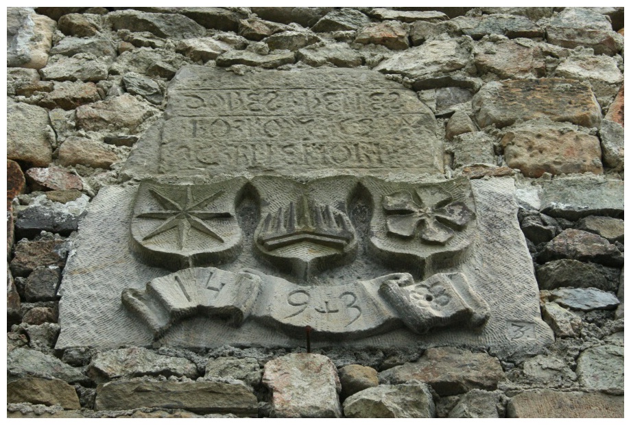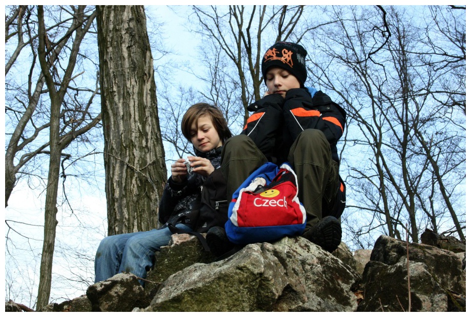 Brána Nového hradu je zaryglována, což jsme však věděli dopředu a proto nás tato holá skutečnost nepřekvapila. Využíváme závětří valené klenby za, kdysi snad opravdu padacím, mostem ke konzumaci svačiny a občerstvení čajem. U nedalekého trojstromu se podepisujeme do nalezené keše ještě o kousek dál zkoumáme rozcestník. Pod naší, zelenou značkou, svítí novotou nápis „Pro cyklisty a při sněhu a mrazu i pro pěší nevhodné.“ No, nic, jdeme dál a uvidíme. V jenom úseku lesní cesty nás obklopuje puch silně připomínající pavilon opis v ZOO. „Hoši, pusťte toho medvěda z mysli!“ Prudce klesáme až na dno údolíčka, kde přískoky přes namrzlé balvany místního bezejmenného potůčku překonáváme jeho tok a dostáváme na jeho pravý břeh. Tak proto nevhodné! Ovšem pro nás to nebyl žádný problém.