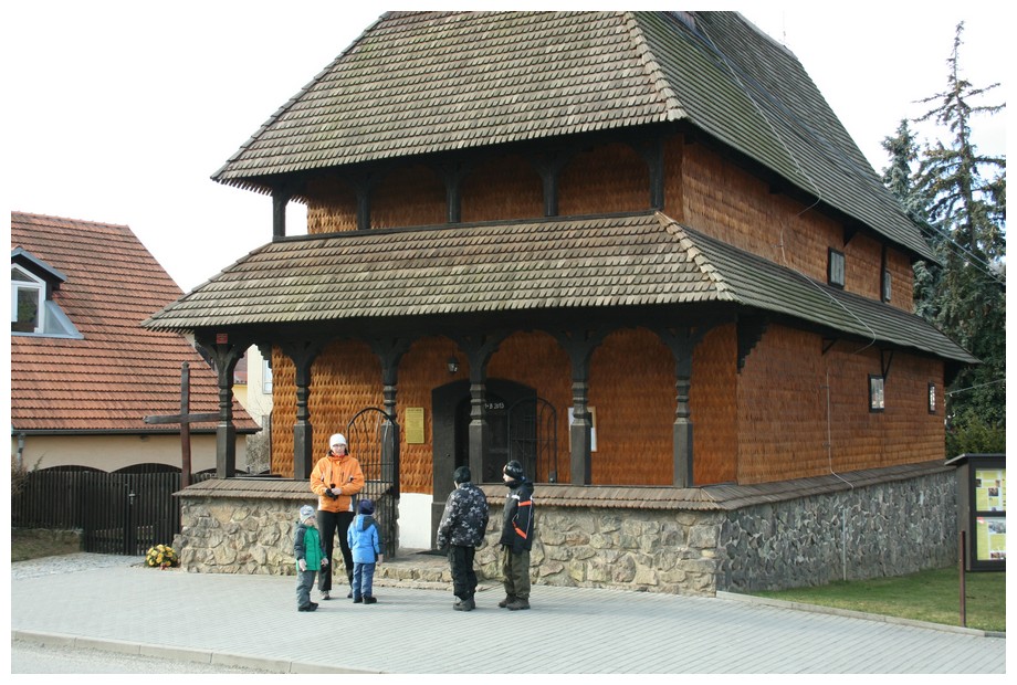 Prvním naším postupným cílem je dřevěný kostelík Sv. Paraskivy, jenž sem byl převezen z Podkarpatské Rusi v roce 1936! Tři z nás ho viděli již včera večer za tmy, osvětlený jen naoranžovělým světlem pouličních lamp. Kostelík je otevřený, ovšem zrovna probíhá zádušní mše za dva zesnulé. Máme vstoupit? Nemáme? Nakonec jsme v tichosti dovnitř přeci jen vešli, ovšem jen na chvilinku. Lukáškovi a Matýskovi pak musíme složitě vysvětlovat, s kým že se to přítomní loučí a proč už se nemohou znovu vrátit…