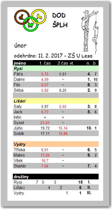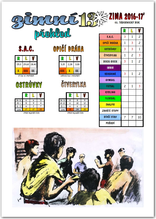 Na hřišti dnes, a zrovna oni, odehrávají dva zápasy Vydry. S Rysy překvapivě remizují 5:5 – jestli to Rysové nepojali jako nějakou taškařici, ale Lišákům podléhají 4:12. Při snajpru stahuji nehrající družinu na chodbu. Dostává 16. úsek radistické olympiády – keltské runy a stopky se rozebíhají. Postupně se tak protočily všechny družiny a dle dosažených časů bylo odvozeno pořadí. První opět Tříska. Druhý je Dalmi. (Ten vzápětí spolupracuje s družinou. Alespoň jsem si to, dle přiložených fotografií, myslel. Ale z výsledků lze vysledovat, že to není pravda. Například gymnazista Filo vůbec dnešní zprávu nevyluštil a Séba ji odevzdává až na konci tělocvičny). Následují: Saly, Jack, Páťa… však se podívejte do tabulky. Kde a kdy se ovšem objeví, to nevím.