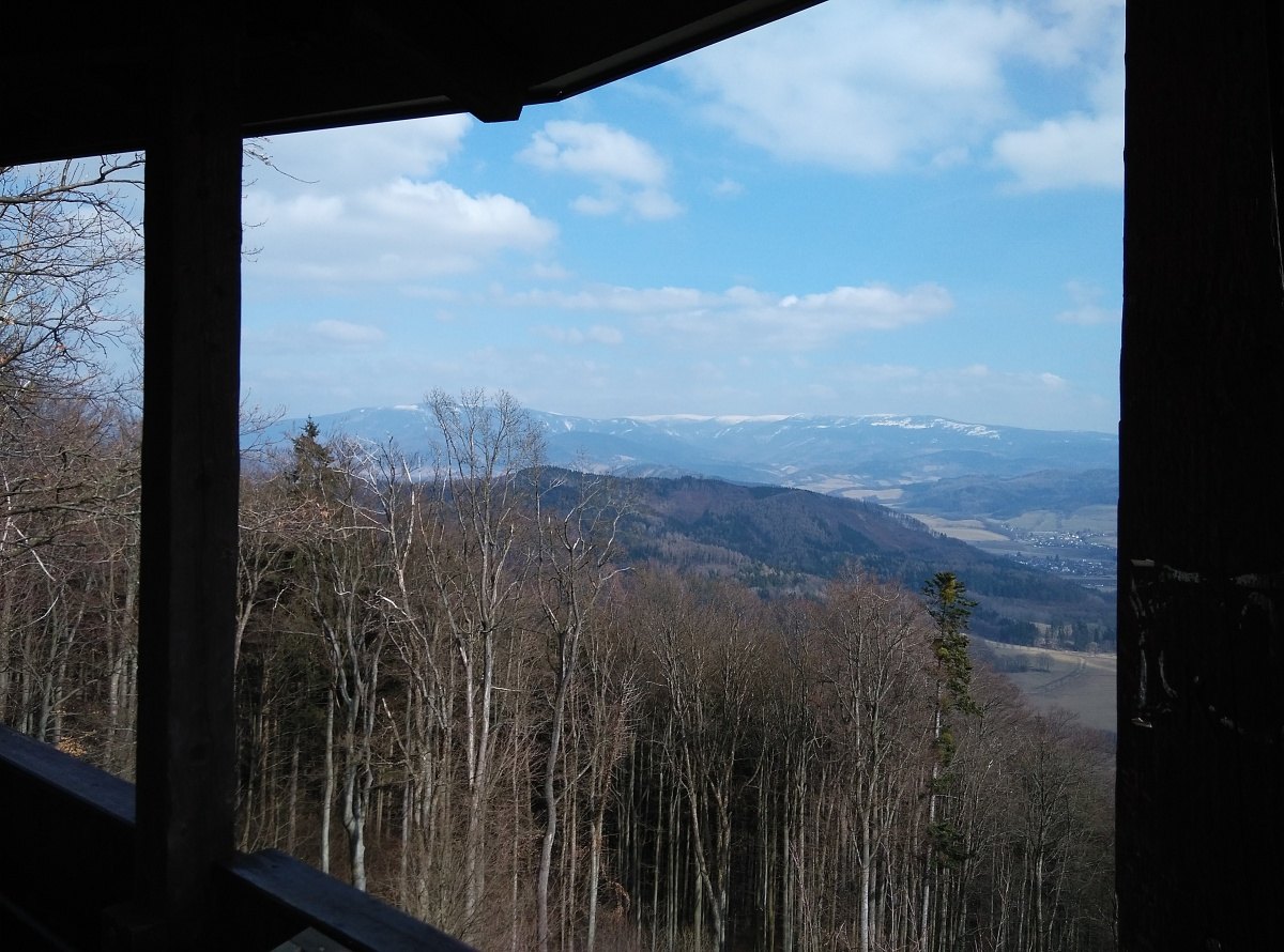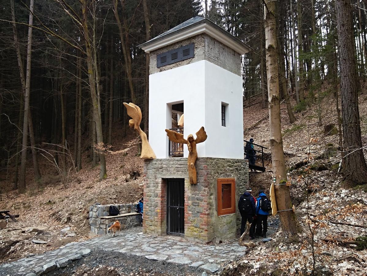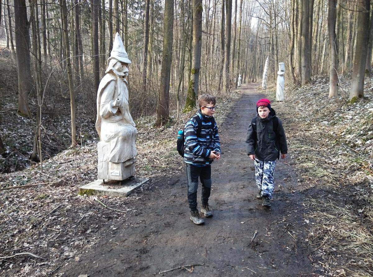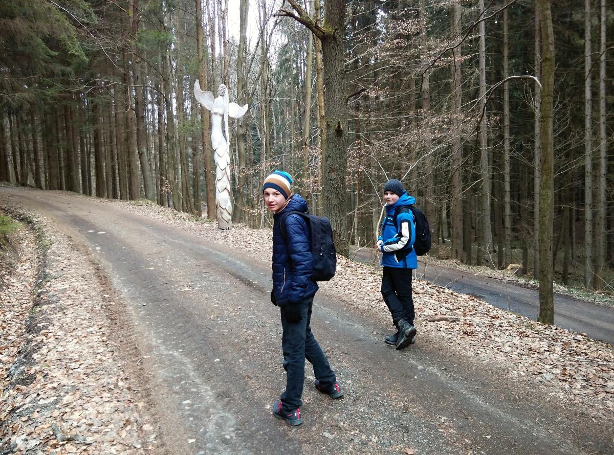 Odcházíme kolem evangelického kostela a u dalšího, pravoslavného, odbočujeme vlevo, abychom se na konci ulice Karla Hynka Máchy napojili na zelenou turistickou značku, která nás bude provázet až k cíli dnešní výpravy. V místech, kde zelená značka opouští osídlenou část města a vstupuje do lesa, stojí ohromná hasičská cisterna. Od ní jsou nataženy pospojované hadice, zatím zjevně nepoužité, lemující stoupající asfaltovou cestu. Kam vedou? Odpověď na tuto otázku nalézám až doma při pohledu na mapu. Nahoře na kopci se totiž nachází Základní škola s Dětským domovem. Tam zřejmě je vody třeba! My však postupujeme dále po značce, míjíme několik košů a odhazišť na discgolf. Zstavujeme se až na místě zvaném „U Nových domků“. Zde svačíme. Je odtud krásně vidět hlavní hřeben Jeseníků a na dvou hodinách, v nejasném oparu, i vysílač na Pradědu! Kroky spřádá plány na dráhu pro horská kola. Bude tam prý i tunel a pak také jáma s trampolínou, o kterou se odrazí. A já na to mám dohlížet!! No, nevím… Po chvíli procházíme rozšířeným prostorem u turistického rozcestníku Tulinka a stále mírně stoupáme. Dohlíží na nás andělé, dřevění andělé. Jsou to dřevěné sochy andělů, které byly vytvořeny v rámci sochařského sympozia „Andělárium“. Kdo nebyl v Rejcharticích, neviděl tamní „Andělskou louku“ a zároveň v něm předchozí věta vzbudila zájem, nechť zapátrá na celosvětové sítí. Hoši, už tam budeme! Jen co překonáme tento „mírný“ kopeček, kam značka odbočuje. Rafanovi se protáčí panenky! Svah je mokrý, rozbahněný. Výstup není snadný. Jsem zvědavý, jaký bude pozdější sestup! To již, vzhledem k času, vím, že plánovanou trasu nestihneme celou a budeme muset vynechat Voštinovou skálu.