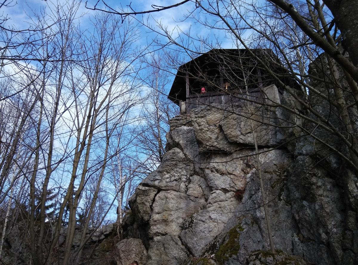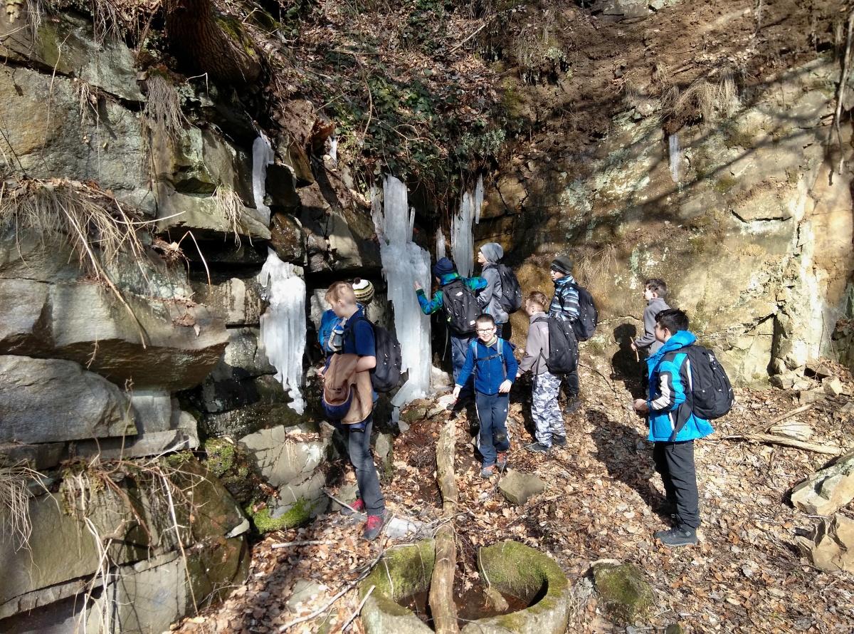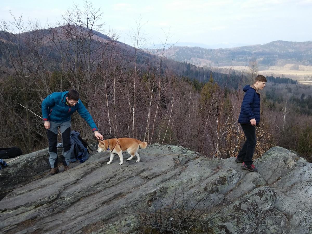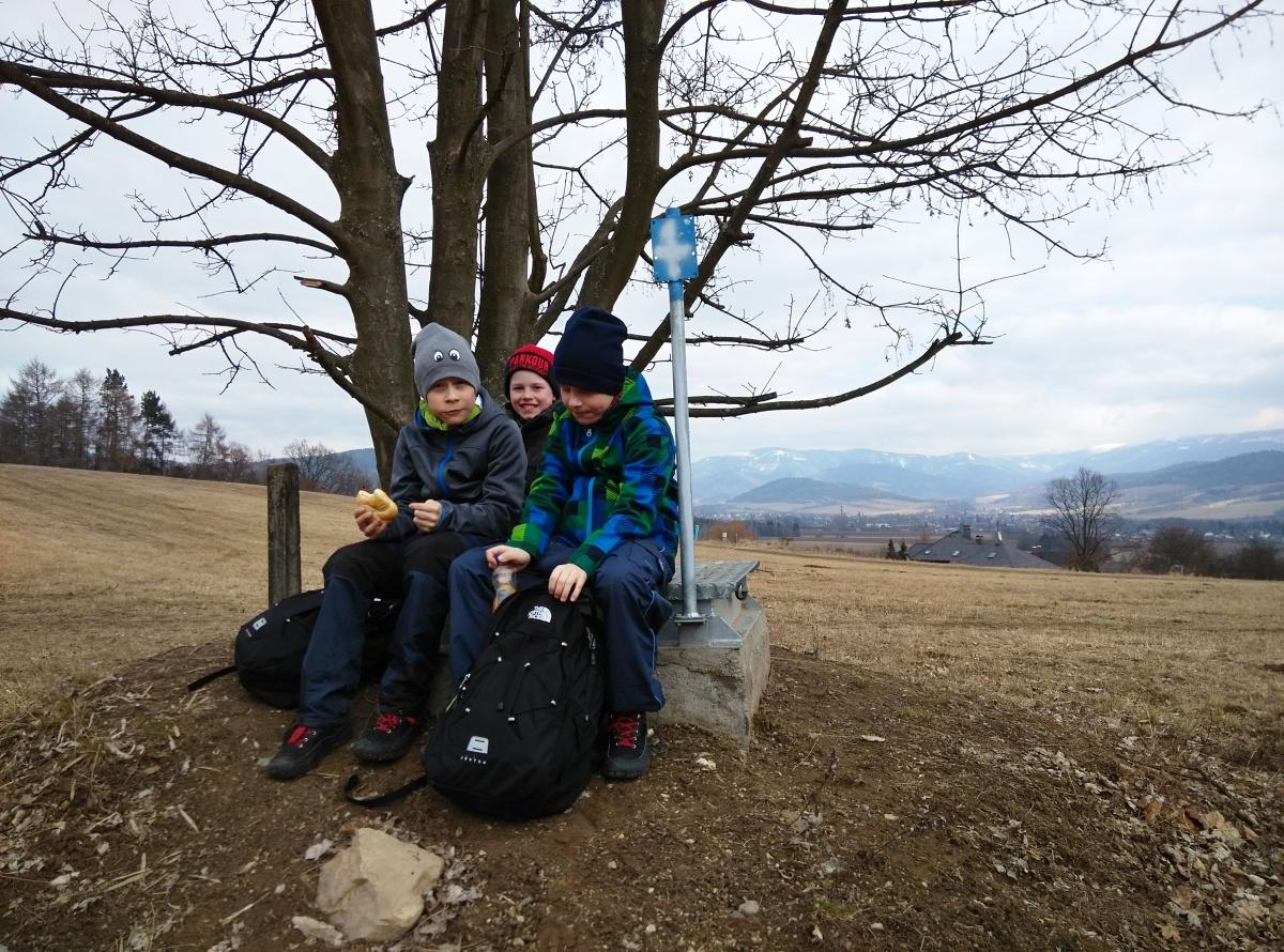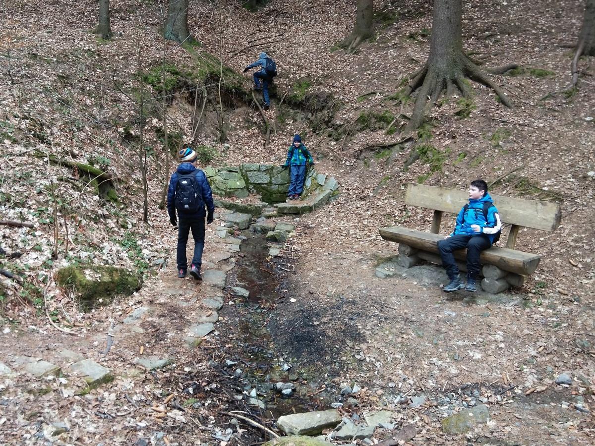 Odcházíme kolem evangelického kostela a u dalšího, pravoslavného, odbočujeme vlevo, abychom se na konci ulice Karla Hynka Máchy napojili na zelenou turistickou značku, která nás bude provázet až k cíli dnešní výpravy. V místech, kde zelená značka opouští osídlenou část města a vstupuje do lesa, stojí ohromná hasičská cisterna. Od ní jsou nataženy pospojované hadice, zatím zjevně nepoužité, lemující stoupající asfaltovou cestu. Kam vedou? Odpověď na tuto otázku nalézám až doma při pohledu na mapu. Nahoře na kopci se totiž nachází Základní škola s Dětským domovem. Tam zřejmě je vody třeba! My však postupujeme dále po značce, míjíme několik košů a odhazišť na discgolf. Zstavujeme se až na místě zvaném „U Nových domků“. Zde svačíme. Je odtud krásně vidět hlavní hřeben Jeseníků a na dvou hodinách, v nejasném oparu, i vysílač na Pradědu! Kroky spřádá plány na dráhu pro horská kola. Bude tam prý i tunel a pak také jáma s trampolínou, o kterou se odrazí. A já na to mám dohlížet!! No, nevím… Po chvíli procházíme rozšířeným prostorem u turistického rozcestníku Tulinka a stále mírně stoupáme. Dohlíží na nás andělé, dřevění andělé. Jsou to dřevěné sochy andělů, které byly vytvořeny v rámci sochařského sympozia „Andělárium“. Kdo nebyl v Rejcharticích, neviděl tamní „Andělskou louku“ a zároveň v něm předchozí věta vzbudila zájem, nechť zapátrá na celosvětové sítí. Hoši, už tam budeme! Jen co překonáme tento „mírný“ kopeček, kam značka odbočuje. Rafanovi se protáčí panenky! Svah je mokrý, rozbahněný. Výstup není snadný. Jsem zvědavý, jaký bude pozdější sestup! To již, vzhledem k času, vím, že plánovanou trasu nestihneme celou a budeme muset vynechat Voštinovou skálu.