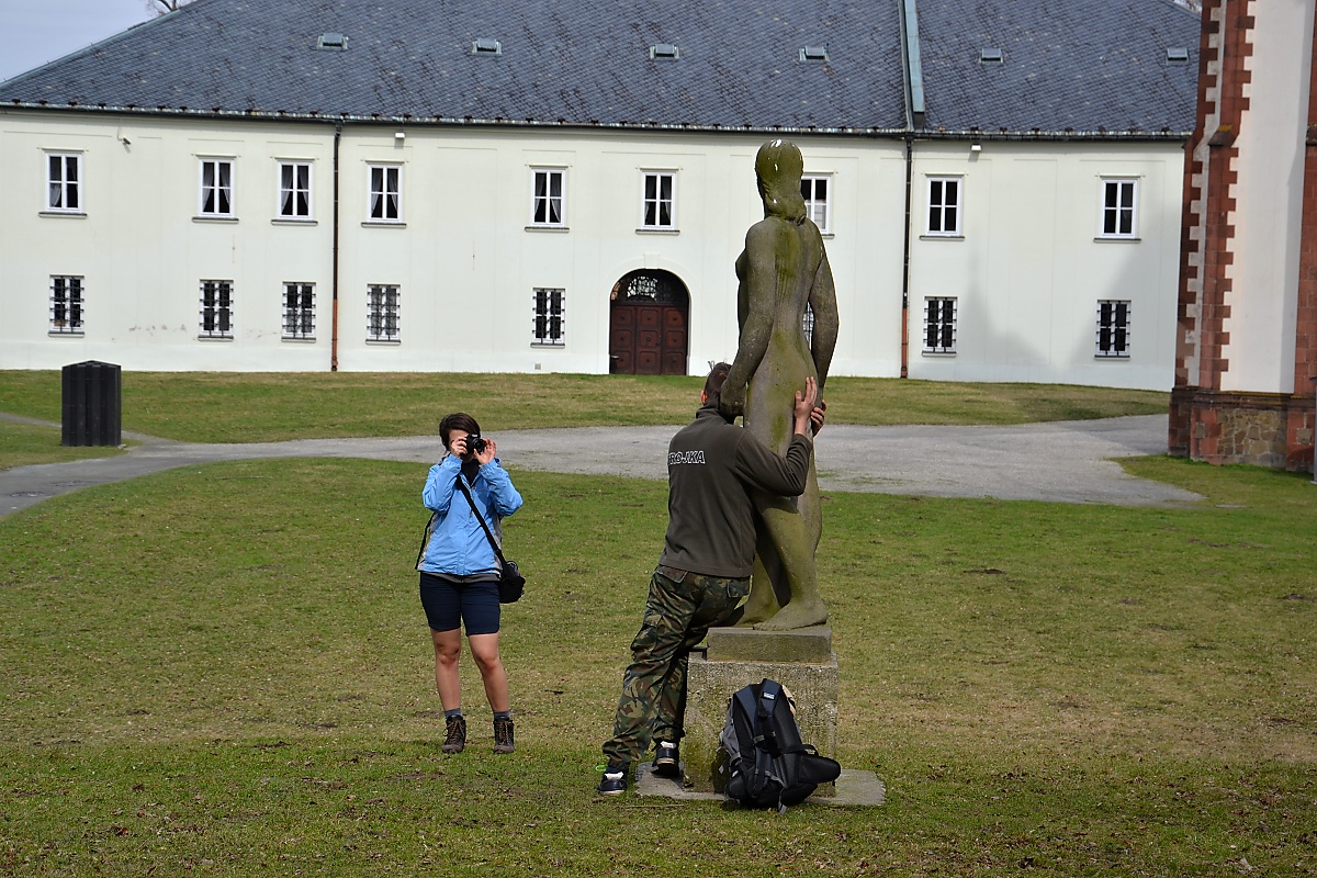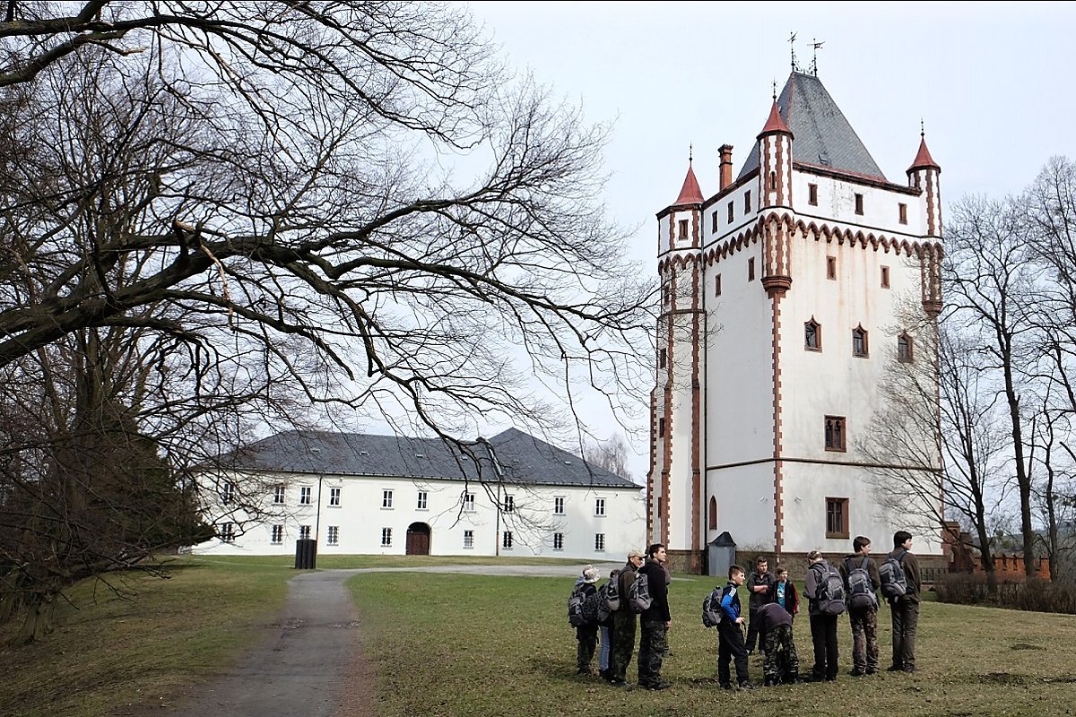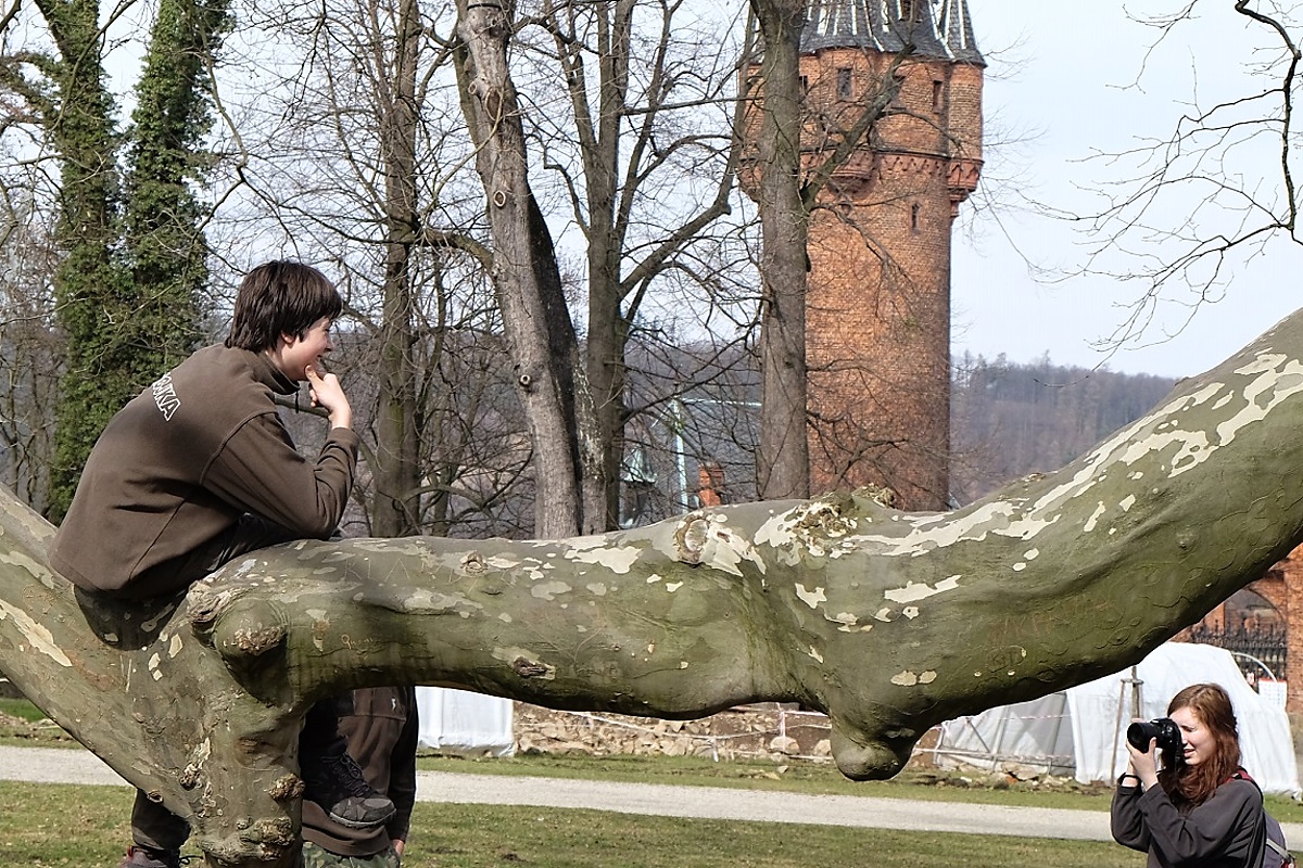 Vnikáme do zámeckého areálu bránou Červeného zámku a mašírujeme si to na nádvoří k Hodinové věži. Ale ouha. Dvířka jsou zamknuta a samotná železná brána zajištěna mohutným řetězem a zámkem. Probíhá rekonstrukce nádvoří. To je škoda. Mohli jsme zase posvačit. Kamo se směje. Tak se alespoň pořizuje pár foteček a hurá k Bílému zámku. Před objektem stojí v levé polovině předzámčí mohutný platan. „Antku, vyfoť mě!“ Loapy letí do trávy, i bundy padají na zem a hoši se sápou na spodní, téměř vodorovnou větev. Nastávají pravé fotografické orgie. Na snímku č. 15 je vidět prchajícího Monu z místa, jak on tvrdí, nerozumného počínání. Člověk nemusí být dendrolog, aby poznal, že mohutná větev má sama co dělat, aby udržela svoji váhu. Ne tak, když se na ní navěsí tlupa výtečníků z našeho oddílu. Karamba, to by byla blamáž, kdyby větev nevydržela. To si, zkrátka, vůbec nedokážete představit !Ale třeba jsem jen škarohlíd a nic se vlastně nestalo!