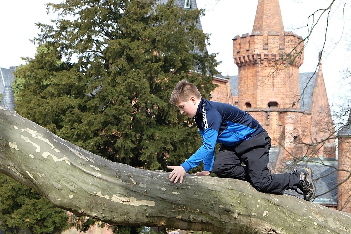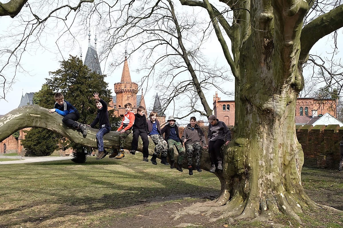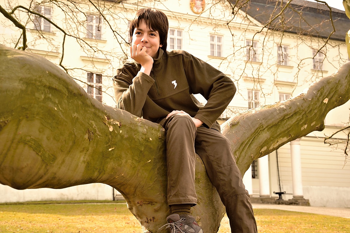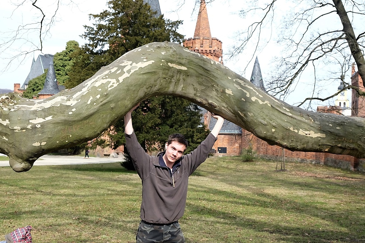 Vnikáme do zámeckého areálu bránou Červeného zámku a mašírujeme si to na nádvoří k Hodinové věži. Ale ouha. Dvířka jsou zamknuta a samotná železná brána zajištěna mohutným řetězem a zámkem. Probíhá rekonstrukce nádvoří. To je škoda. Mohli jsme zase posvačit. Kamo se směje. Tak se alespoň pořizuje pár foteček a hurá k Bílému zámku. Před objektem stojí v levé polovině předzámčí mohutný platan. „Antku, vyfoť mě!“ Loapy letí do trávy, i bundy padají na zem a hoši se sápou na spodní, téměř vodorovnou větev. Nastávají pravé fotografické orgie. Na snímku č. 15 je vidět prchajícího Monu z místa, jak on tvrdí, nerozumného počínání. Člověk nemusí být dendrolog, aby poznal, že mohutná větev má sama co dělat, aby udržela svoji váhu. Ne tak, když se na ní navěsí tlupa výtečníků z našeho oddílu. Karamba, to by byla blamáž, kdyby větev nevydržela. To si, zkrátka, vůbec nedokážete představit !Ale třeba jsem jen škarohlíd a nic se vlastně nestalo!