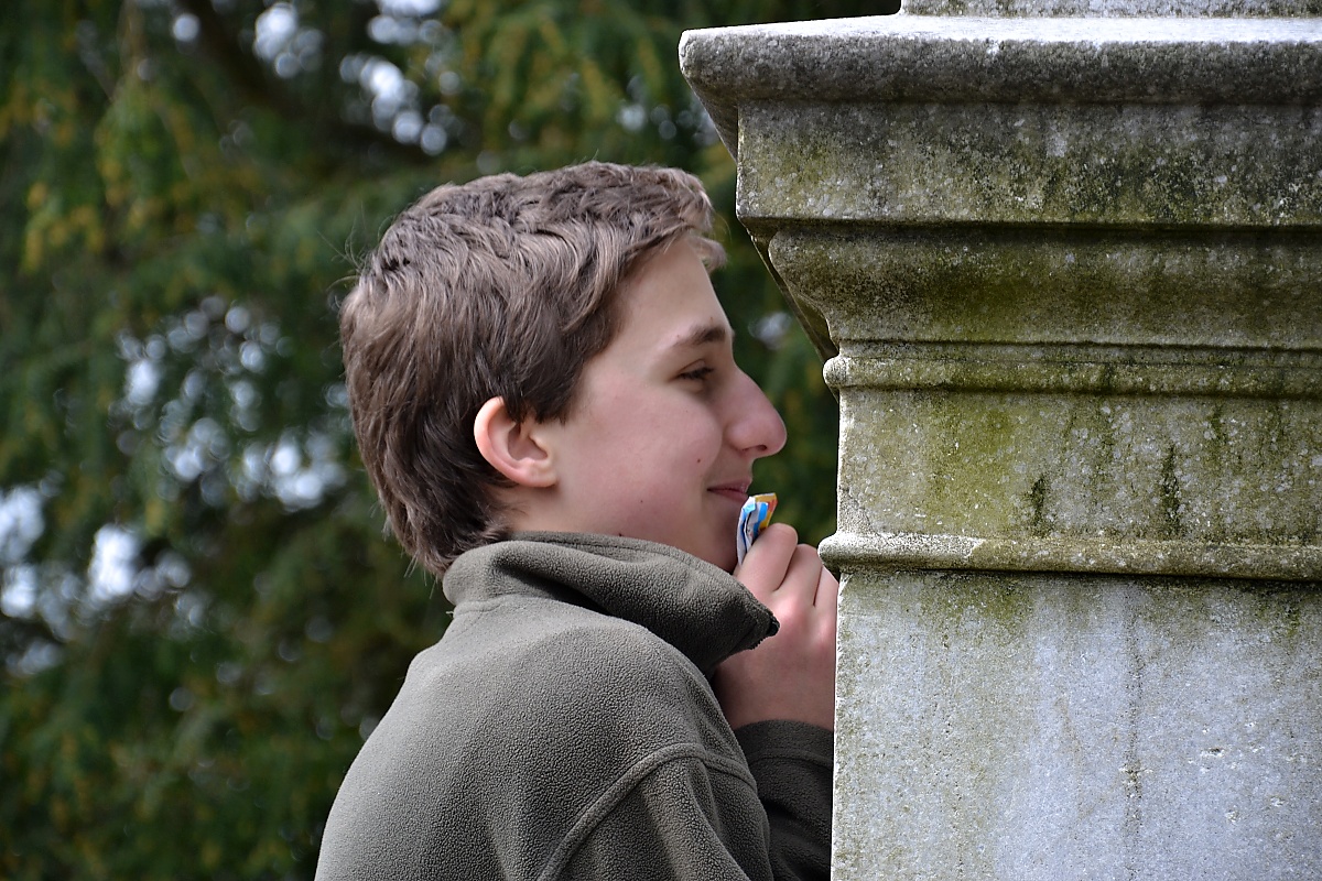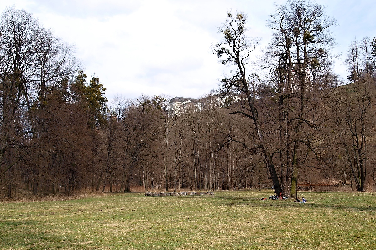 Posloucháme za Bílou věží ukryté reproduktory. Žádná hudba, žádný Beethoven, jenom drozdi na stromech zámeckého parku trylkují. Za dřevěným mostem, kde starší hoši pýřití, za asistence fotografek Lú a Lály, vymýšlí různé varietní výstupy, nesoucí se v slaboduché atmosféře (to před Antkem nebo přede mnou by se takhle neodvázali!), stoupáme k bustě nějakého pána. A jestli to nebude ten Beethoven. A je to on. Pěkné místo, kamenné lavičky okolo, nové stromečky vysázeny. Sir uvádí v praxi moji hypotézu ohledně vydlabaných korýtek v kamenných sedácích parkových laviček. Domlouváme se, že na další vyhlídky nepůjdeme a když je tak pěkně, slezeme hned na Mariánské louky a rozbijeme „tábor“ pod stromy.