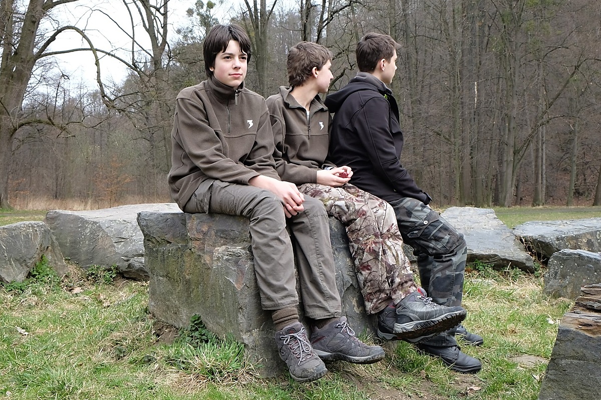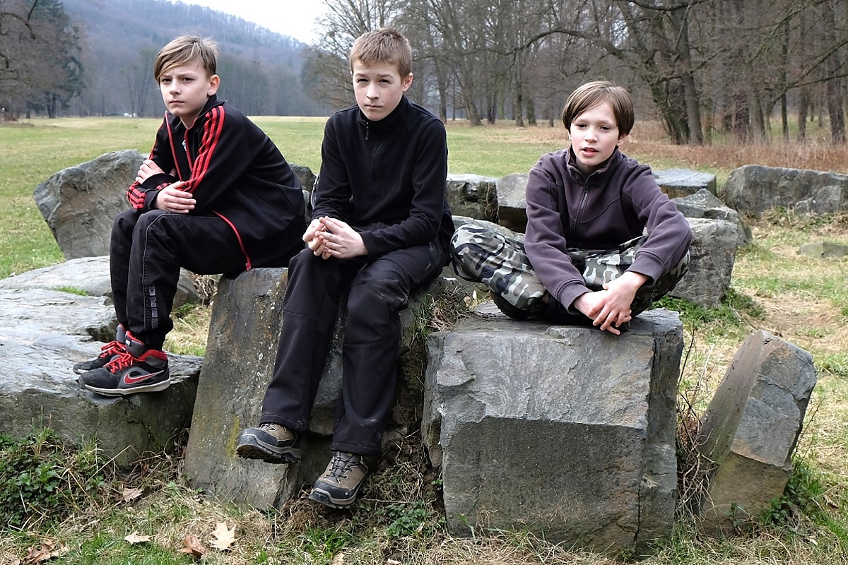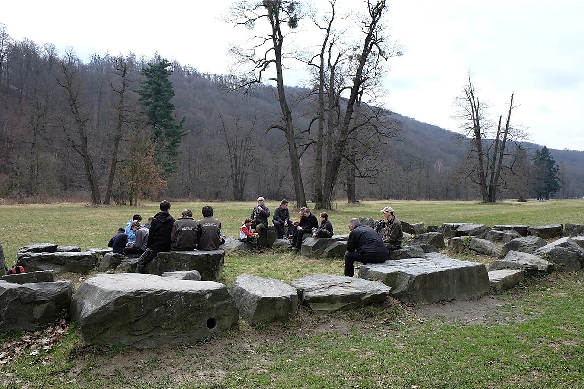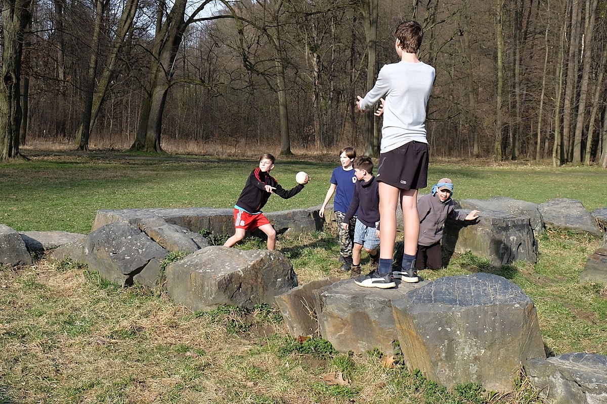 Postupně, jak docházíme, si sedáme na kamenný „stonehenge“. Není to kruh, není to ani elipsoid. Nejvíce se to blíží hřišti na snajpra. Pár Monových pohádek o místní lokalitě, o stromech, vodičce, o kytičkách a zrušených toaletách dřívější dětské organizace. To nejvíce nadchlo Antka. Ale konec řečí, hurá pod stromy. „Mona, mám se už převléct do sportovního?“, ptá se Startér. „Samozřejmě, to musíš!“ Ne všichni však věci „na lítání“ mají a následně se válí v kalhotách po rozmetaných krtincích, aby se večer v těch samých svršcích povalovali po sedadlech vagónů. Mnozí hoši se převlékají do kraťas. A už se to mele, už je nástup! A ve hře jsou žetony. Tak pojďme!