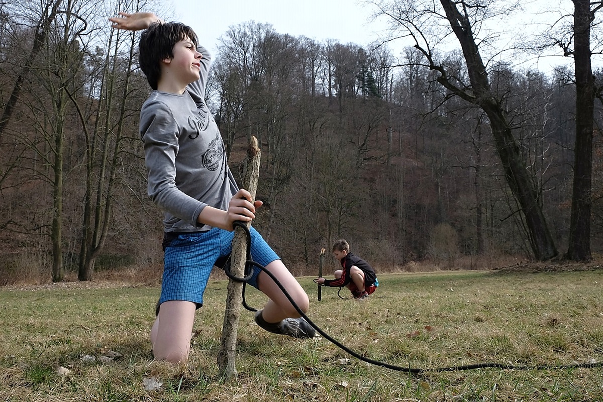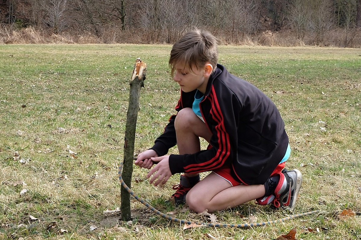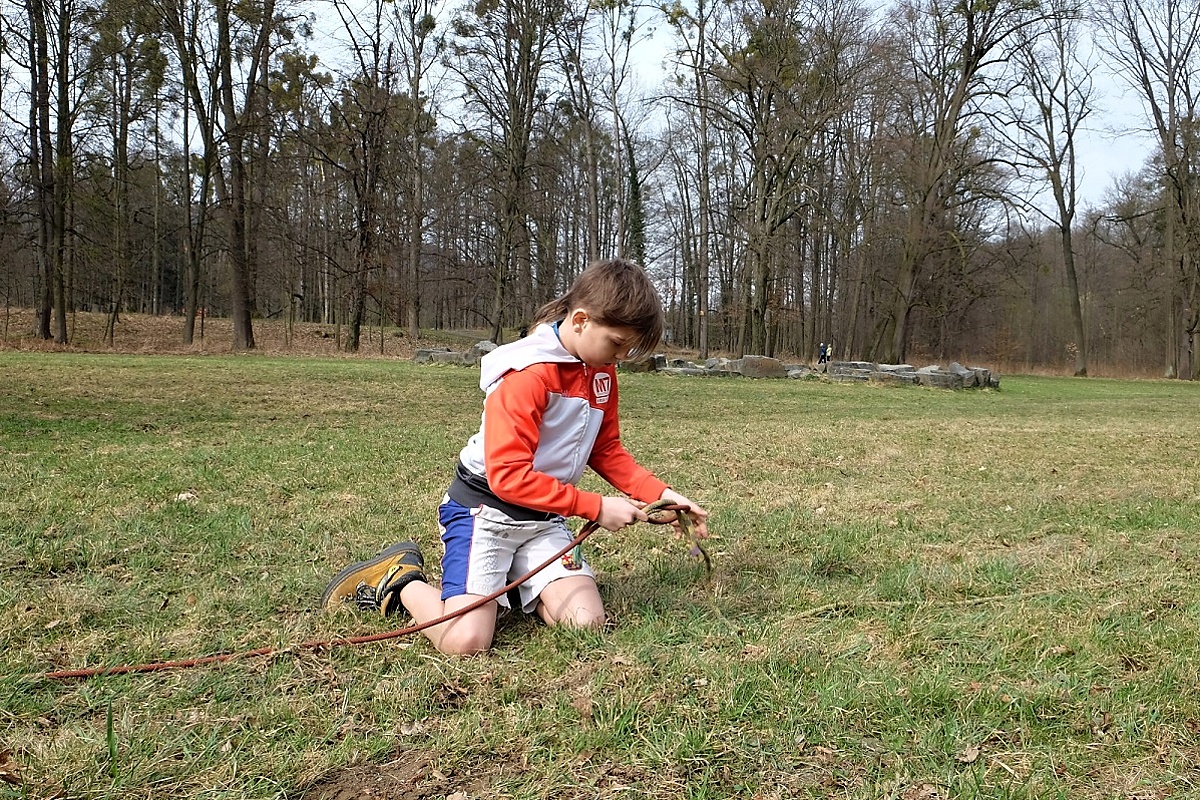 Nemůžeme si odpustit pod kouzelnou kulisou neuzlovat. Kolíky už jsou v louce zaraženy, družiny se dohadují, co kdo bude vázat. Problémem u Rysů je, že všichni umí vyrobit „akorát“ loďák. Ale nakonec se domluvili a uzly si rozdělili. Malý Satan vyfasoval „ambulančku“. Máme dost las (zázrak!), můžeme jet najednou. První kolo vyhrávají Vydry. Lišákům povoluje uzel. Rysové umí akorát loďák. Ten Séba uvázal špatně. Jedeme druhé kolo. Zde jsou rychlejší Lišáci. Troufl bych si říct – rychlejší než Vydry v prvním kole. Ale Antek oznamuje, že platí první kolo a tím to hasne. To druhé bylo takové „vydýchávací“. Vydry získávají žeton. Občas sice foukne chladnější větřík, ale sluníčko pěkně svítí. A v lese rostou sasanky hajní. Loučí se s námi Frydrychovi.