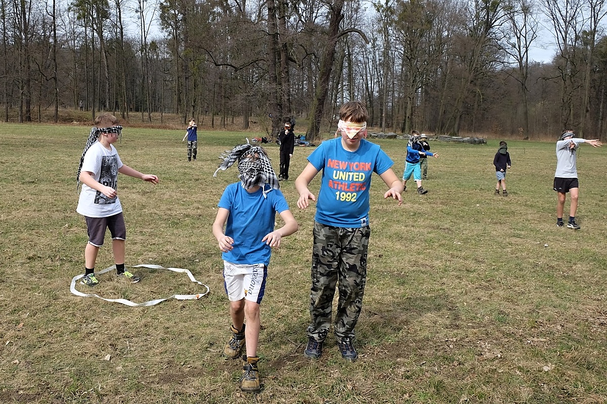 Prvně se přetahujeme pomocí vázacích popruhů. Každý s každým, ale výsledky se zanáší do dvou tabulek. Mladší a starší. Každému se započítává kolik soupeřů přetáhl. Navrch mají hoši vesměs podsadití, co rádi jí a málo se pohybují. Výsledky zapisuje Antek. Následuje závod na družiny. Vidoucí musí své nevidoucí družiníky přivést do přiděleného kruhu. Zde jasně vítězí Rysové. Je jich nejméně a Kamo přeřval ostatní naváděče. Nakonec loukou bloudí pouze dvě figury. Tuším, že to jsou Sobík a jak jinak – Júňo. Ale Třískovi, už na hranici nervového vyčerpaní, se je nakonec podařilo dostat do cíle. To je tak, když na nevidoucího řveš: „Doprava, doprava! To je ta ruka, co s ní ve škole píšeš!“ A on je to levák!!