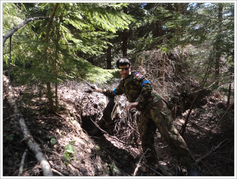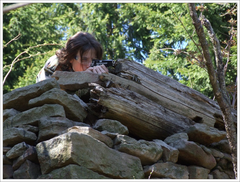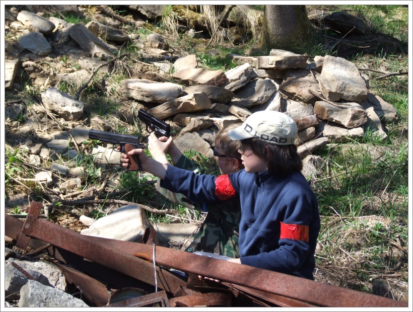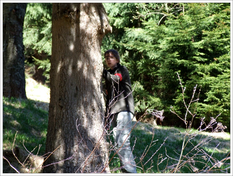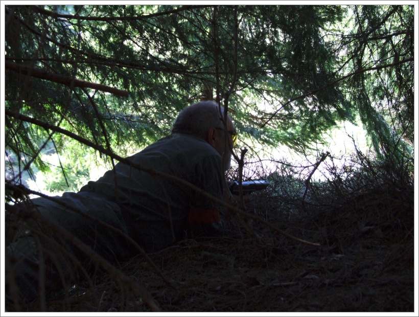 Zalehávám pod vysoký smrk a v mém ukrytu se se mnou tísní ještě nějaká 100 l bečka plná zrní. To je asi to místo, které nahánělo protivníkům strach a dlouze se mu vyhýbali s přesvědčením, že tu na ně číhám já. Ale já jsem tu poprvé. Následně jsem se odplazil k základům dřevěnice ale tady mne zase dostal Vitas, plazící se mezi flaškami. Na „mrtvolišti“ nám Fili předvádí, jak se chytají klíšťata. Ve chvilce jich na sobě našel sedm, další se mu vesele prochází po světlé větrovce. (Nezapomeňte se doma důkladně nechat zkontrolovat, jestli jste si nějaké nepřivezli s sebou).