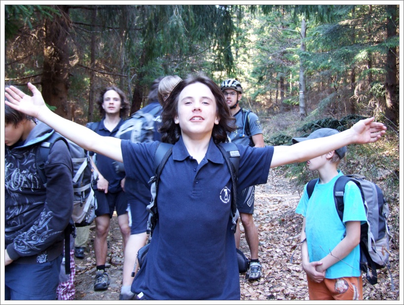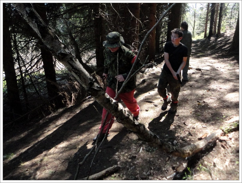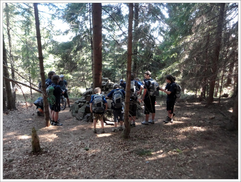 V okamžiku vynoření se z mohylového lesa jsme překvapili kráčející turisty ze Skalky. Ti patrně nepředpokládali, že se zde v lese pohybuje více lidiček. Obzvláště když náš průvod uzavírá Fili jedoucí na kole. Nejdeme ovšem s nimi, točíme mimo značenou stezku a sestupujeme po staré jantarové cestě dolů přes vzrostlý les ke korytu Mohylího potoka. Část starších „startuje motorky“ a za zvuku vrčení, brblání a chrchlání sbíhají svah až na asfaltovou silnici vedoucí na Tetřev. Tu všichni dobýváme sestoupením po kmenech padlých stromů.