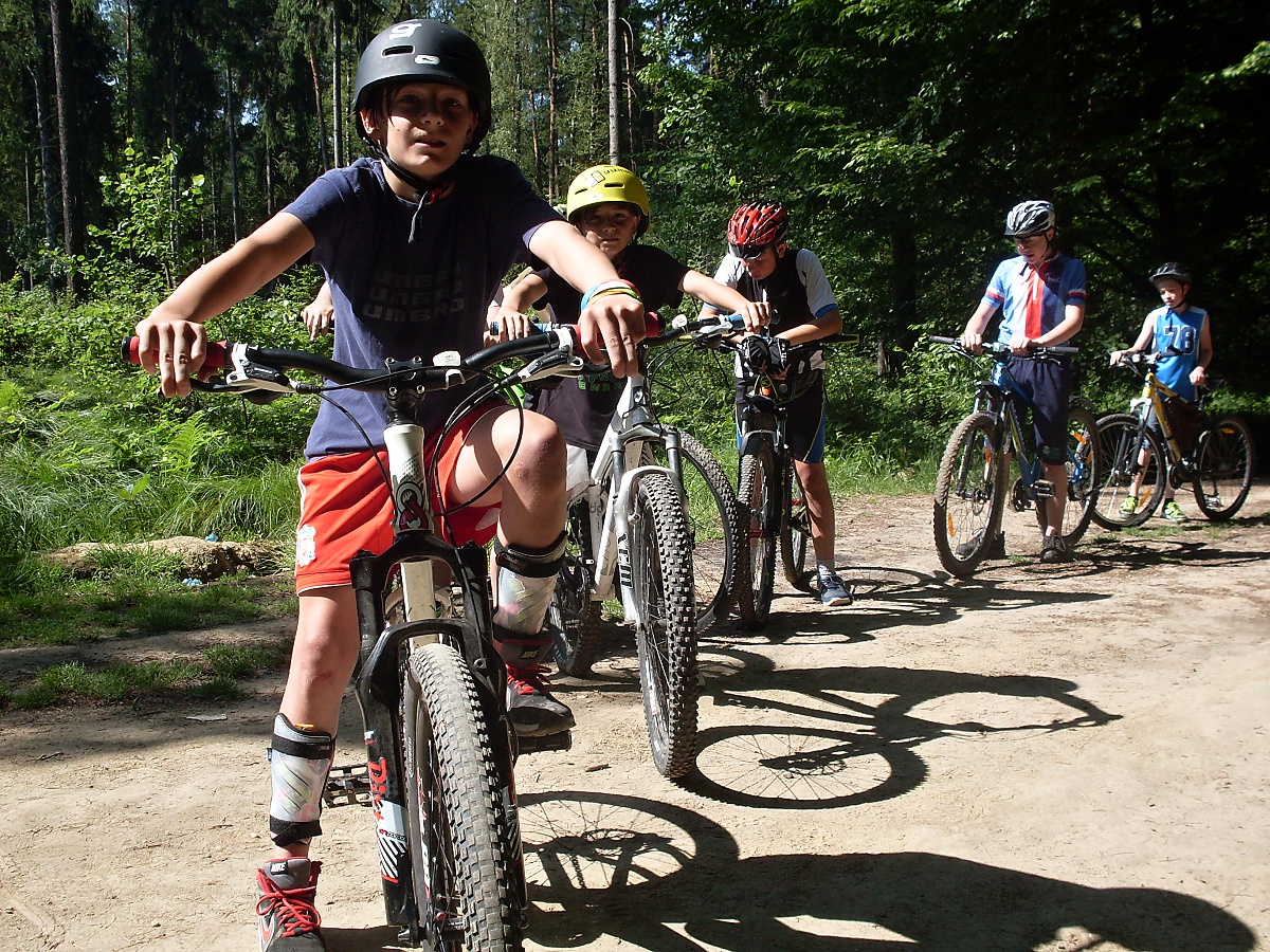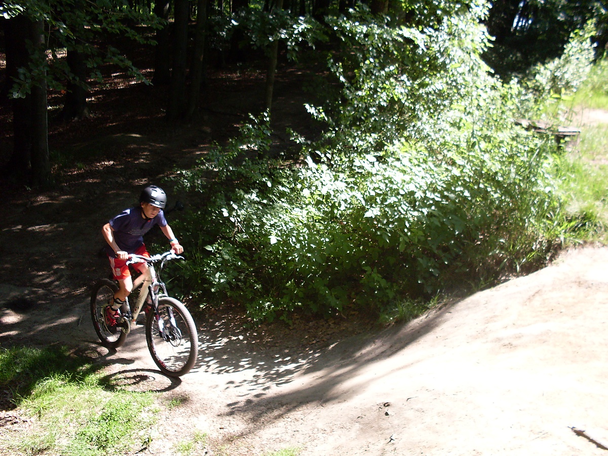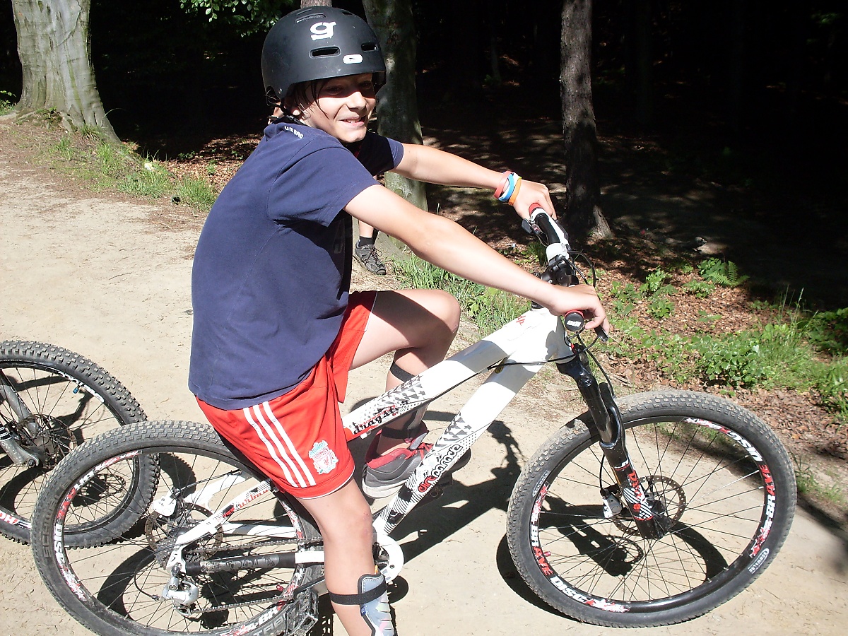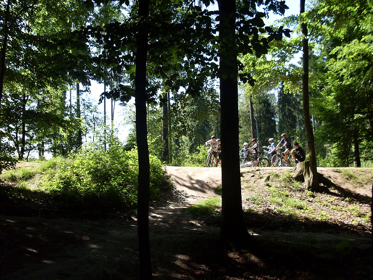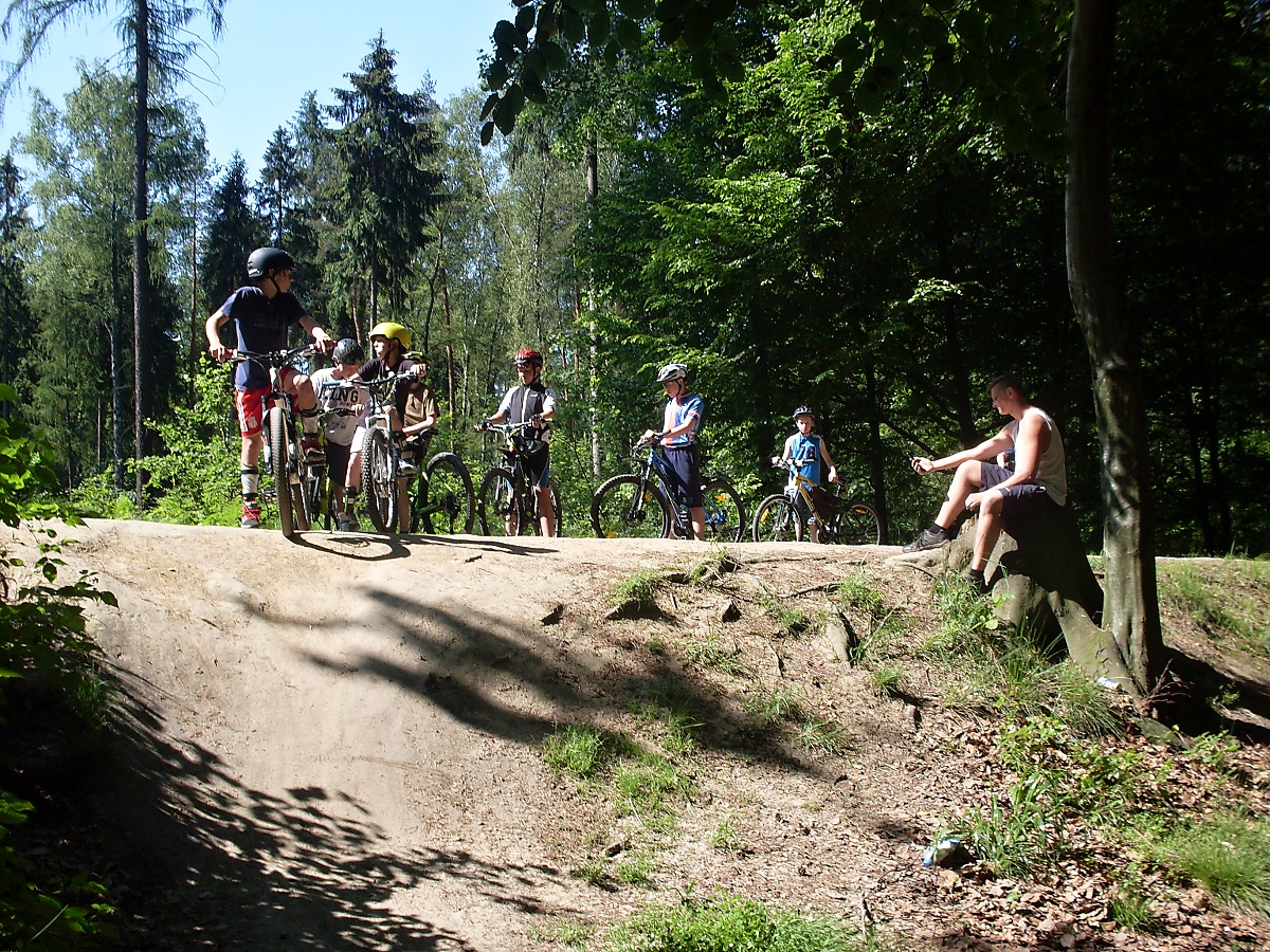 Těsně u hraniční čáry, dva tři kroky a jsi v cizím státě, odkládáme kola a přilby. Část oddílu se napájí, jiní jdou dále a vytahují svačinu, protože jsou notně vyčerpaní. Odcházíme na obhlídku tratě. Po projití „skokanské“ části, kdy se diskutuje o jednotlivých překážkách a nejrychlejším možném projetí, se Mona vrací zpět ke kolům na hlídku, ostatní pokračují až do cíle a vrací se zpět. Následuje druhá část – trénink. jednotlivci sjíždějí ze startovní hrany mezi stromy a skoky a klopené oblouky. A vzápětí se škrábou nazpět a zkouší jiný směr. „Všichni na start!“