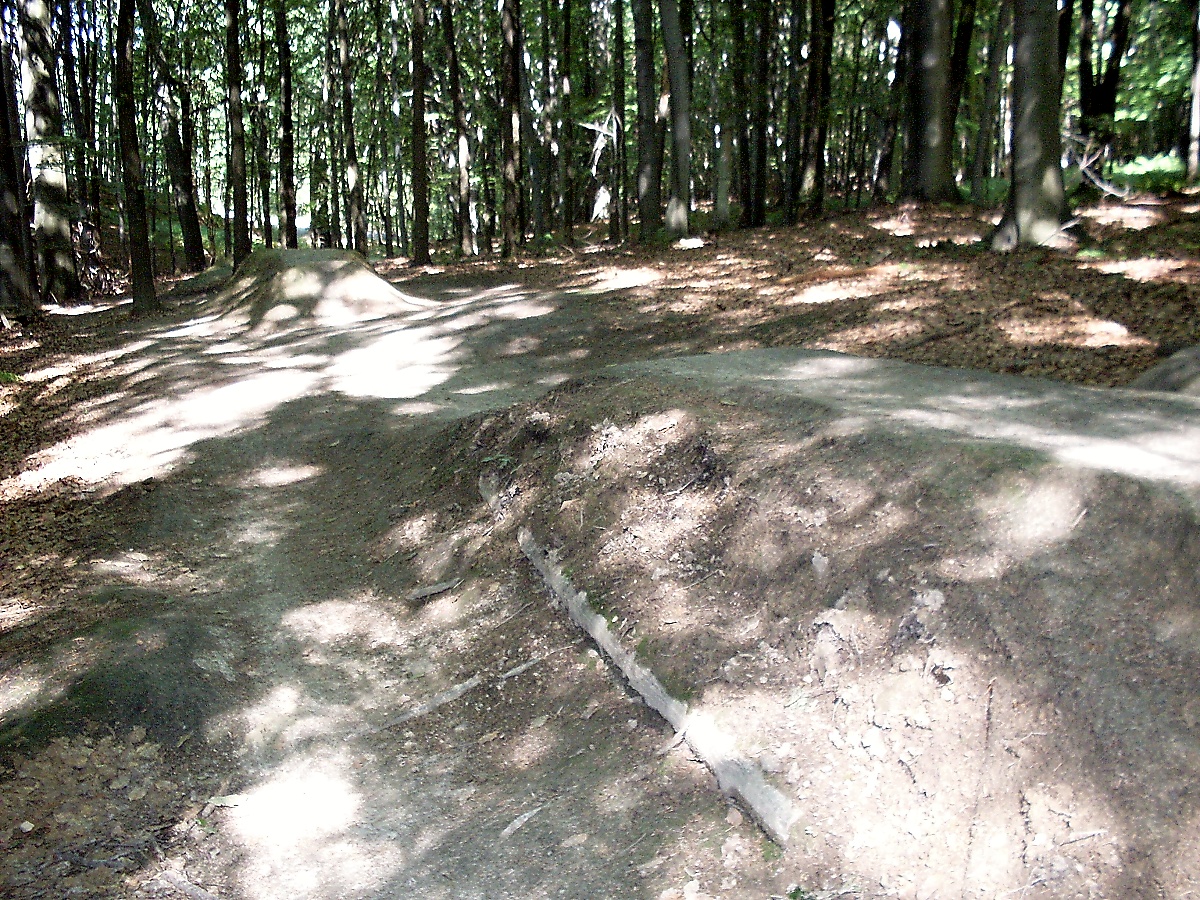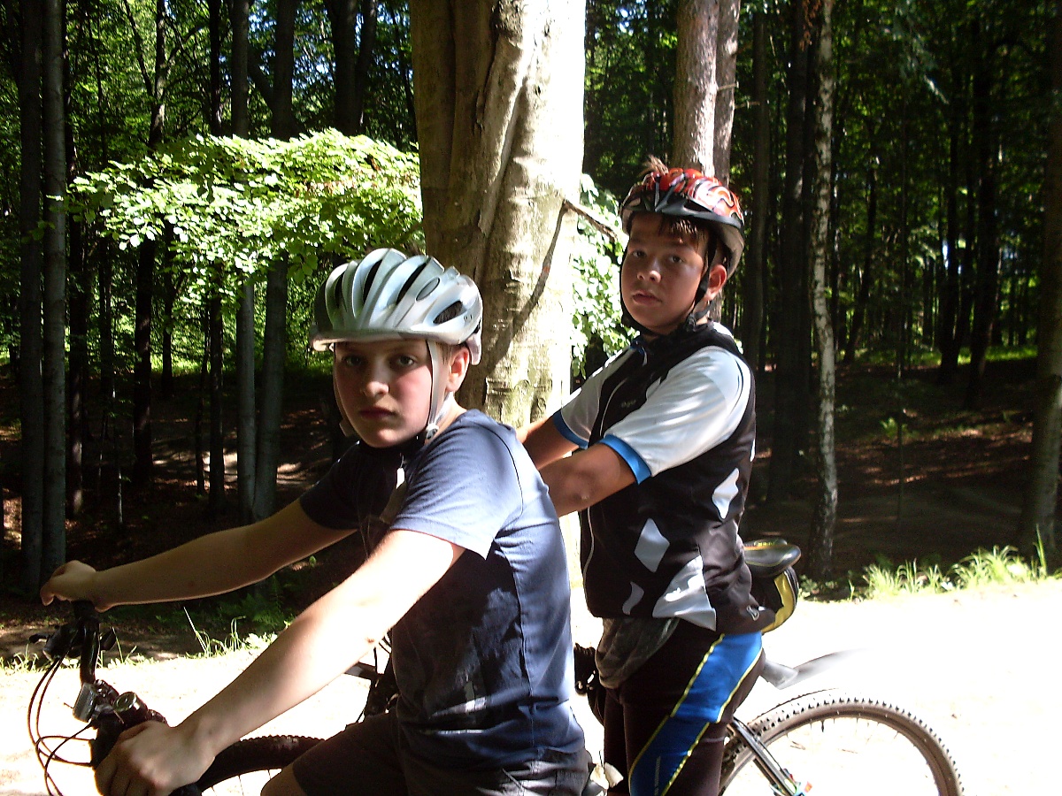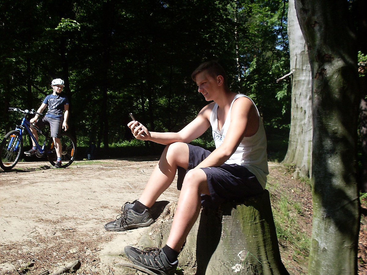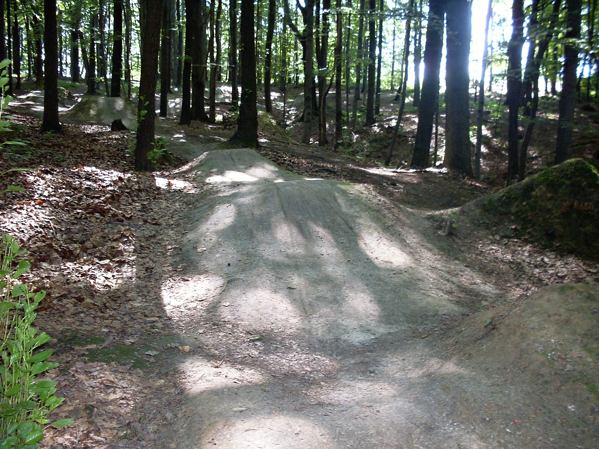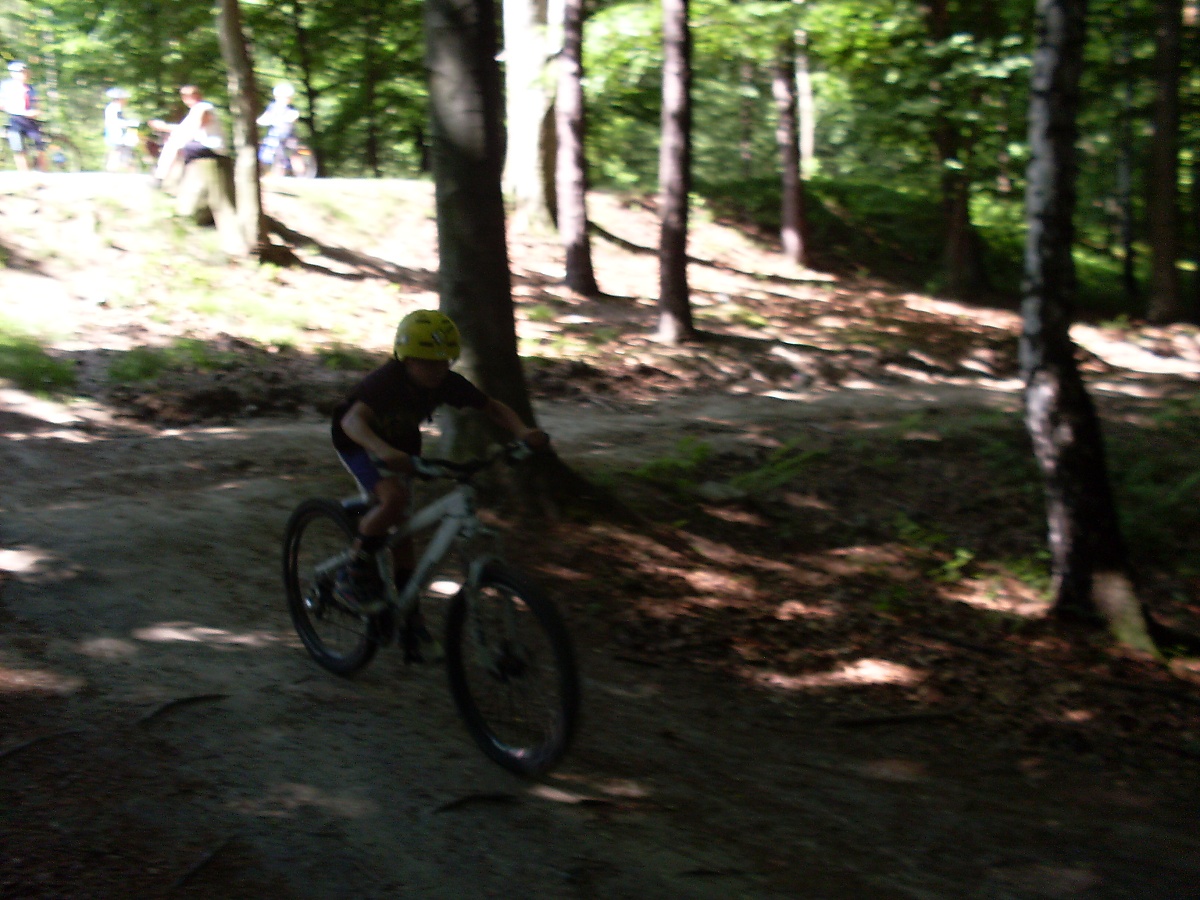 Těsně u hraniční čáry, dva tři kroky a jsi v cizím státě, odkládáme kola a přilby. Část oddílu se napájí, jiní jdou dále a vytahují svačinu, protože jsou notně vyčerpaní. Odcházíme na obhlídku tratě. Po projití „skokanské“ části, kdy se diskutuje o jednotlivých překážkách a nejrychlejším možném projetí, se Mona vrací zpět ke kolům na hlídku, ostatní pokračují až do cíle a vrací se zpět. Následuje druhá část – trénink. jednotlivci sjíždějí ze startovní hrany mezi stromy a skoky a klopené oblouky. A vzápětí se škrábou nazpět a zkouší jiný směr. „Všichni na start!“