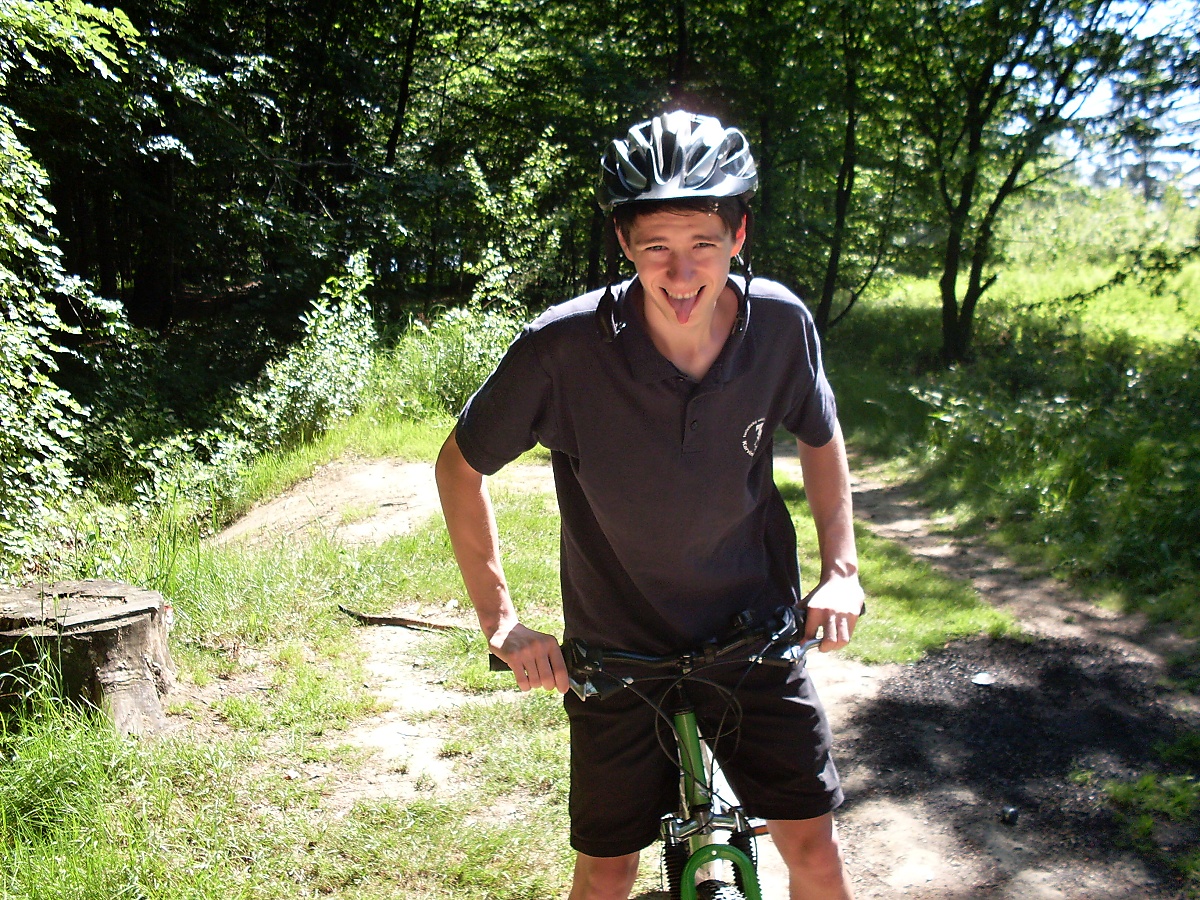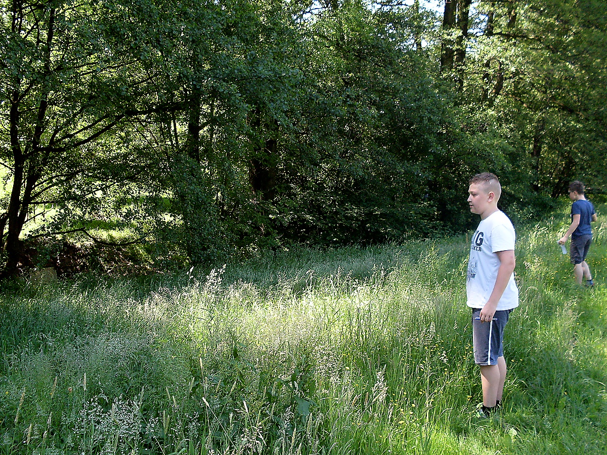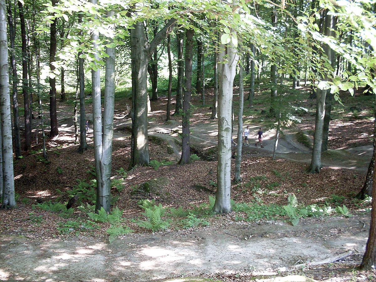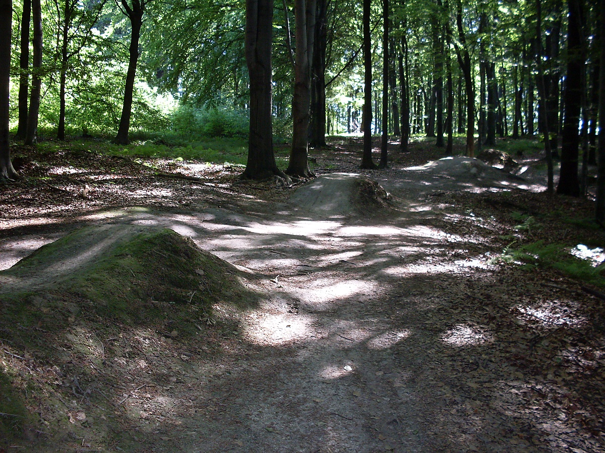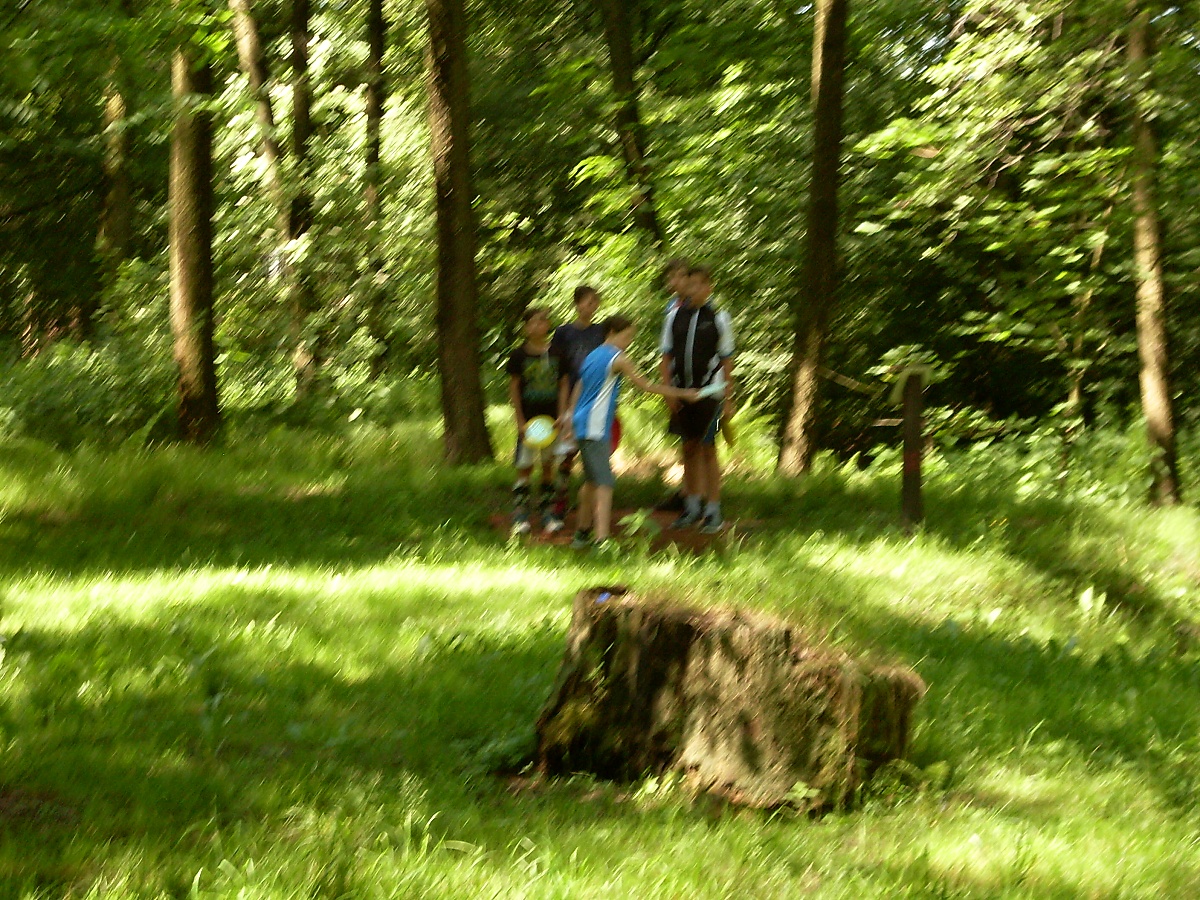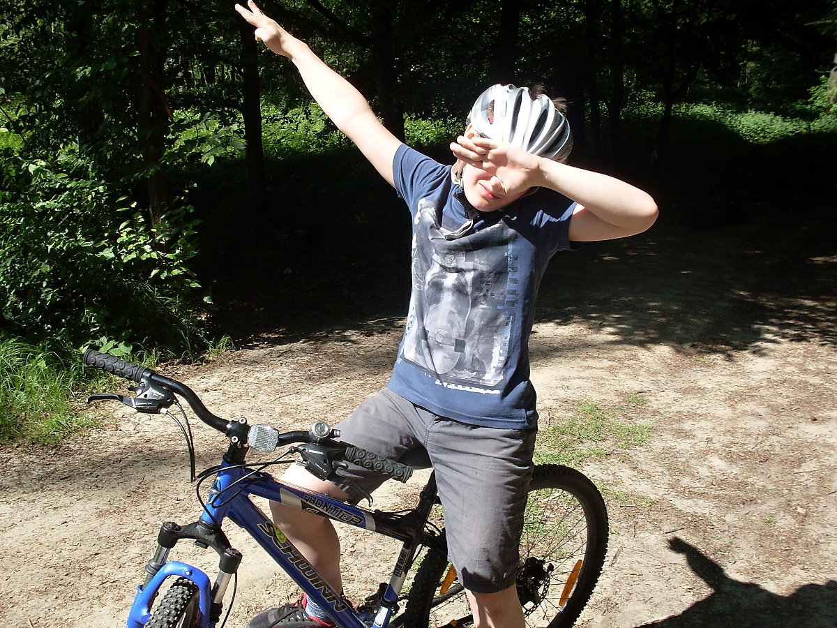 Těsně u hraniční čáry, dva tři kroky a jsi v cizím státě, odkládáme kola a přilby. Část oddílu se napájí, jiní jdou dále a vytahují svačinu, protože jsou notně vyčerpaní. Odcházíme na obhlídku tratě. Po projití „skokanské“ části, kdy se diskutuje o jednotlivých překážkách a nejrychlejším možném projetí, se Mona vrací zpět ke kolům na hlídku, ostatní pokračují až do cíle a vrací se zpět. Následuje druhá část – trénink. jednotlivci sjíždějí ze startovní hrany mezi stromy a skoky a klopené oblouky. A vzápětí se škrábou nazpět a zkouší jiný směr. „Všichni na start!“