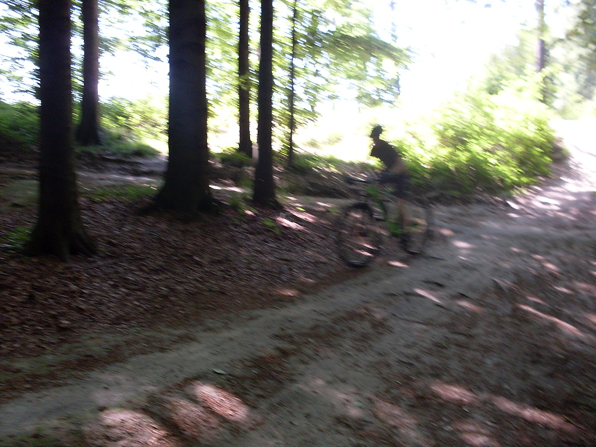 Synchronizujeme si se Švejkem časomíru. Není zde nikdo z Modrých racků, kdo by se toho chopil. V ruce stopky, aby se v kapse nezastavili, valím si to zpátky po lesní cestě, odbočuji vlevo a pokračuji až do míst, kde trailerek vybíhá z po mezi stromů na zpevněnou cestu. Už vidím proplétat se mezi stromy prvně jedoucího Sébu. Seskakuji z kola, stopky jsou v pohotovosti, kolem mě prolétává Séba a smykem stáčí kolo. Na to, že vystartoval až minutu po mně, je zde velmi rychle. Uff! Tak, tak jsem to stihl.