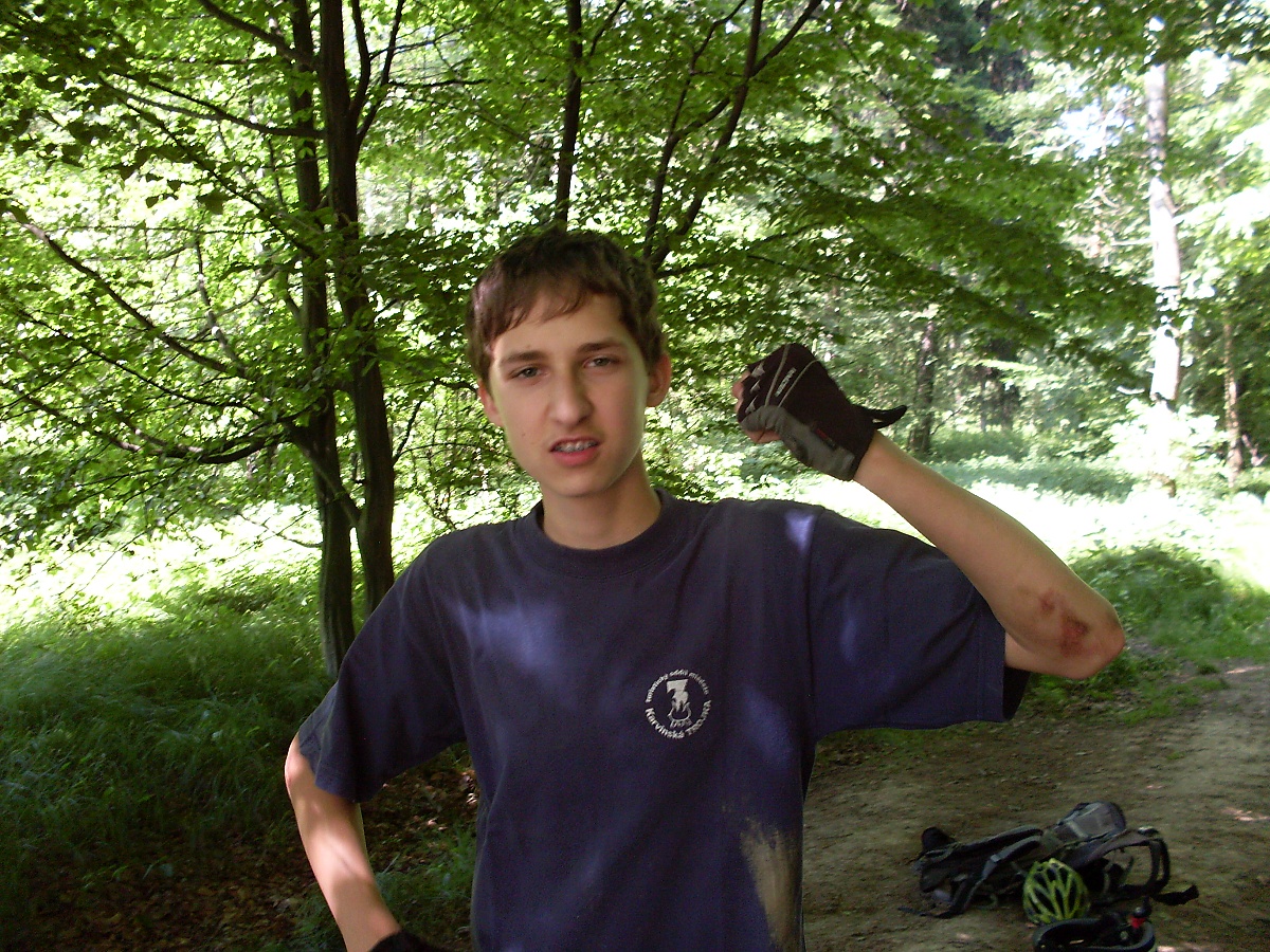 Jiný výtečník, Startér, mě taky hezky vyděsil. Při dojezdu do cíle mi dychtivě oznamuje, že má „rozseknuté“ koleno. „Hm, kdybys měl rozseknuté koleno, asi bys dost těžko byl schopen jakéhokoliv pohybu!“ snažím se ho uchlácholit a zkoumám jeho nohu. Malá ranka po kopanci „trailovým“ pedálem na holení kosti. Startér se dožaduje ošetření. „Tak si to nasliň, sliny staví krev!“, uklidňuji ho. Startér mé rady nedbá a v depu vyhledává zdravotníka Švejka a nechává si kolem nohy omotat obvaz. Ten je po chvíli umolousaný, přestává plnit svoji funkci a sesmekává se až ke kotníku. Ale Startér je spokojený. Byl ošetřen. (Jen na vysvětlenou: Séba a Startér jako jediná měli holenní chrániče!)
