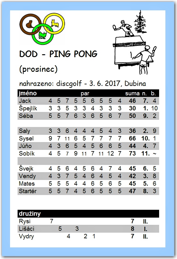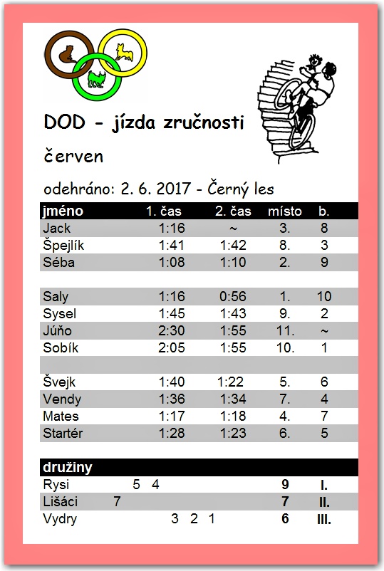 Po příjezdu na start i ostatní závodnicí žadoní, abych jim alespoň naznačil – „Mates, migej ode mě!“, jak si vedli v prvním kole. Opět synchronizace časomíry. Ale tentokrát se vydávám do cíle po trati. Tak tak, že mě nedostihl Séba, řítící se za mnou s minutovým rozestupem. A už to frčí. Akorát v okamžiku kdy hodlám zapsat čas Jacka, zjevuje se místo něho Švejk a huláká, že si startovní pozici vyměnil ze Salym. „A kde je Jack?“, ptám se. Panda se vyvrátil na trati, spadl z kola – přeletěl přes řidítka, či kýho šlaka? a odbelhal se na start. Zde potom všem zájemcům ukazoval bolístky – lesní lišaje na loktech.