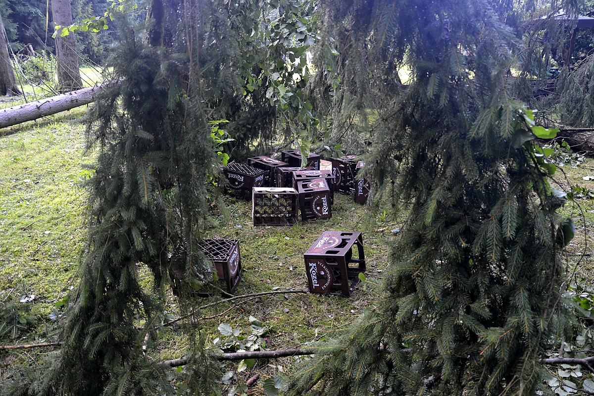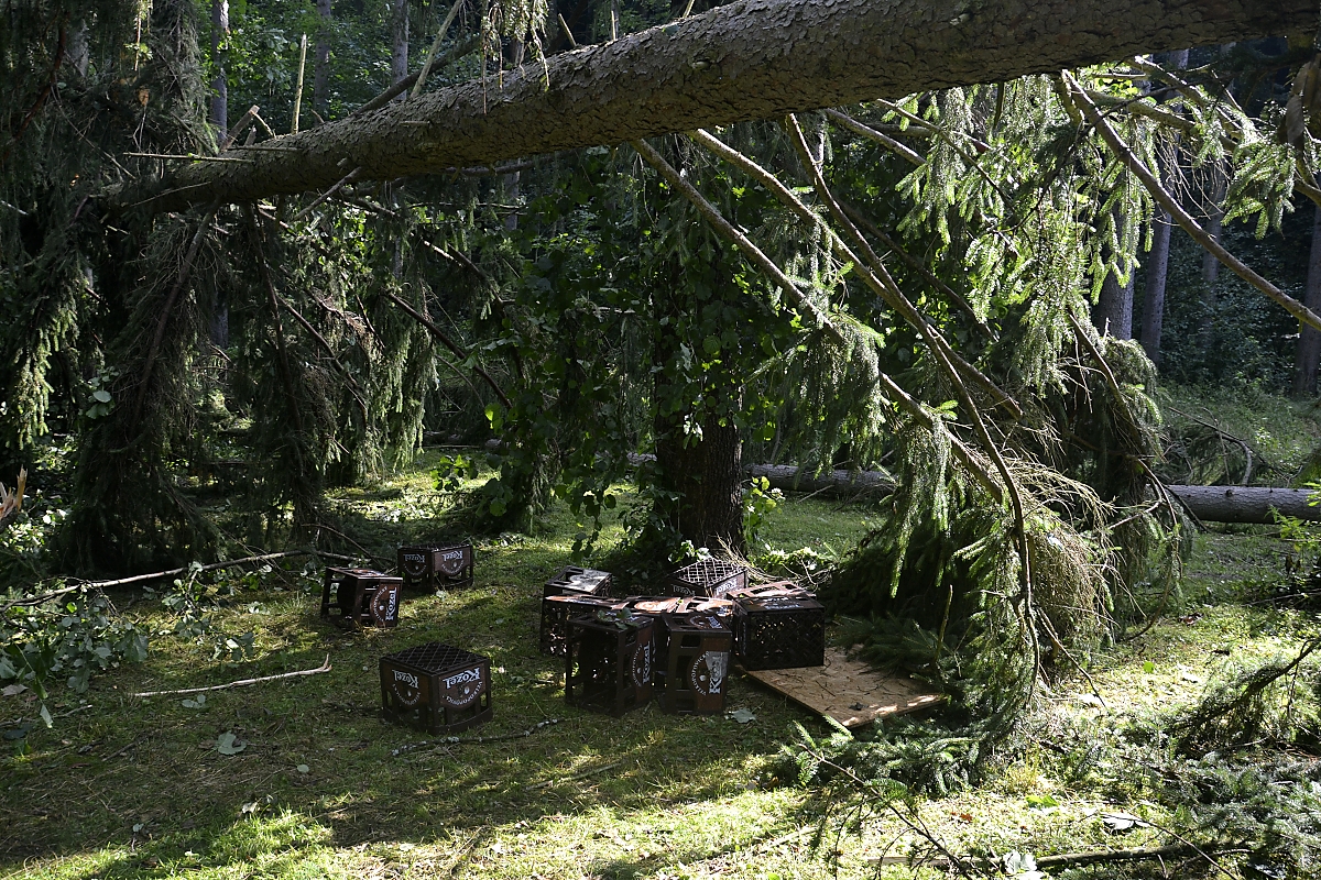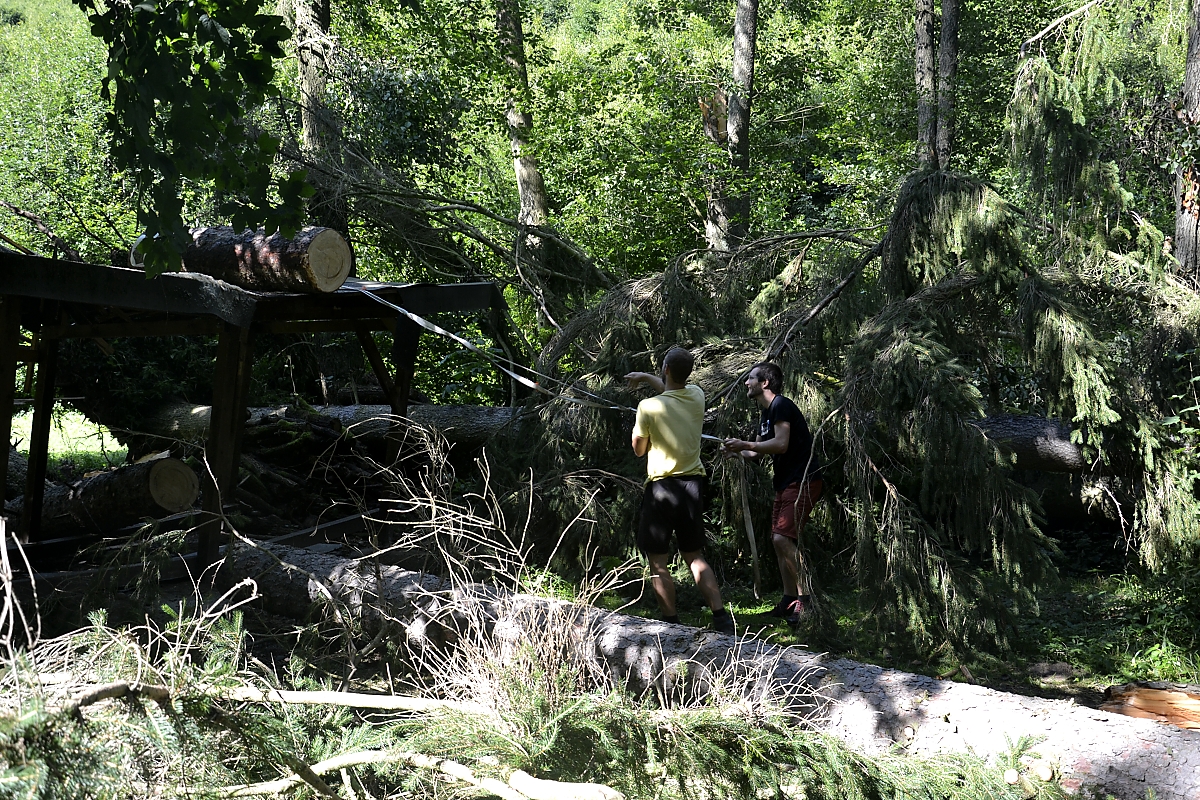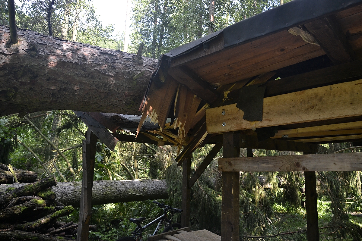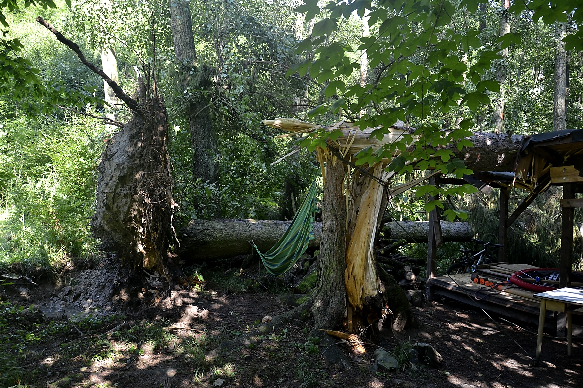 Záběry pořízené bezprostředně po několika minutové větrné smršti, doprovázené vodní clonou, vypadají hrůzně, ale ne, nelekejte se! „Živá síla“ nebyla tknuta. Osazenstvo tábora ušetřeno! (I když poslední čtyři táborníci, odvazující gondolu z lanovky, prchali z lesa v okamžiku, kdy kolem nich praskaly kmeny stromů a proti nim se zvedaly koláče kořenových „balů“ stoletých velikánů).
