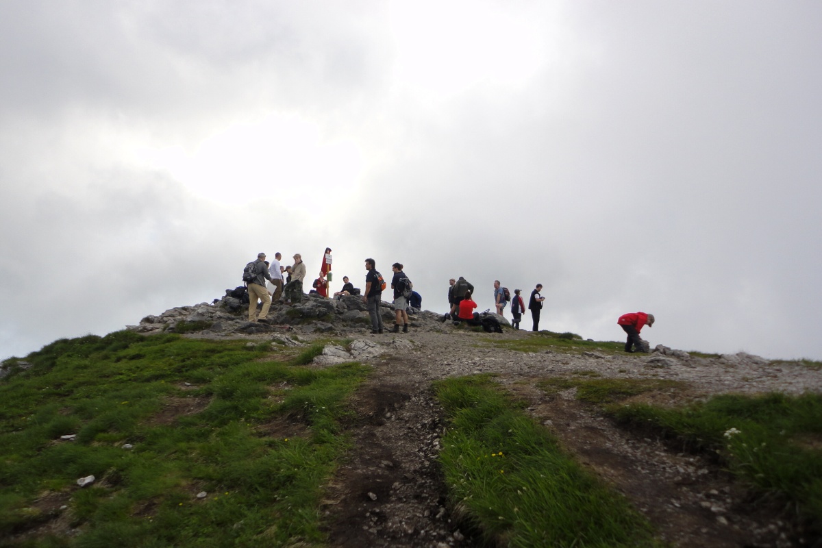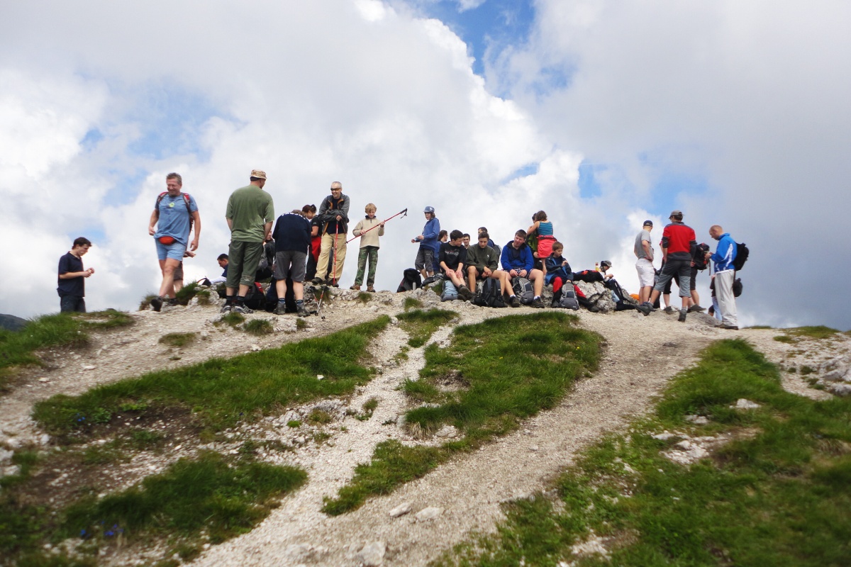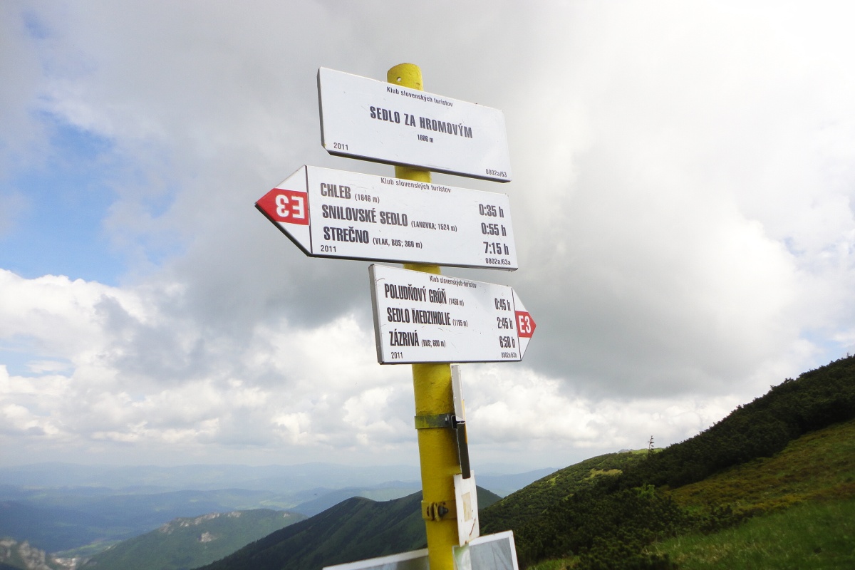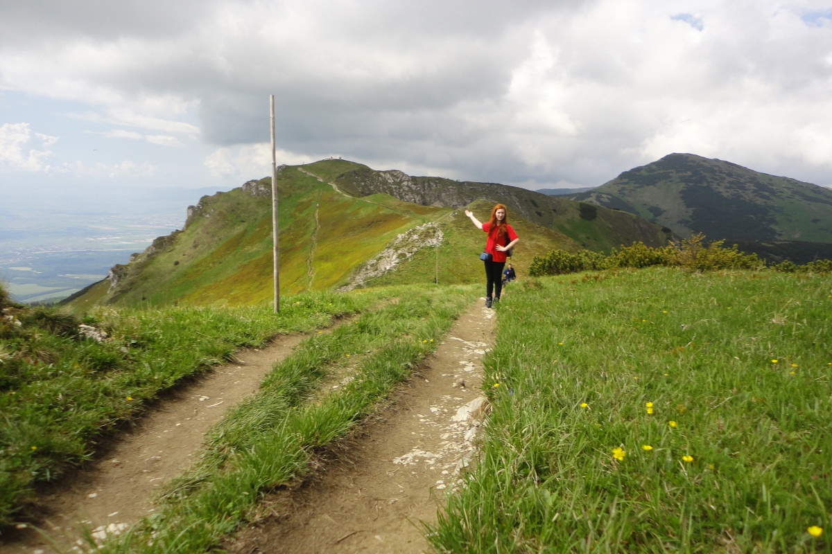 Lála zrovna tento týden odevzdala ve škole herbář, tak se rozplýváme u každé kytičky. Všechno dokumentujeme, nad vším se radujeme. Kolem jsou koberce hořce jarního. Stále zíráme na vrchol Chlebu, je zahalen peřinou mraků. Jasně jde vidět stezka na Hromové a dál na Poľudňové steny (psáno slovensky), už se po ní pohybuje několik figur poutníků. Vrcholy Rozsutců jsou zahaleny oparem. Ani jsem si nevšiml, že se nám oddíl ztratil. Nahoře jsme dostali od Antka kartáč, že takovýmto tempem se nikam nedostaneme.