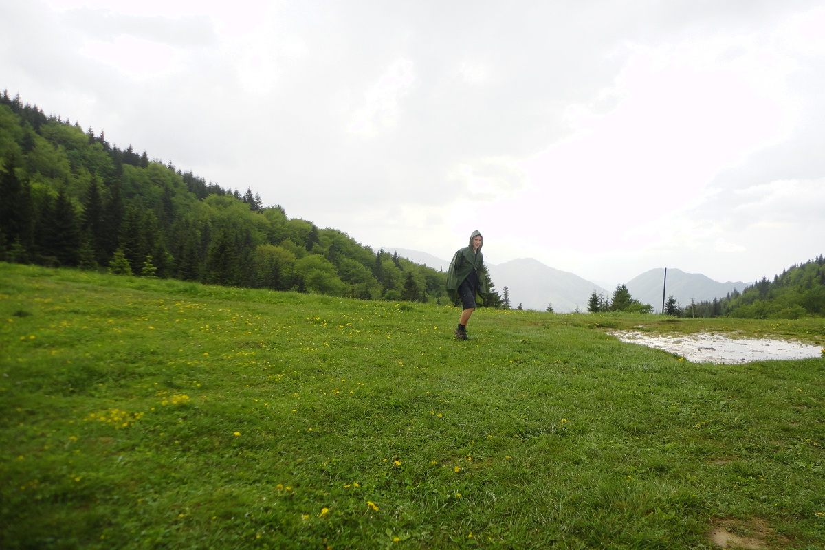 Cesta úbočím Stohu byla hotovým martýriem. Tak rozblácenou stezku jsem zde ještě nezažil. Dopředu utekla čtveřice, ta se dává do řeči s nějakými zkušenými českými horaly, jdoucí proti nám. „Hoši, hotový Saigon!“, varují nás. Pravdu měli ti chlapci. Zahřmělo, to hrbatí zlotři nad Obšívankami valí dřevěné sudy. Doufám, že bouře nechytne naší vrcholovou skupinu. Proplétáme se houštím, přes kamenné plotny, bezedným blátem, zakopáváme o spletité kořeny. Alespoň přestalo pršet, jen drobně pokrapuje a dokonce i sluníčko vylézá. Na stezce jdou zřetelně rozeznat stopy vysoké zvěře. Z lesa na Medziholi vycházíme děsně zablácení. U přístřešku v sedle Medziholie je několik turistů. Zrovna odchází. Padáme na lavičky, dopíjím poslední čaj. Doráží Sněžka, první dobyvatel Stohu. Po chvíli se z lesa vynořuje další hrozen poutníků. Jsou mezi nimi účastníci obou skupin a nějak slovenská třída nezletilých.