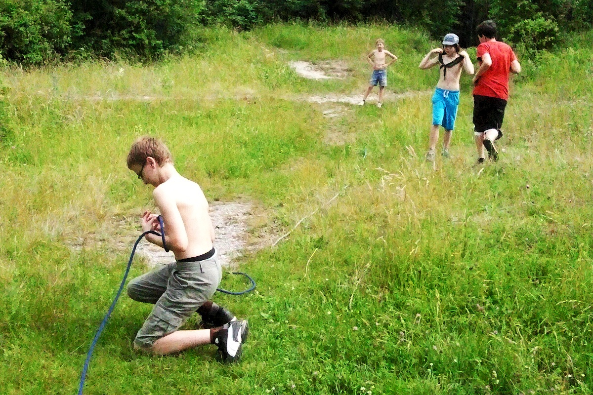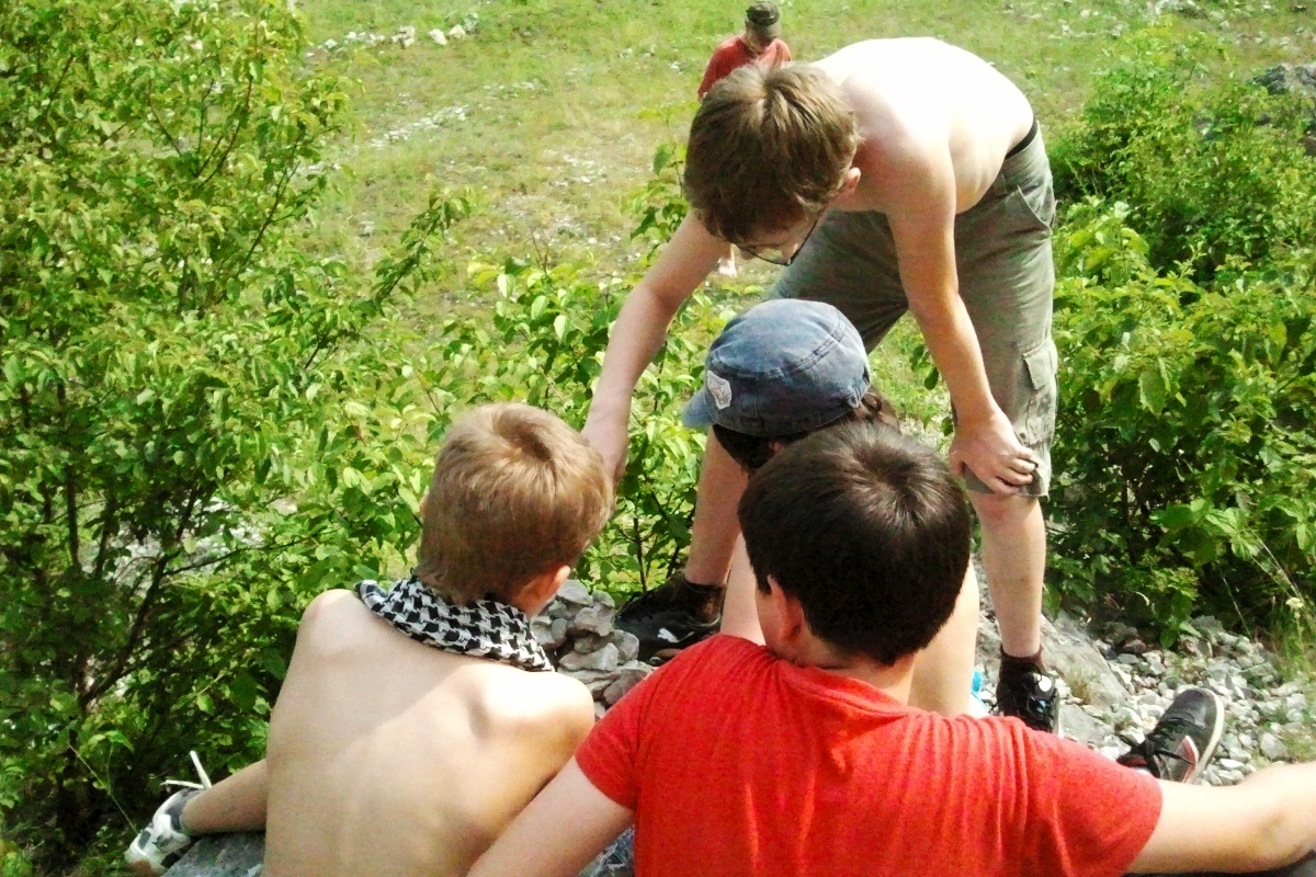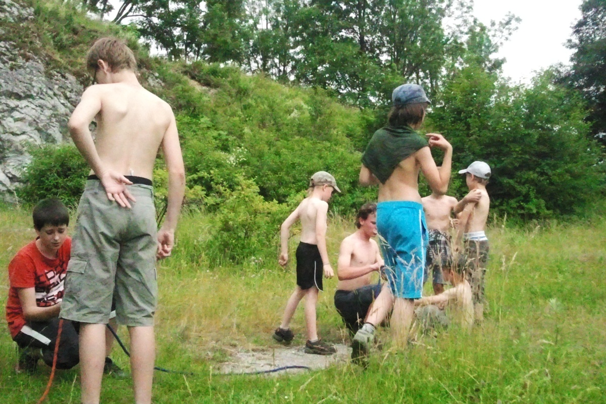 Odhazujeme loapy, vytahujeme oběd a převlíkáme se. Lála se marně snaží oživit fotoaparát. Baterie je úplně vyšťavena, asi dostane „nůž do břicha“ (Lála – za ty fotoorgie ve vlaku, kdy napráskala na 400 fotek!) Mladší hoši pátrají v jezírku po čolcích a žábách. Protože hrozí, že se z nich někdo nechtěně vykoupe, musím je odvolat. Odehráváme několik závodů. Prvně signalizace. Protože z Rysů je zde pouze Dalmi, posiluje Lišáky a body nejsou započítávány do ozanabu. Členům vítězné družině jsou tak přičítány známky. Pak sbíráme kameny na čas. Vítězí Tomáš a Sněžka – oba mají shodný čas. Třetí je Tříska. Následuje „fousatý závod“ kombinované uzlování. Družiny jsou opět zaskočeny. Vydry ve dvou kolech nakonec dosahují lepšího času. Pod skalní stěnou stavíme z kamenů nejvyšší věžičku. Vydry jsou opět úspěšnější. Zouváme si boty a kráčíme k tábořišti naboso. Posledním závodem je hod talířem. Zde jsou lepší Lišáci, kdy Dalmi svým hodem přehodil celé Vydry. Jede se dvakrát za sebou po stezce kolem jezírka.