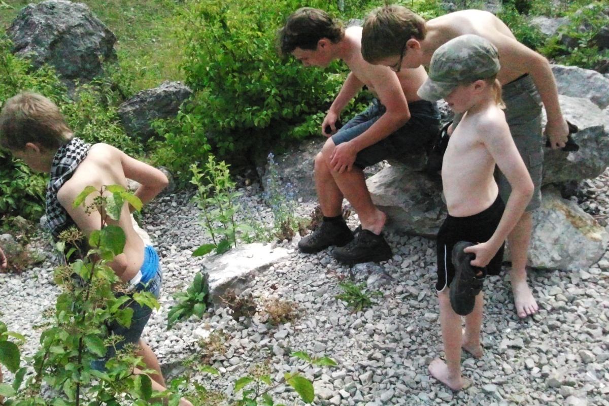 Balíme a přesouváme se do sousedního lomu. Přecházíme po hraně kolem skály. Pod námi se ozývají bubny – tam-tamy. Kdysi zde bývalo škvárové fotbalové hřiště, dnes je zde botanická zahrada. Na jižní straně lezou po vápenci lezci. Chvíli je pozorujeme – cinkání karabin je nám povědomé. Procházíme si zahradu, i zadní jezírka, nakukujeme do propasti. Ne, jeskyňáři dnes zde nejsou. Vracíme se k bráně a pak už zvolna, mezi rodinnými domky scházíme na hlavní silnici. Je stále horko. A tak s povděkem bereme občerstvení v zahradní restauraci před křižovatkou.
