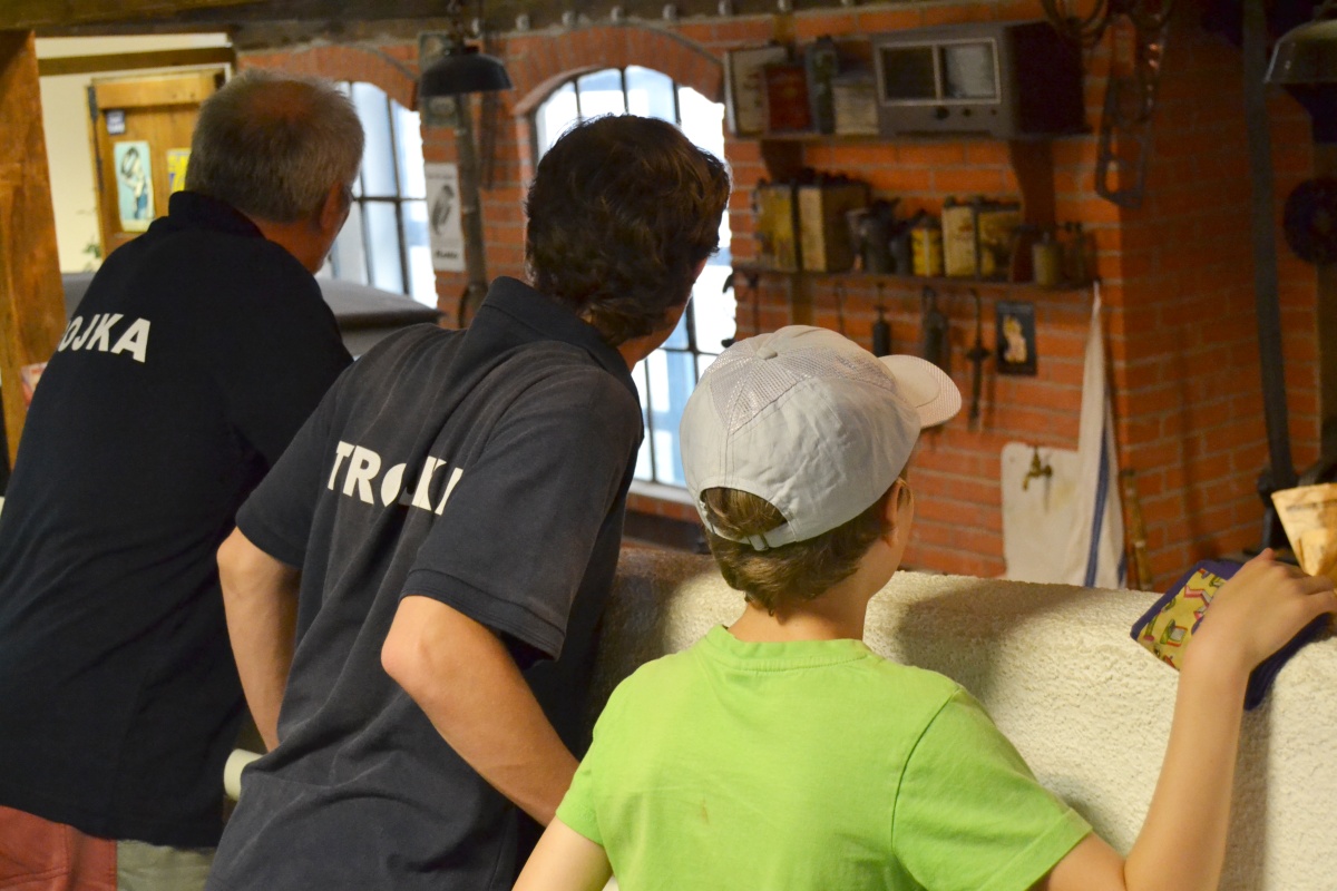 Zatímco jsem, dle navigace slečny v recepci doplnil peněženku, oddíl se vycapil přímo před vchod muzea, rozbalil papírové ubrousky a počal stolovat. Přesně tak, jak jsem si to nepředstavoval!! Inu, vesnice zdraví město! V cuku letu dojídáme a jsme prosmýknutí kolem fenomenální „Slovenské strely“ (červený „vlak“) – samozřejmě, že s nezbytným výkladem, výpadovkou k usedlosti Ignáce Šustaly. To je ten chlapík, co založil výrobu kočárů a následně smontoval i již výše vzpomínaného „präsidenta“.