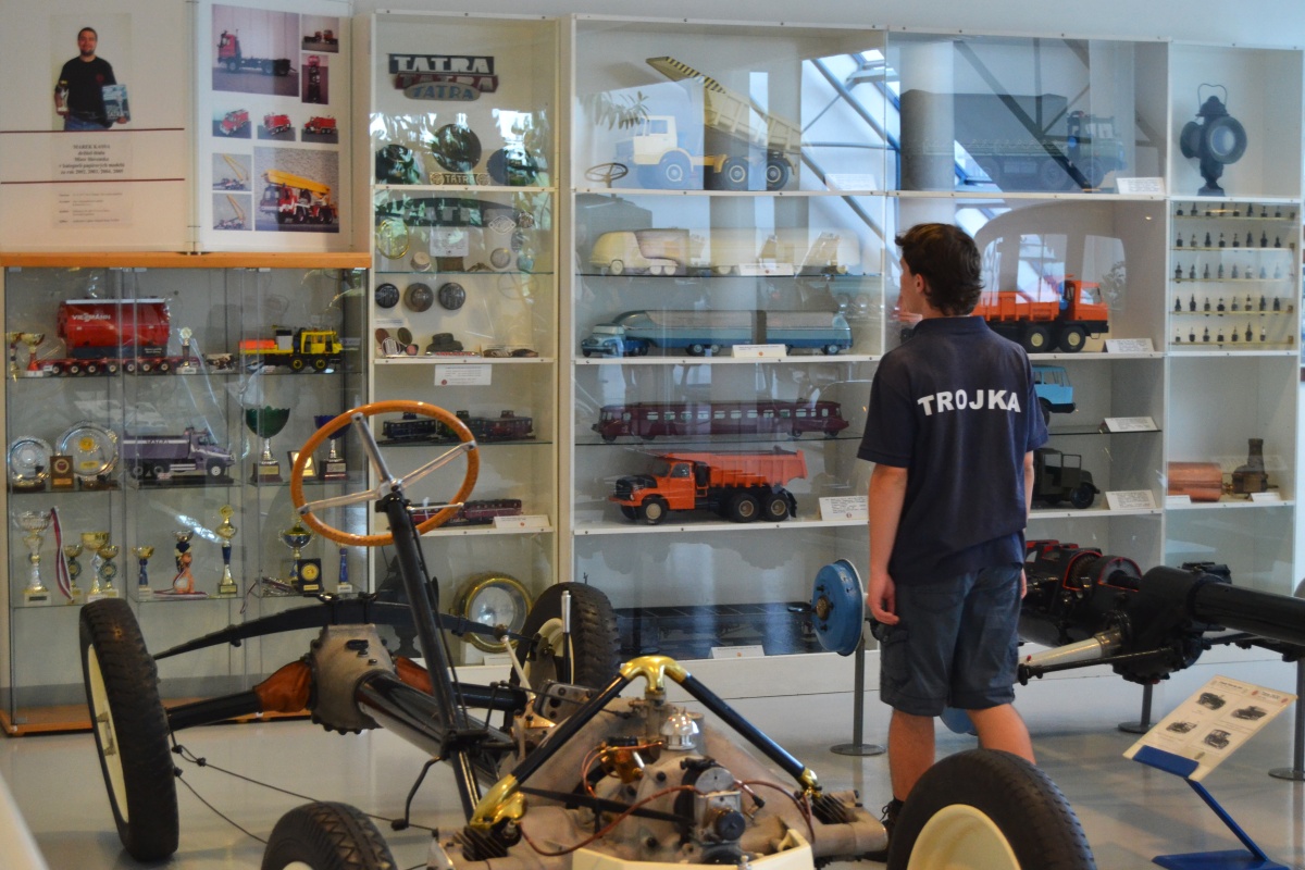 Slečna v recepci mne nemile překvapila, když po mně požaduje 740 Kč. To ještě Sněžka a Lála ukazuji své studentské průkazy. Tak mne Sněžka založil, odkládáme si loapy do šatny a vyrážíme do expozice. Trojčata se točí kolem Lály a okamžitě naskakuji do vystaveného veteránu – je k tomu určen – aby se v něm zvěčnili. Dál už kráčíme každý dle libosti. Lidi zde naštěstí není mnoho. Prolézáme jednotlivé expozice, abychom se nakonec sešli u expediční Tatry T – 138 do Lambaréné. Část oddílu nadchly modely, jiné závodní auta, mne opět Tatra 77, pár výtečníků si pouštělo naučné obrazovky v jazyce německém a maďarském, a když jsme si to všechno prohlédli, lavičky opucovali a exponáty s cedulkou „Nedotýkejte se!“ osahali, setkali jsme se u šatny. Zrovinka do expozice vkráčela početná skupina Španělů. Jeden ze starších kustodů muzea hovoří anglicky, načež tlumočnice zájezdů vše promptně překládá do španělštiny.