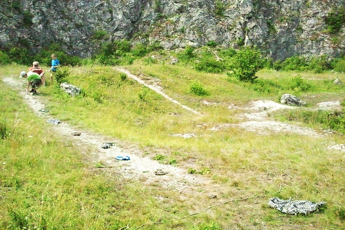 Vycházíme na hranu lomu Kamenárka. Uchvacující pohled. Pod námi jsou dvě patra opuštěného lomu. Dole je kolem lesíka malý hájek. Bokem, mezi záplavou hvozdíku kartouzku scházíme na první patro a potom dolů k jezírku. Je zde nějak partička, ale naštěstí jsou už na odchodu.